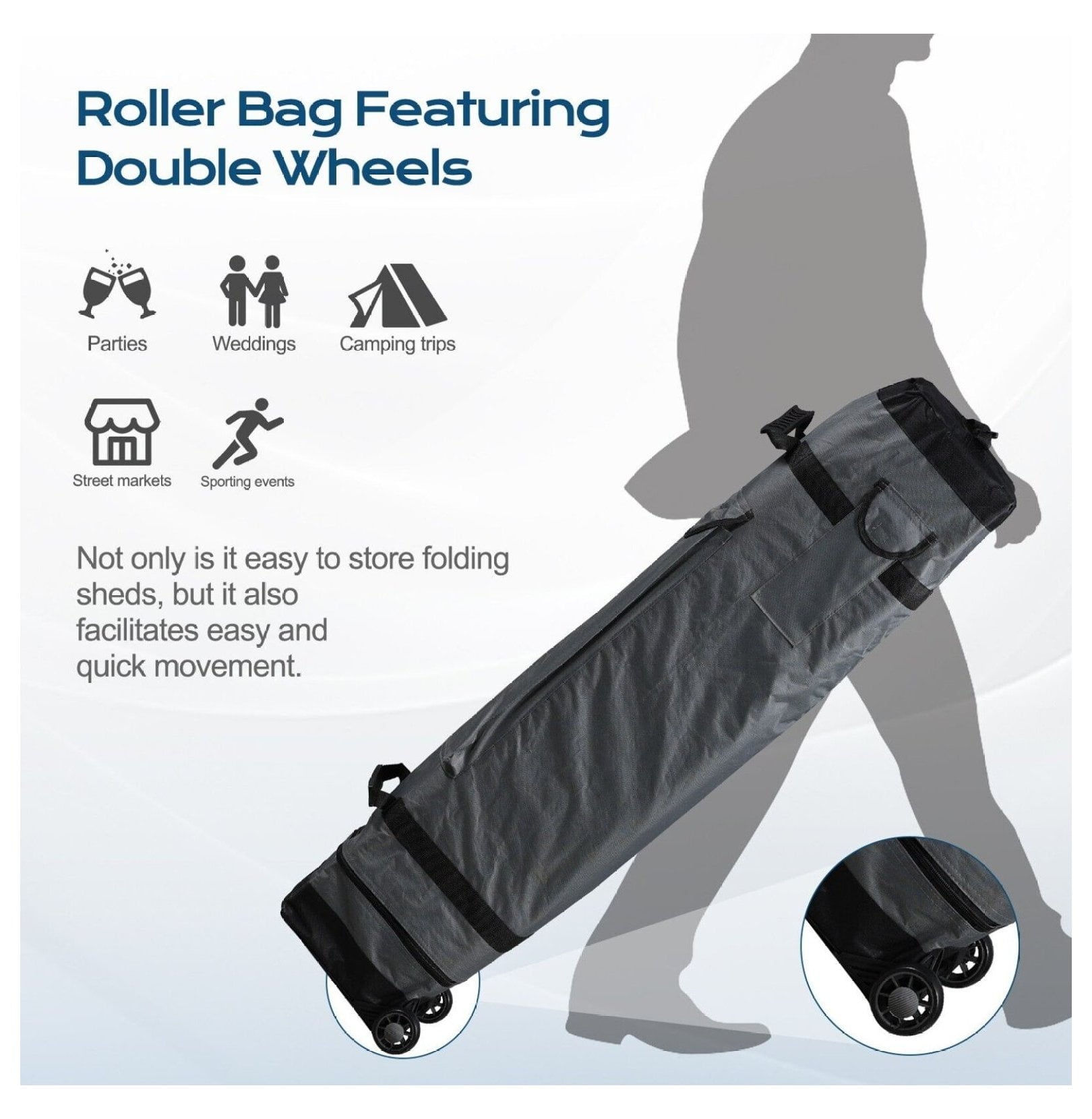 - Versatile and Portable: Designed for convenience, the canopy comes with a roller bag featuring double wheels for effortless transportation. Ideal for a variety of occasions such as parties, weddings, camping trips, street markets, or sporting events, this portable canopy ensures you have shade wherever you go.