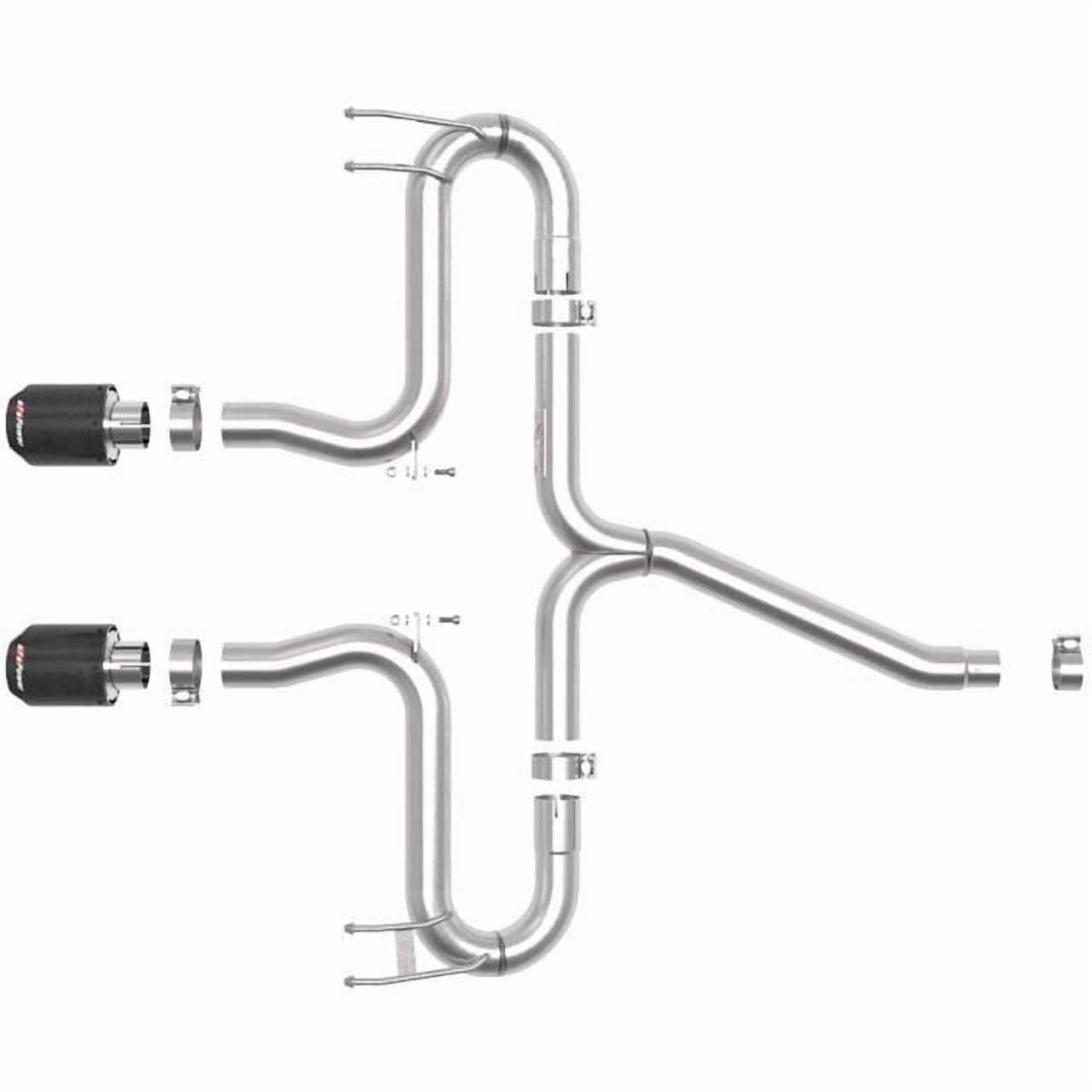 Dual 4-1/2″ Diameter Carbon Fiber Exhaust Tips: Finishing off this exhaust system are dual 4-1/2″ diameter carbon fiber 304 stainless steel clamp-on exhaust tips.