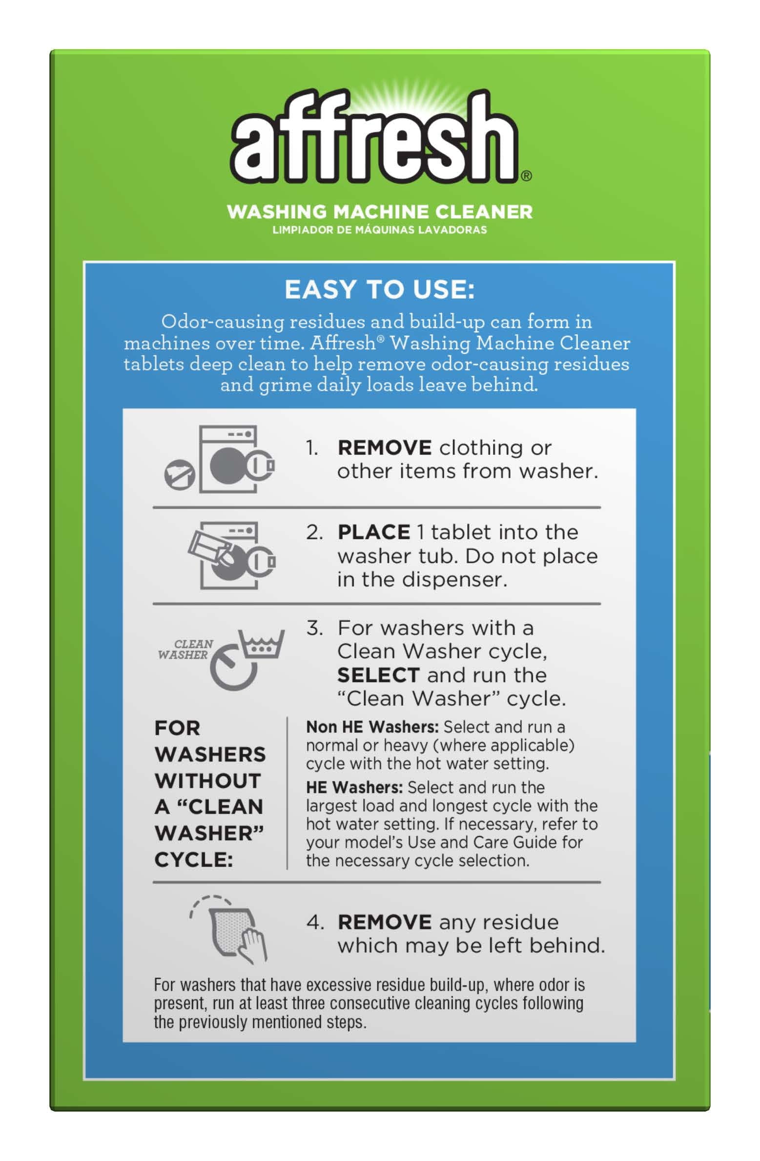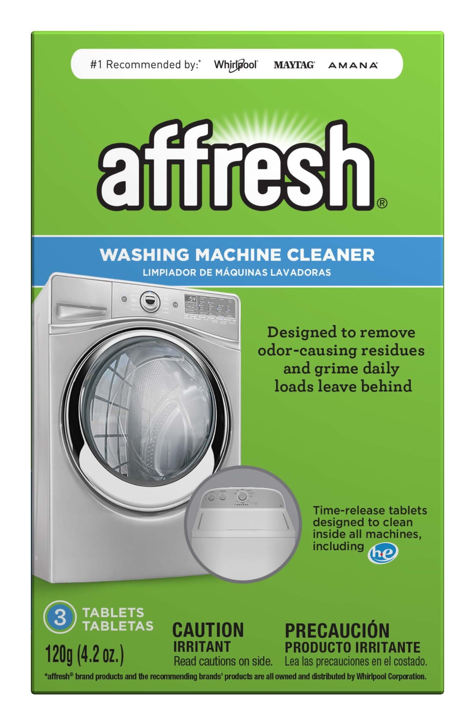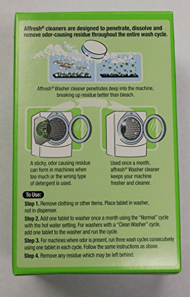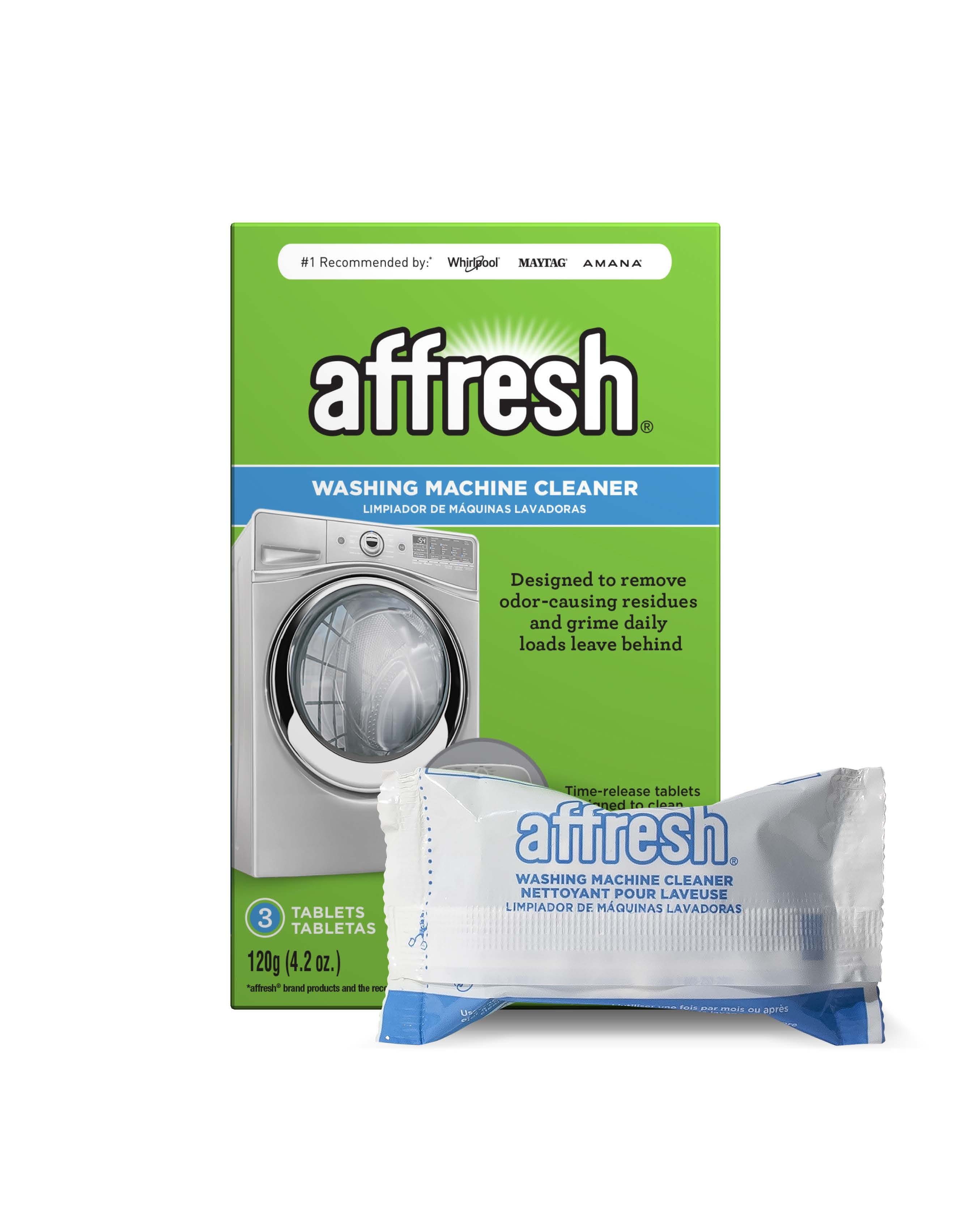 Affresh Washer Cleaner removes and prevents odor-causing residue that can occur in all brands of HE. Affresh cleaner is a formulated, slow-dissolving, foaming tablet that get under residue, breaks it up and washes it away, leaving the washer smelling fresh and clean. Simply place 1-tablet in the wash basket (without clothes) and run a Normal Cycle (hot option) or Clean Washer Cycle.Affresh 3-Count Washer Cleaner (Pack of 2)