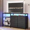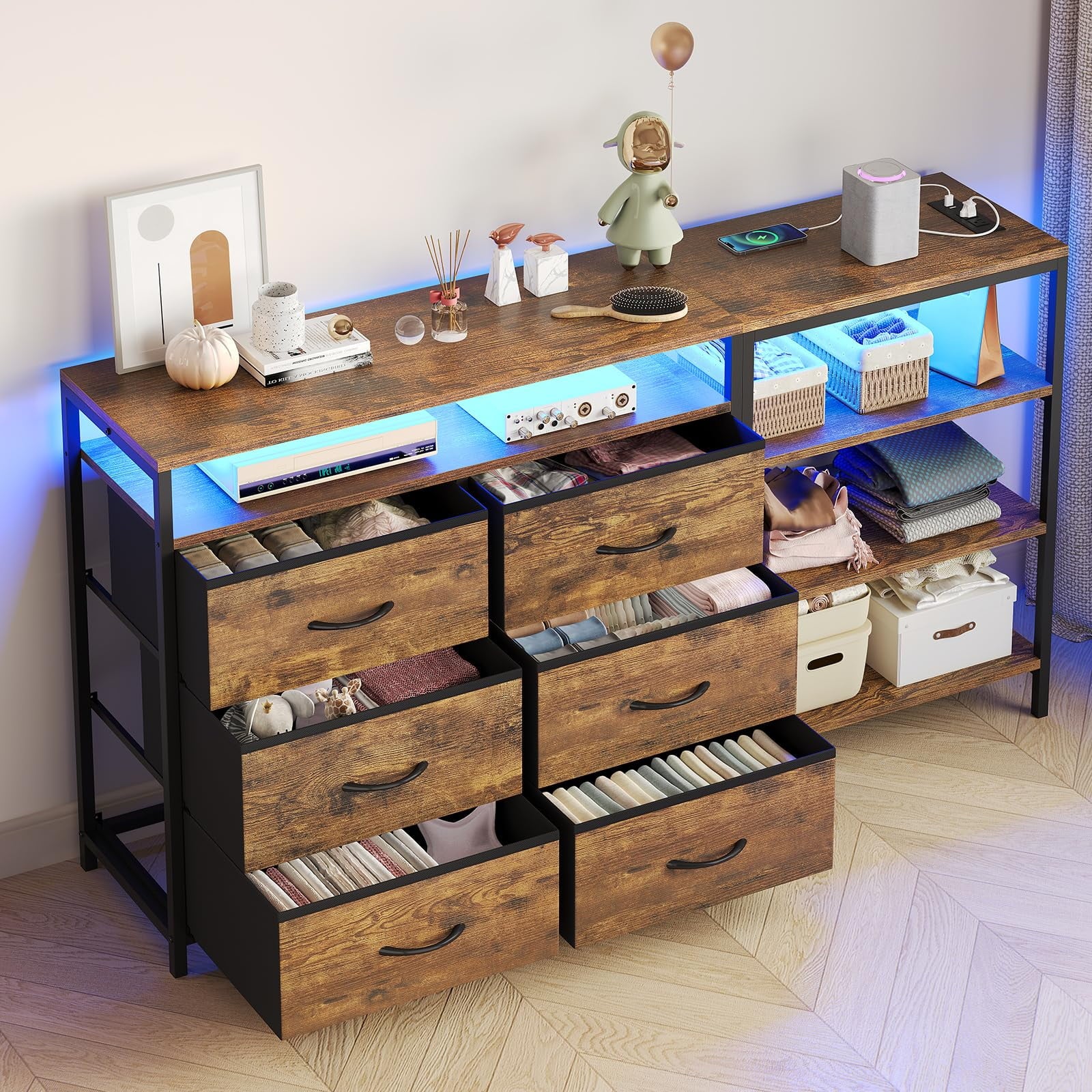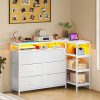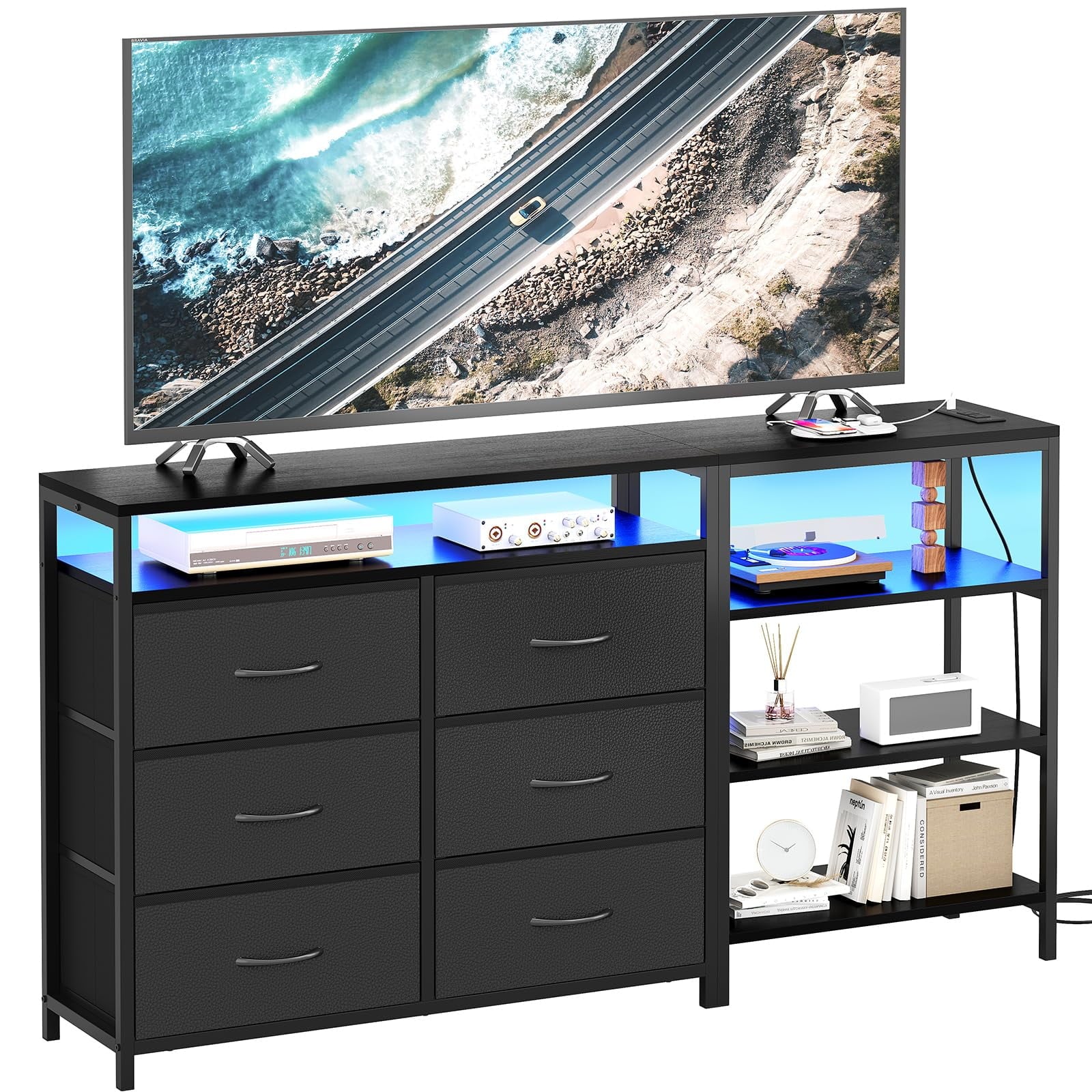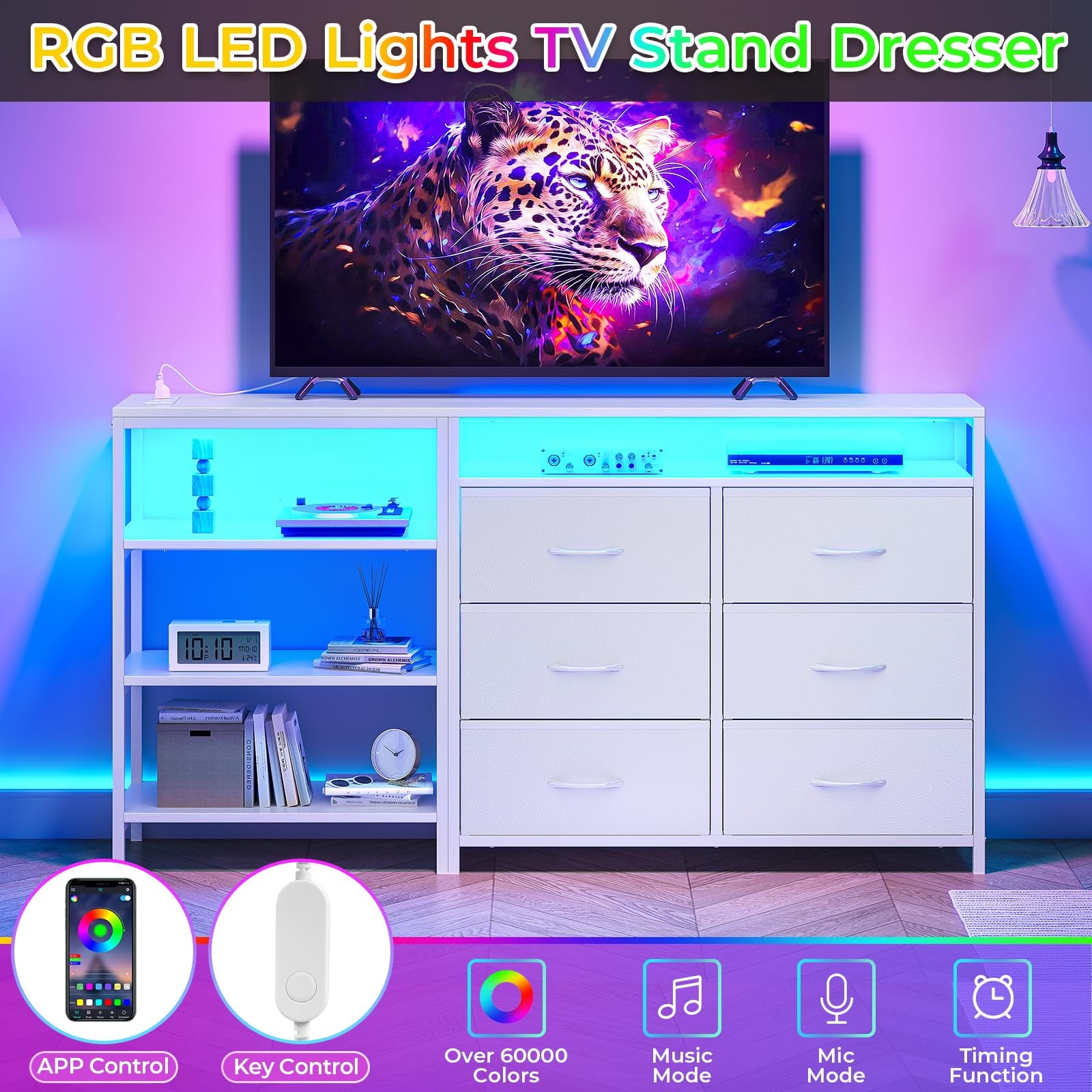 TV Stand Dresser Bedroom for 60 Inch TV with LED Lights & Charging Station, Changable L Shape Corner TV Stand, 6 PU Drawers, 3 Open Shelves Entertainment Center