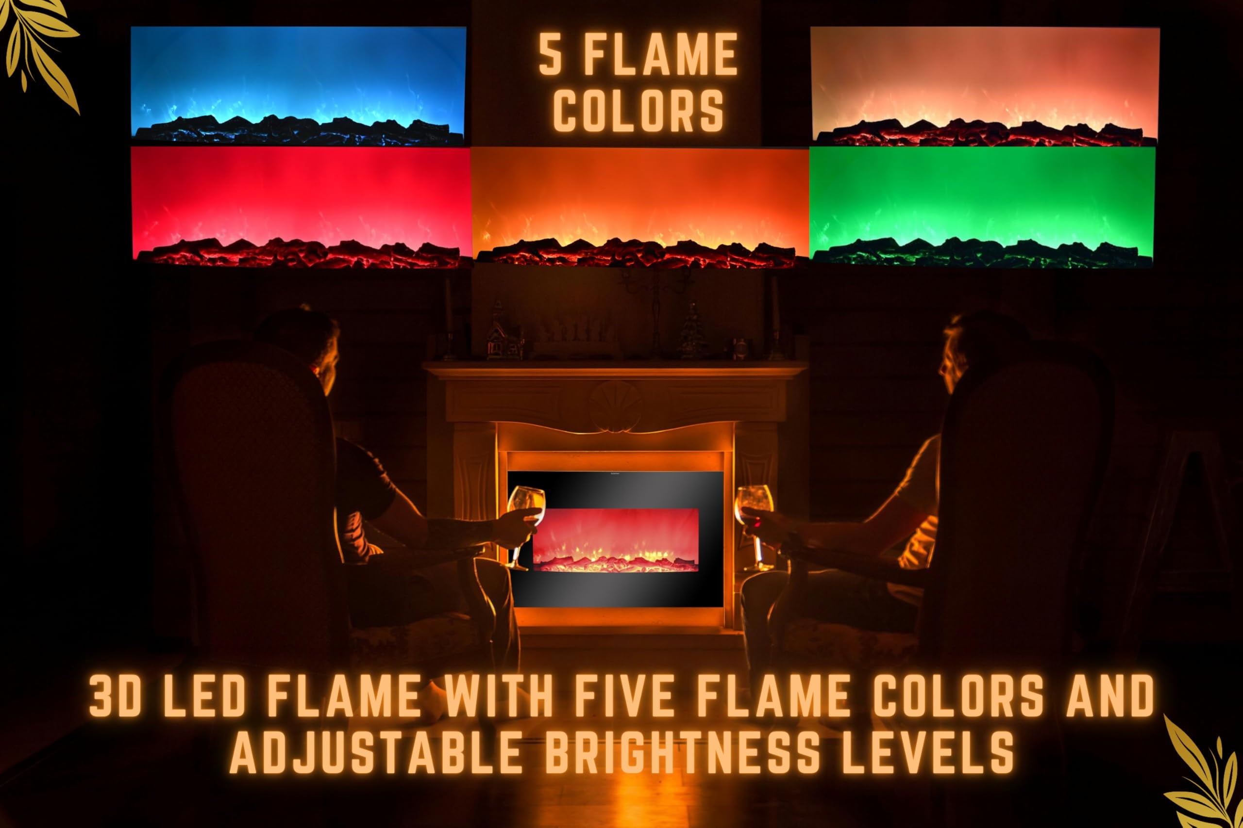 𝗙𝗹𝗮𝗺𝗲 𝗘𝗳𝗳𝗲𝗰𝘁: 3D LED flame with five flame colors and adjustable brightness levels