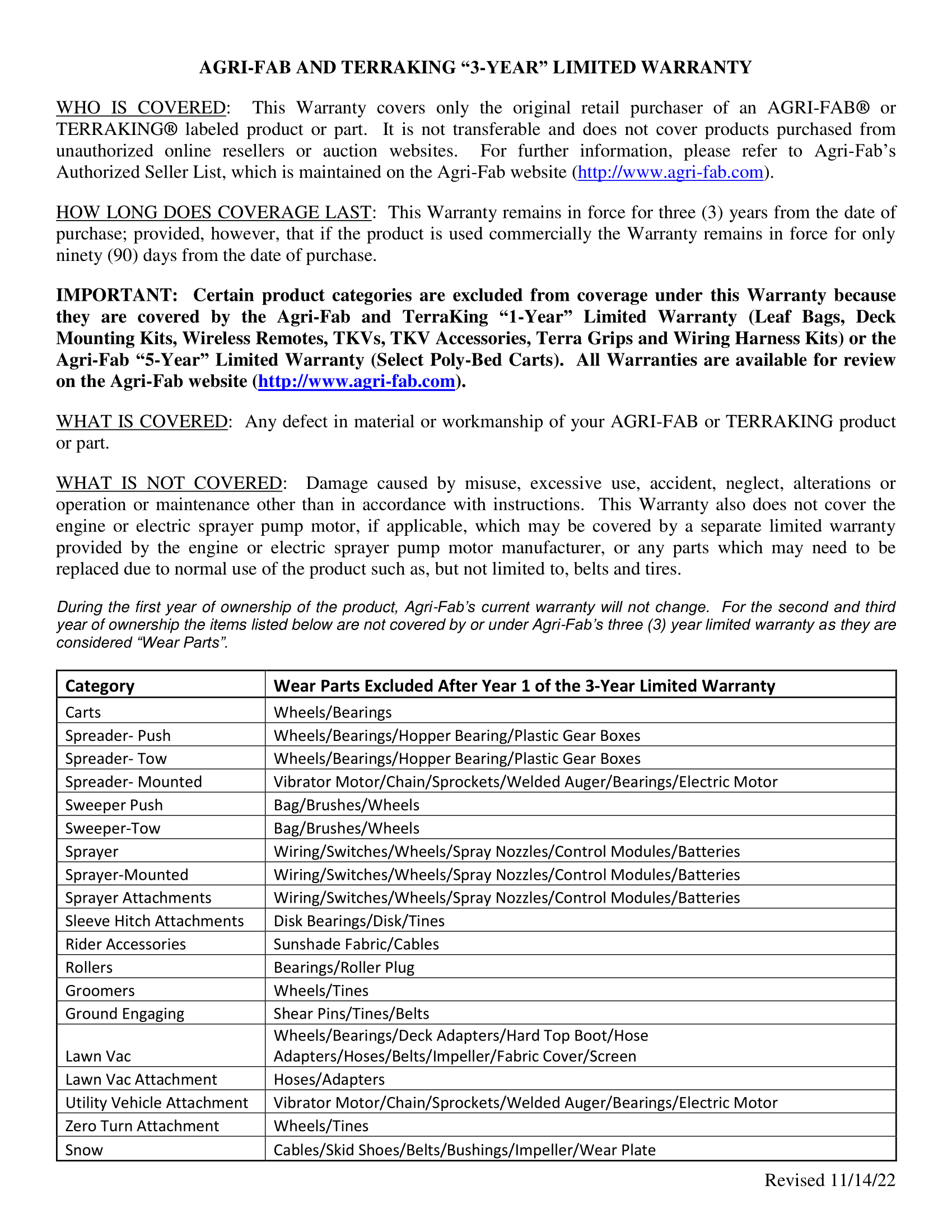 - 3 Year Limited Warranty – This Warranty covers only the original retail purchaser of an AGRI-FAB® or TERRAKING® labeled product or part. It is not transferable and does not cover products purchased from unauthorized online resellers or auction websites. For further information, please refer to Agri-Fab’s Authorized Seller List, which is maintained on the Agri-Fab website