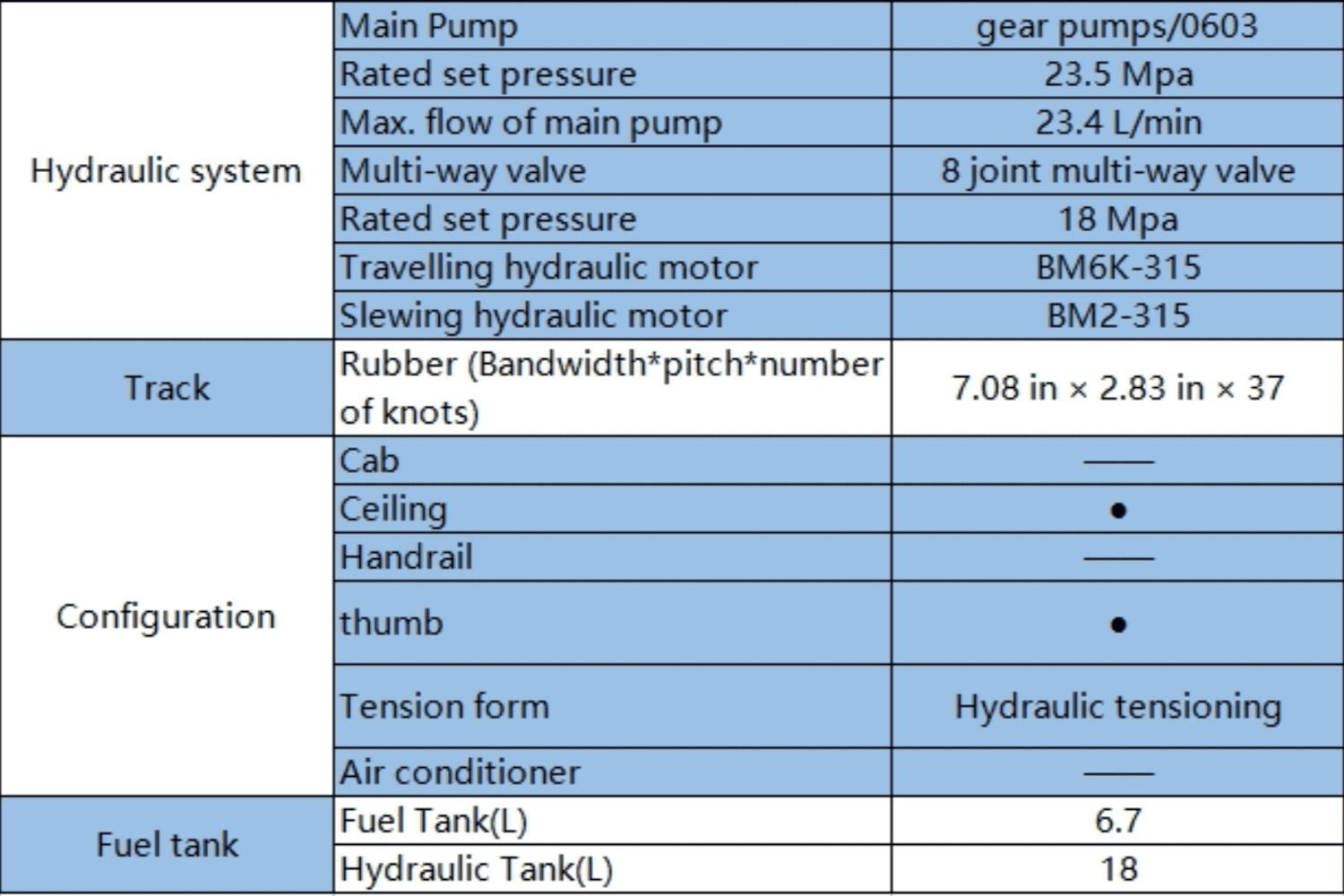 Tank Capacity: Fuel – 1.77 gallons, Hydraulic Oil – 4.76 gallons