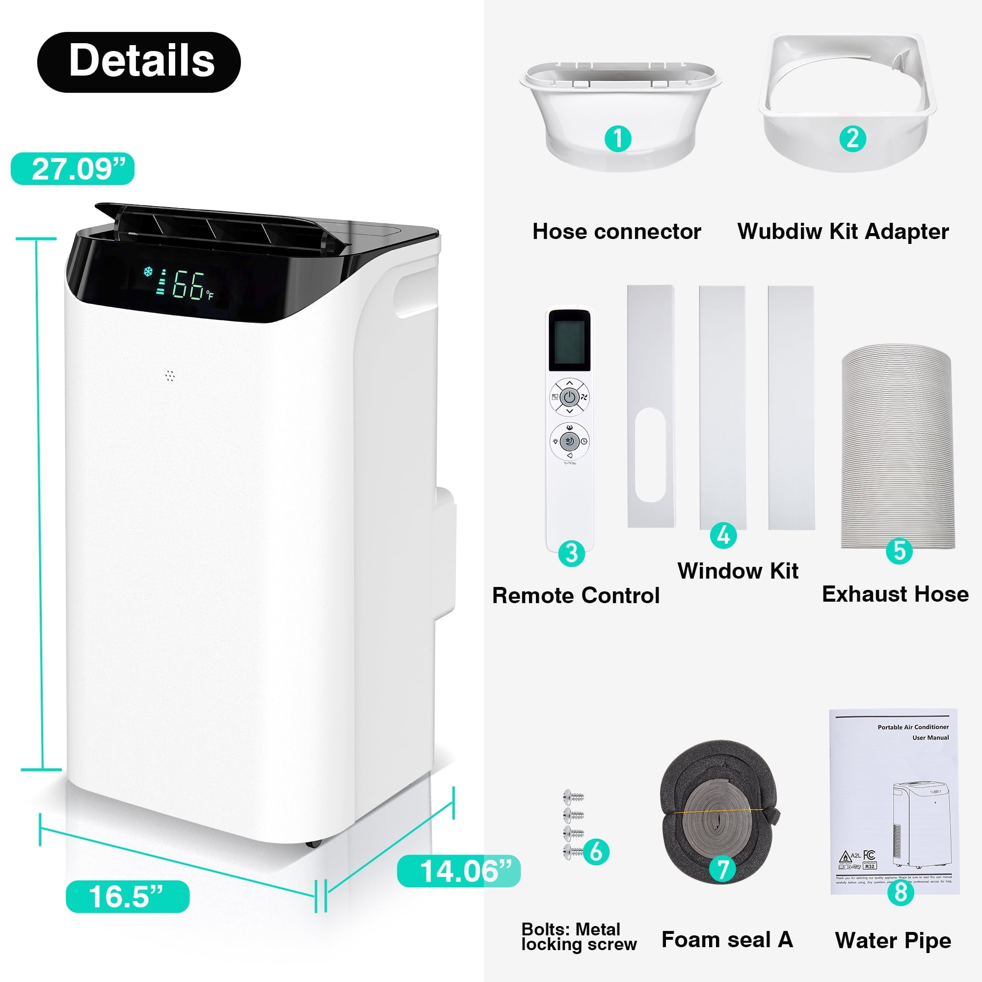 - 【Easy To Install and Move】The exhaust hose, hose connector, window kit and window kit adapter are included in the package, you could easily assemble or disassemble the indoor portable air conditioner by reading the instruction book. The dimension and weight of this portable ac unit are 14″x17″x27″ and 57lbs respectively. Its compact design and four wheels allow you to enjoy air conditioning anywhere (with sliding window) in your home.
