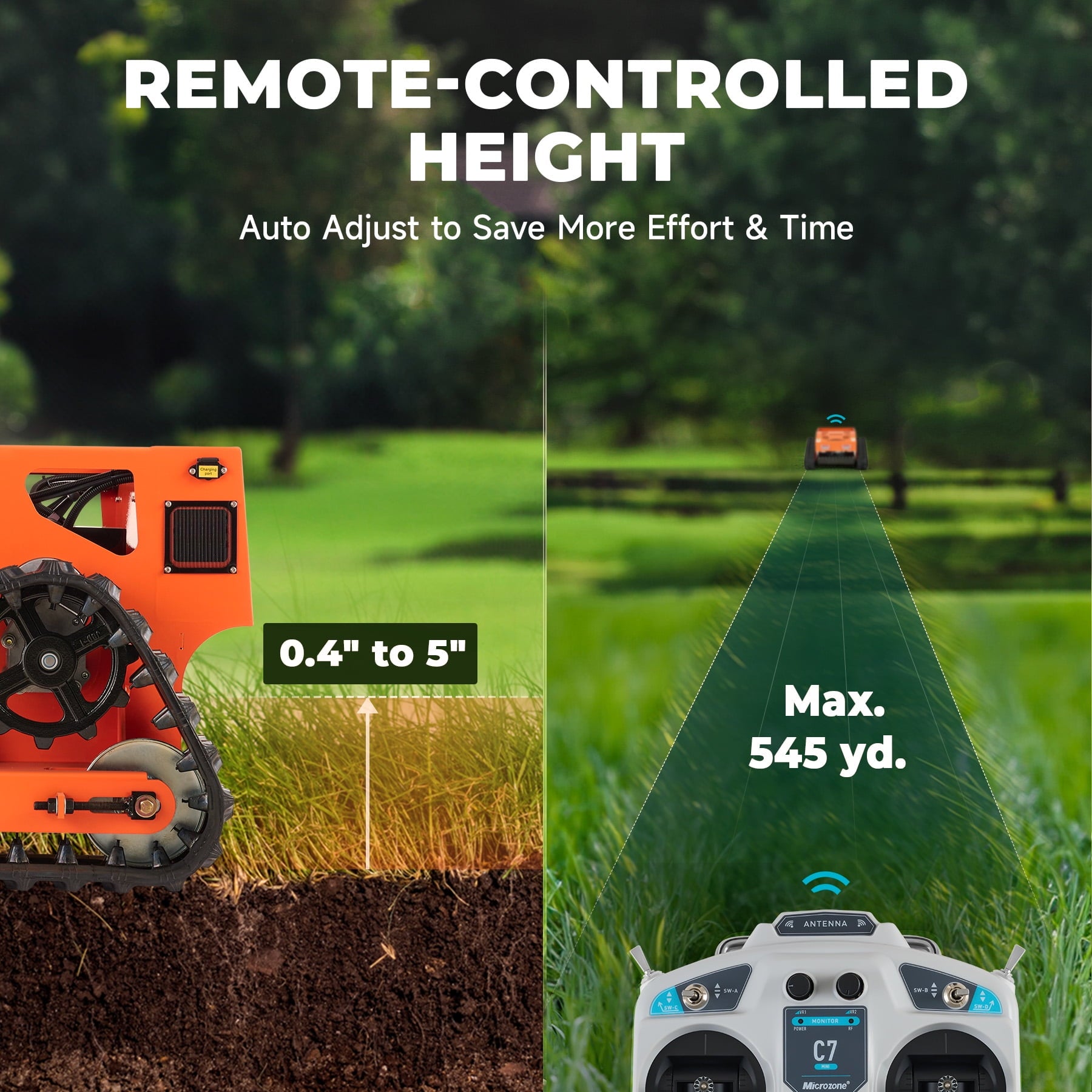 Control at Your Fingertips: Shape your lawn’s look from the comfort of your chair! Our grass cutter includes an intuitive remote lets you adjust cutting heights from a short 0.4″ to a lush 5″, even from up to 545 yards away