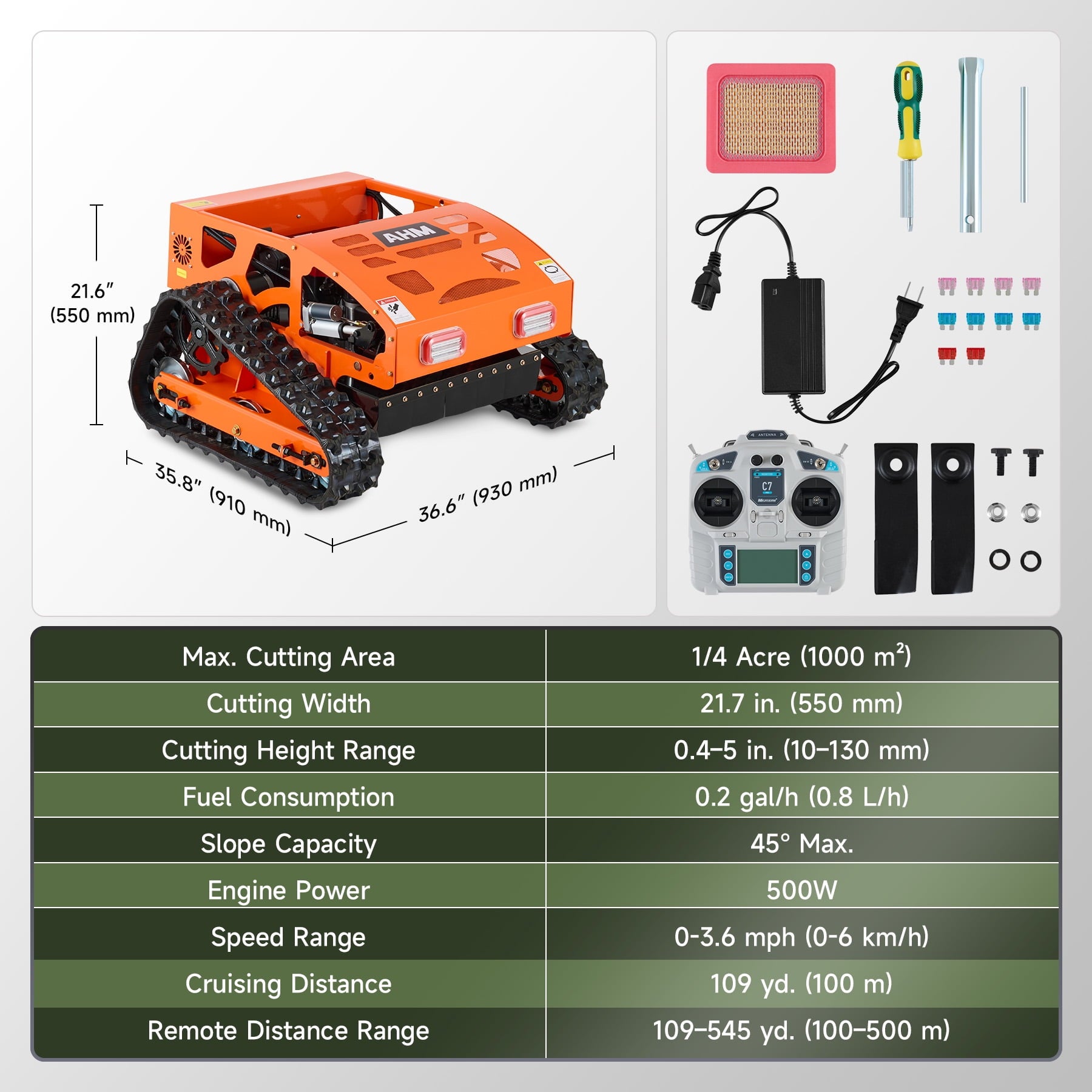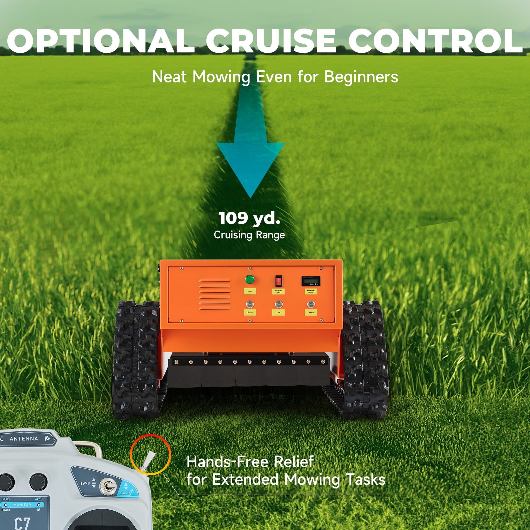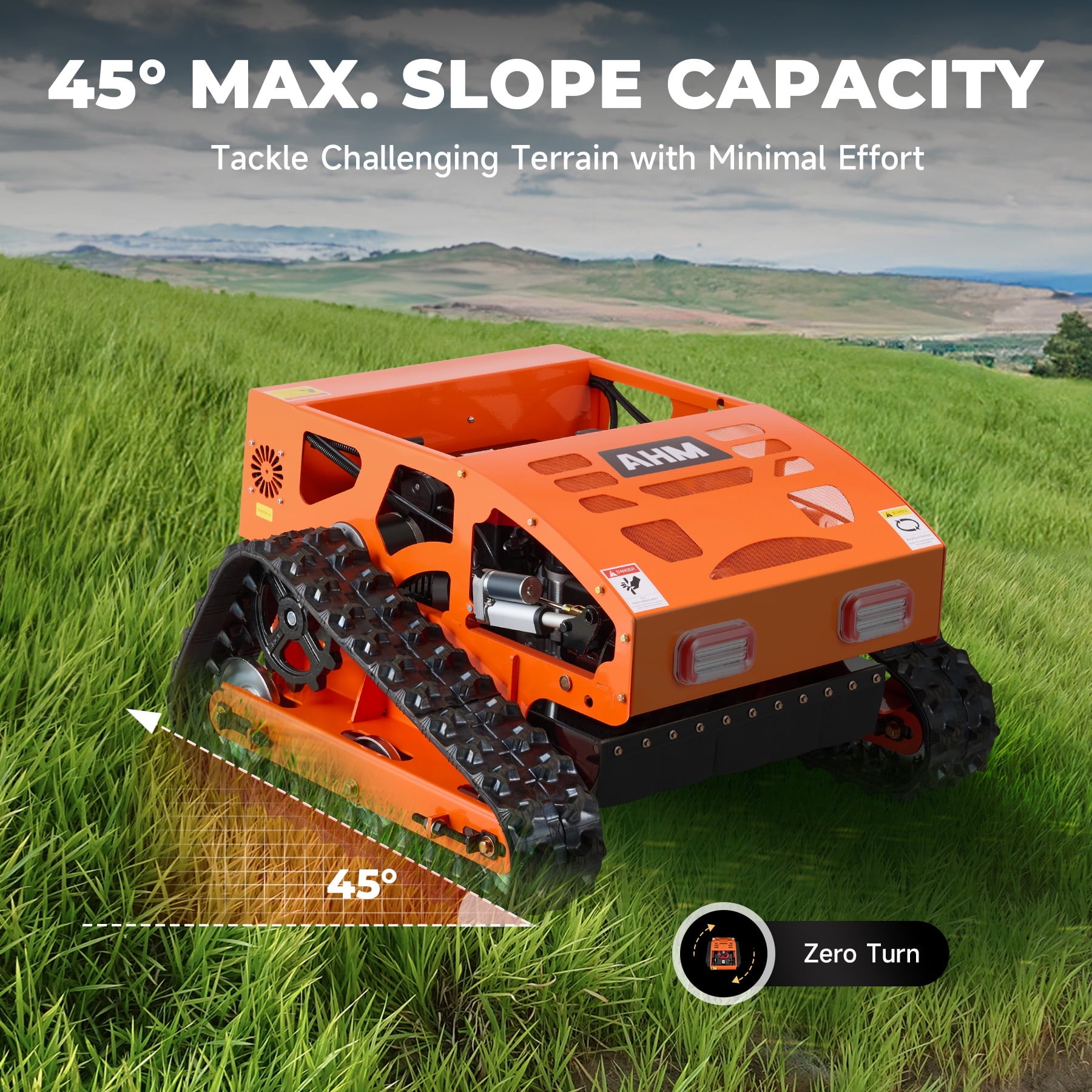 Tackle Tough Terrain: From grassy backyards to steep hills and winding orchards, this mower features all-terrain tracks to handle slopes up to 45° lawns up to 0.25 acres with ease. It’s your go-to solution for all-around lawn care