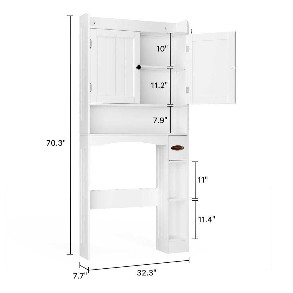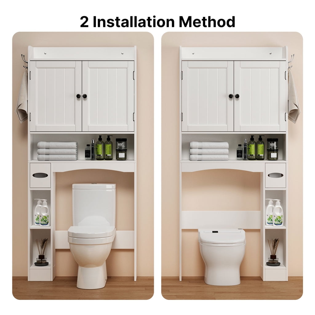 • 🗄️【PREMIUM MATERIAL】- This bathroom cabinet over the toilet is constructed of high-quality engineered wood, adding style and charm with decorative beadboard paneling and silver knobs. The anti-toppling fitting can anchor to the wall for security and stability.