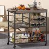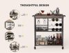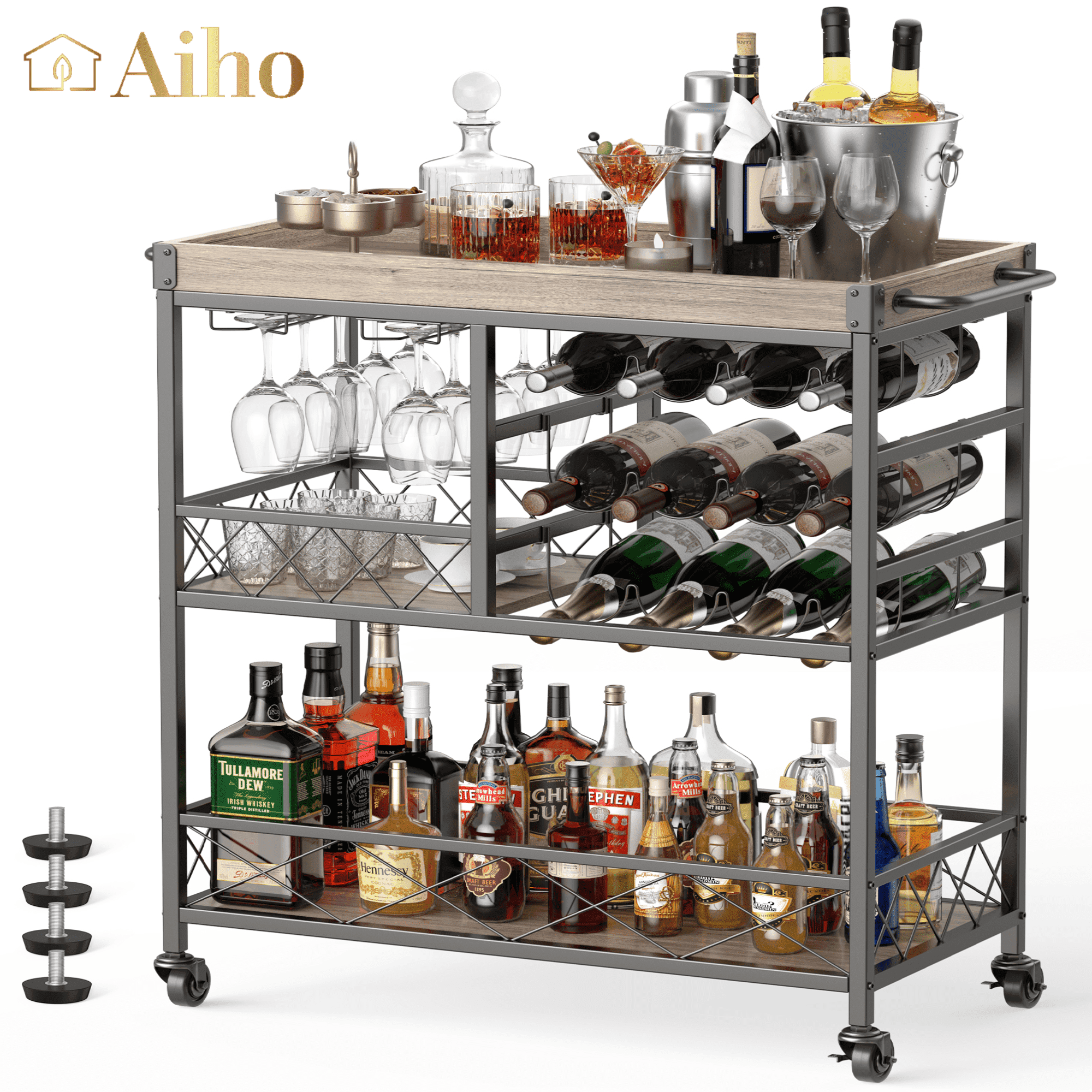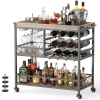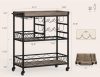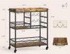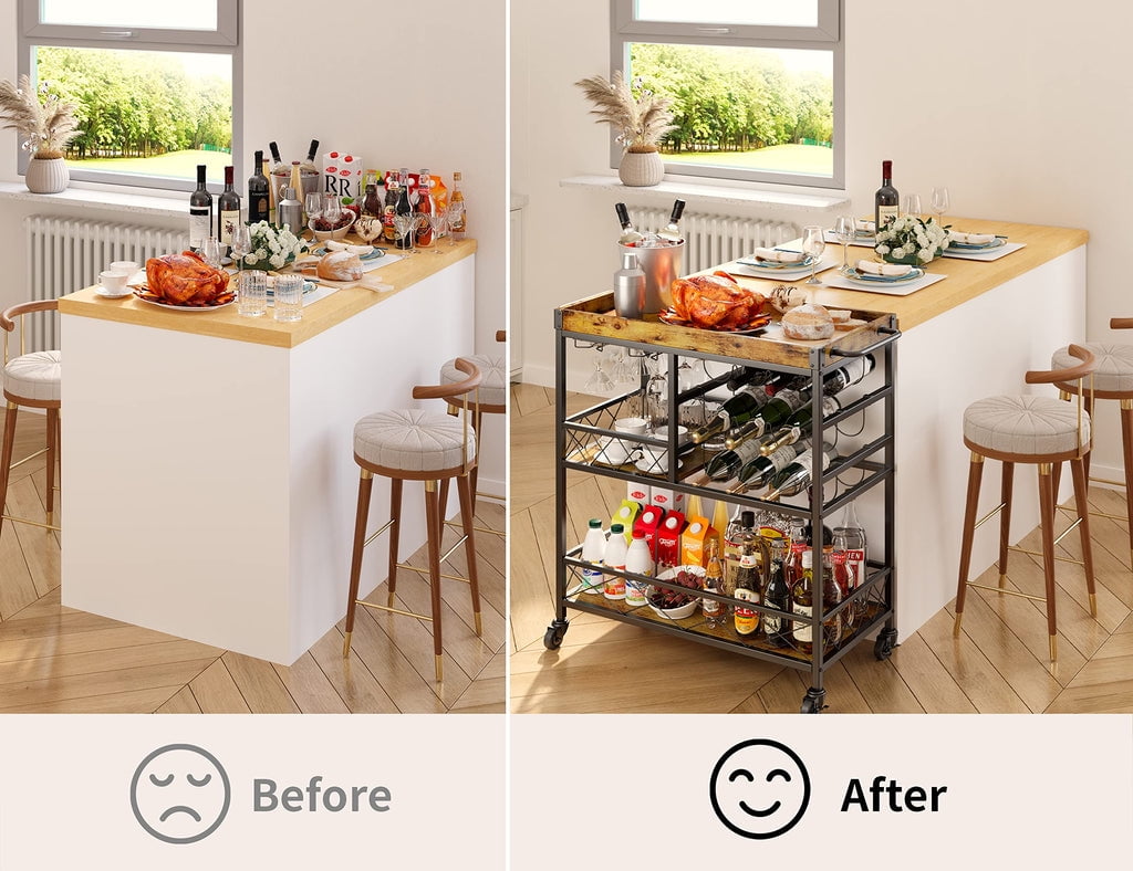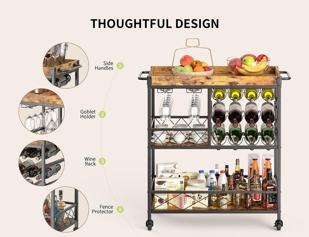 🥳GET ROOM TO MOVE. The home bar & serving carts is equipped with four rolling silent wheels and feet, two of which can be secured. This design helps you move freely around the kitchen, garden and more. In addition, the fence protectors on the side of the industrial cart will prevent items from falling during movement