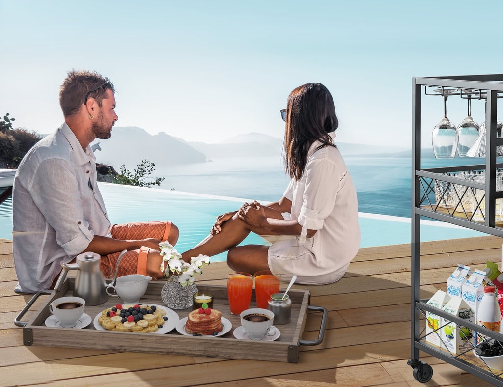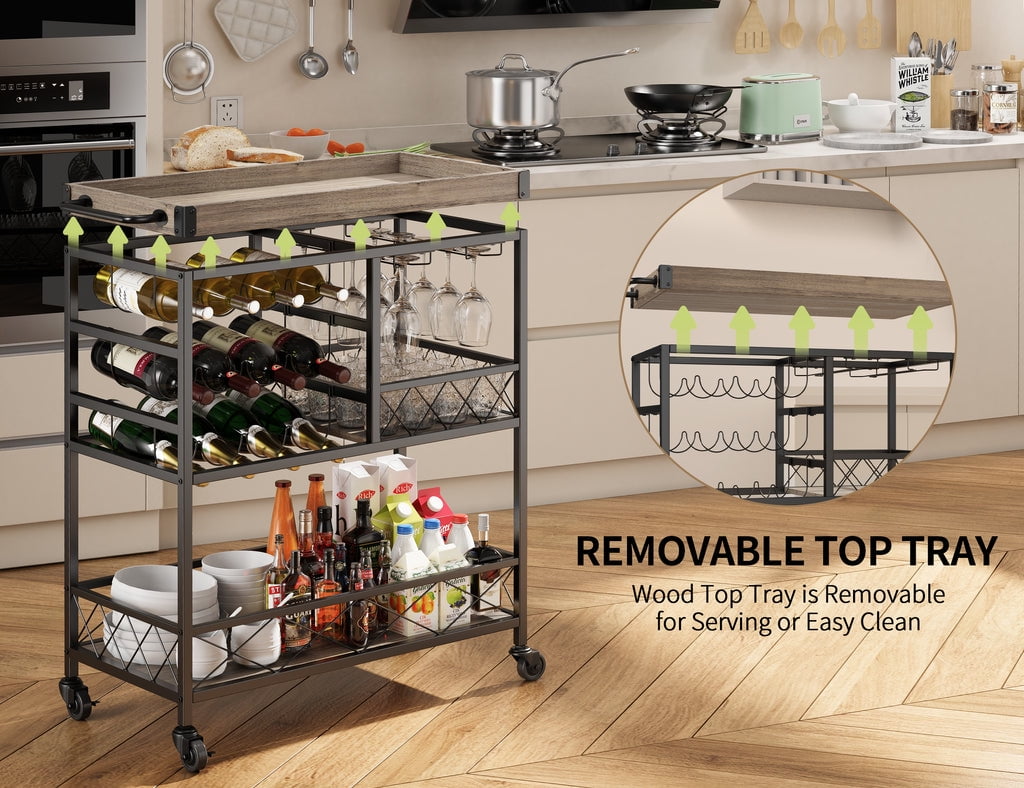 🥳GET TRIPLE-USE TRAY. The top removable tray has three uses. First, it allows for storage. Second, it has handles on the side for hanging items and moving the bar serving cart. Third, it can be used as a small dining table or to move items between the cart and the table