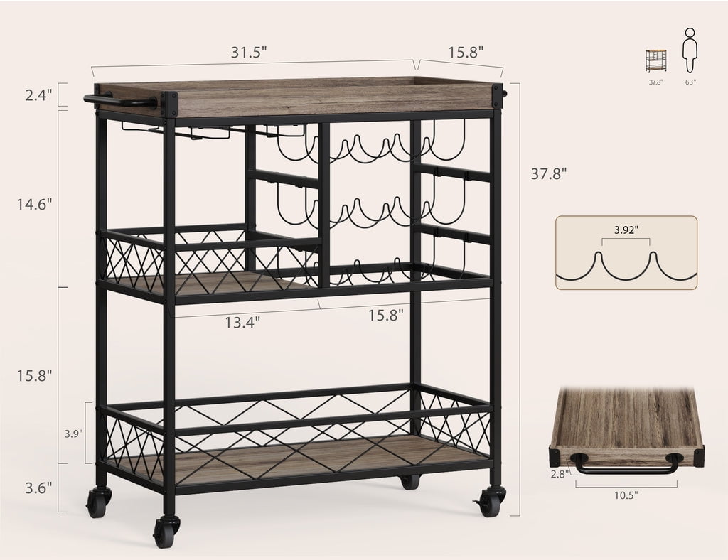 🥳GET STORAGE SPACE. The 31.5 “L*15.8 “W*37.8 “H home bar cart offers multiple shelves and metal hooks for storing food, wine, and glasses, and a removable tray on top serves as additional storage for a coffee maker, blender, and more