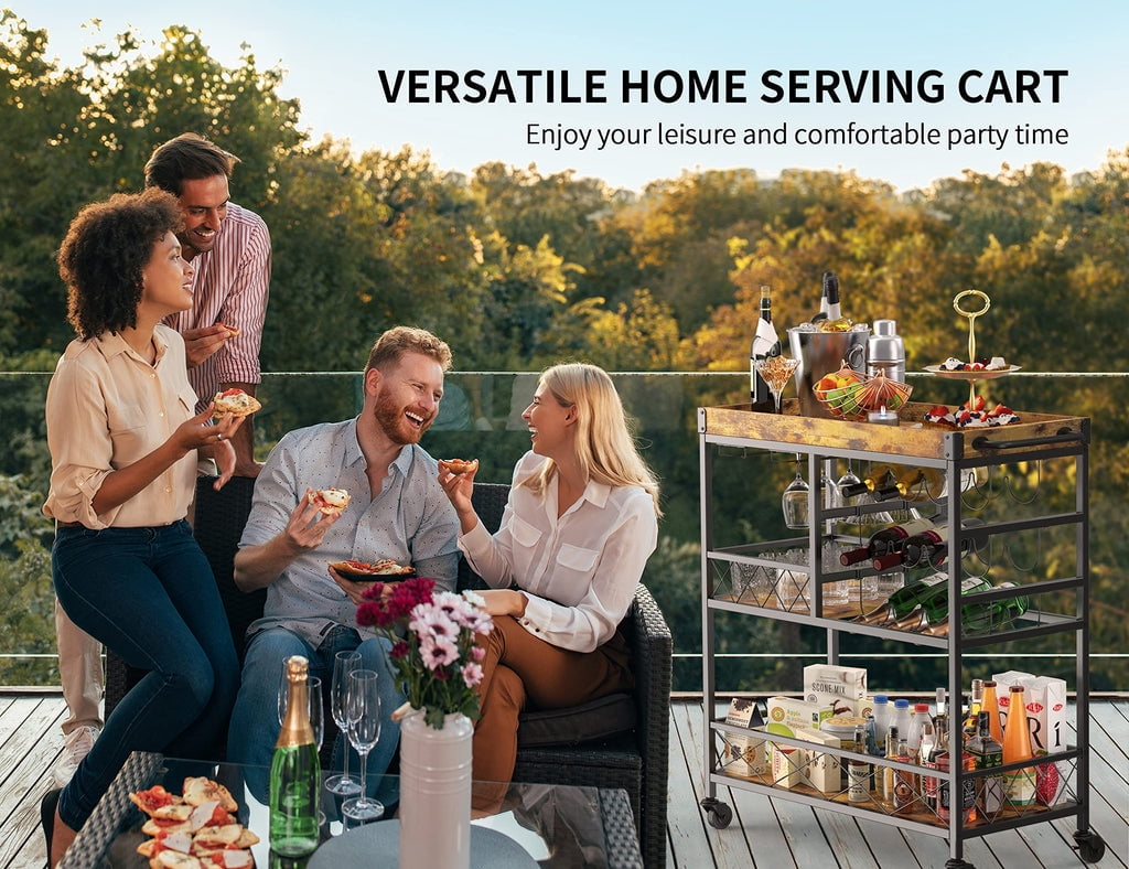 🥳GET MODERN FURNITURE. The retro-industrial, small footprint makes this bar cart suitable for a variety of venues. The bar cart can be used in food pantries, restaurants, gardens, and many other places, and can be used for birthday parties, holiday gatherings, afternoon tea, barbecues, and other services