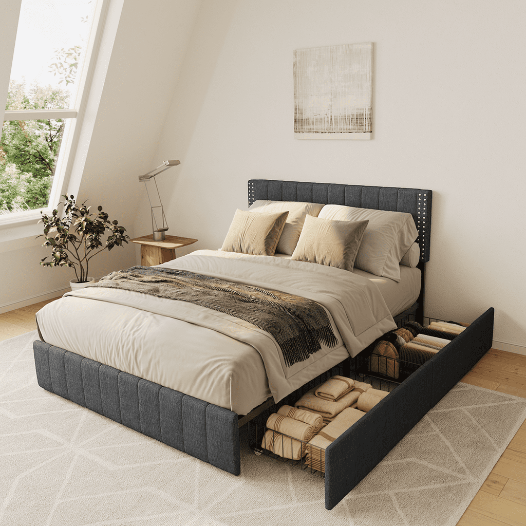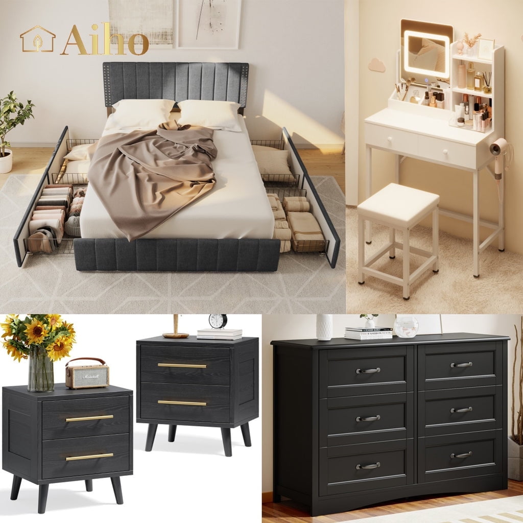 【Dark Gray Queen Bed Frame with 4 Drawers】+【Nightstands Set of 2】+【Double Wide 6-Drawer Dresser】+【Vanity Table Set】