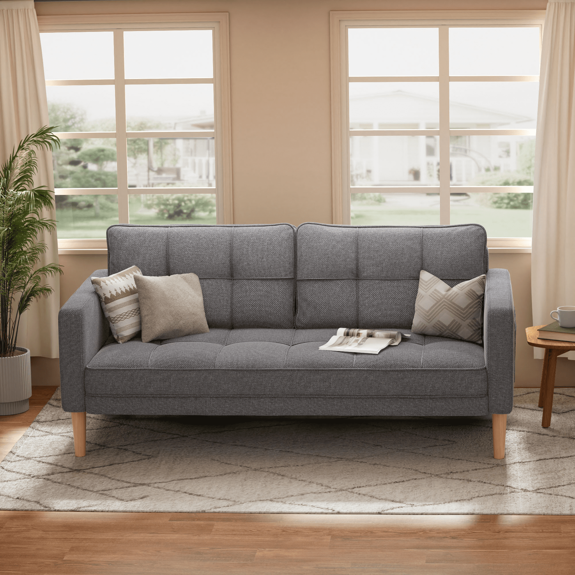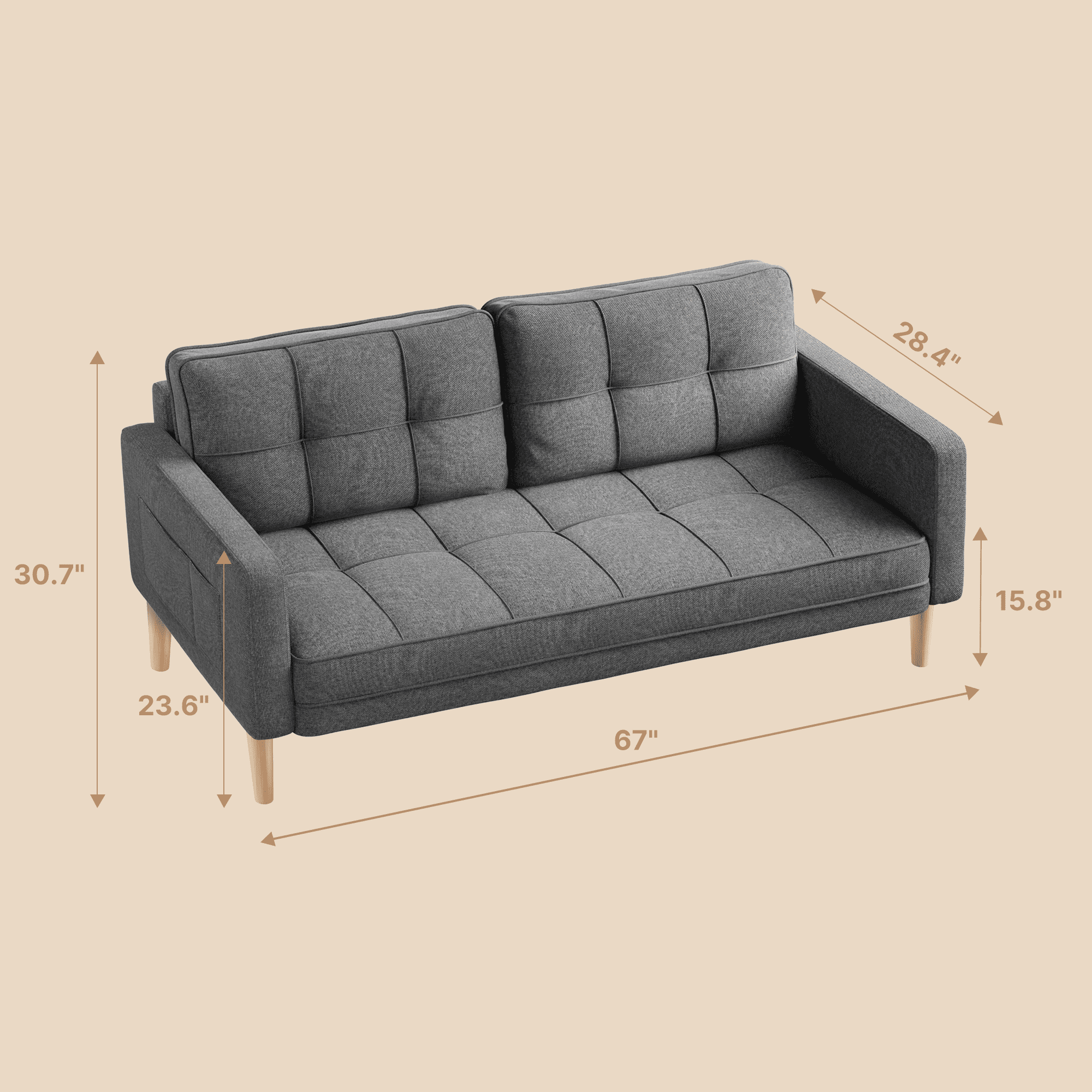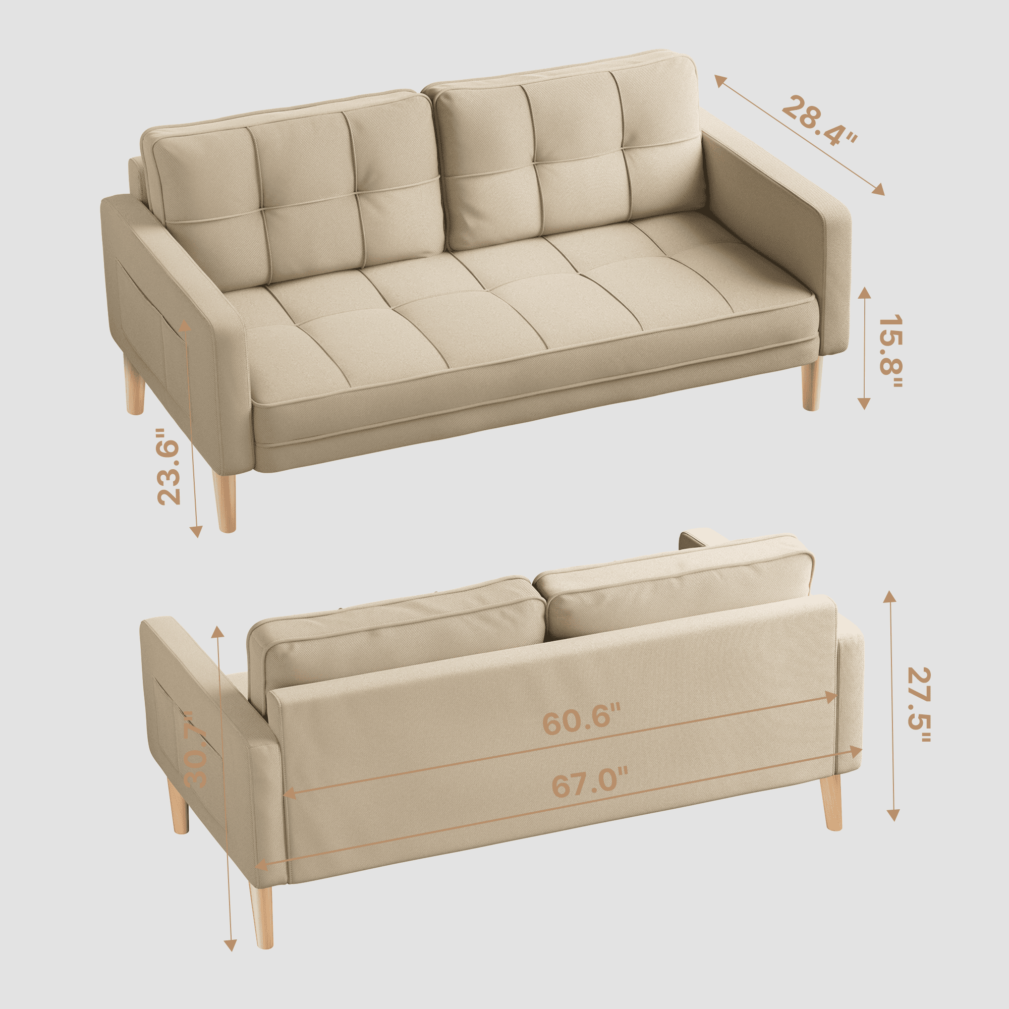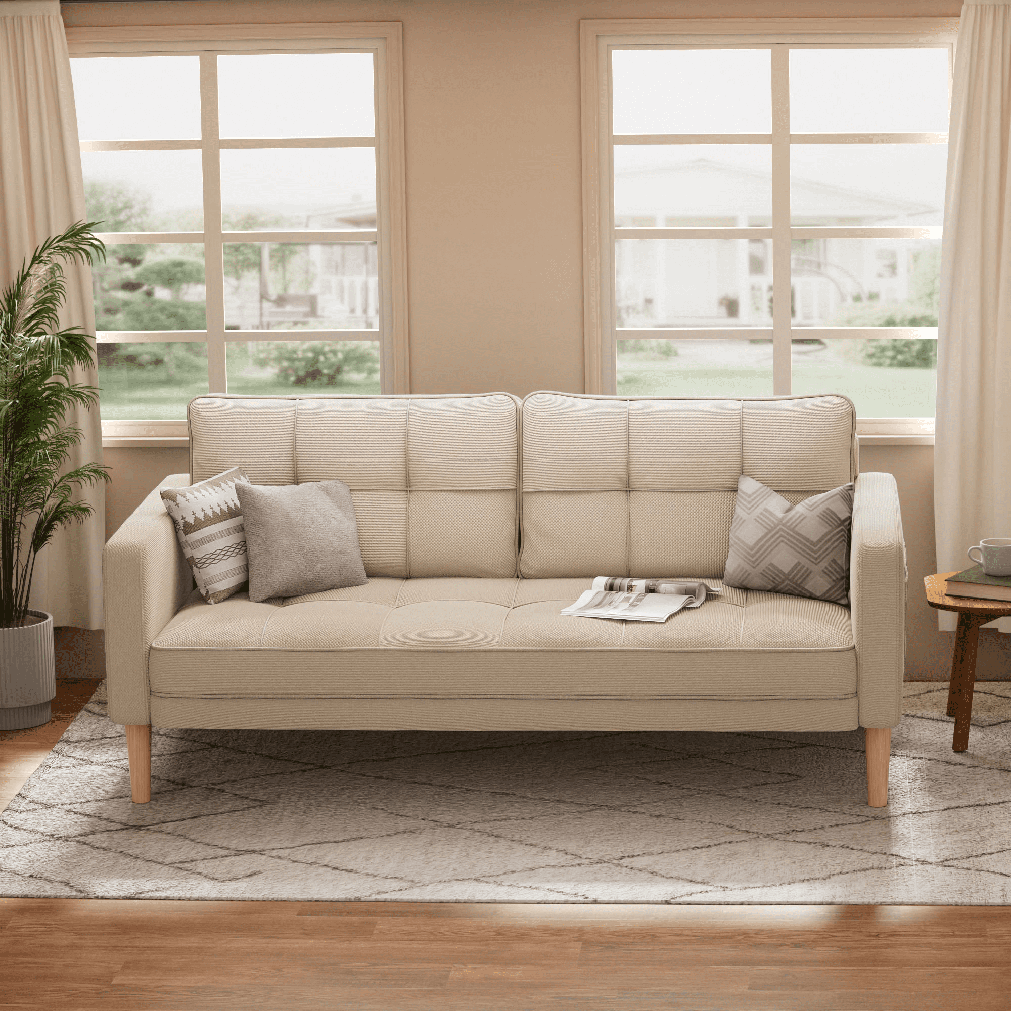 This modern sofa combines generous comfort with a sleek, space-saving design, featuring a 69-inch width and 24-inch seat depth that comfortably accommodates up to three people; it is filled with high-density foam in both the backrest and seat for soft yet supportive cushioning, while thickened, padded armrests enhance the overall cozy experience. The armrests themselves are thickened and widened, providing ideal support for your arms during sitting or doubling as a comfortable headrest when you need to relax, offering versatile comfort. Crafted with a solid hardwood frame, the sofa boasts long-lasting durability, supported by four upgraded wooden legs that can bear up to 660 pounds, ensuring maximum sturdiness and stability. Blending modern charm, it seamlessly fits various spaces without compromising comfort or seating capacity, and is upholstered in selected breathable linen fabric that is easy to clean and maintain, keeping it looking new for years to come; it also comes with hassle-free assembly, including clear instructions and all necessary tools, allowing you to finish assembly in a short time. Please note: The pillow is made of compressed foam and will reach its optimal use condition after being placed for 72 hours.