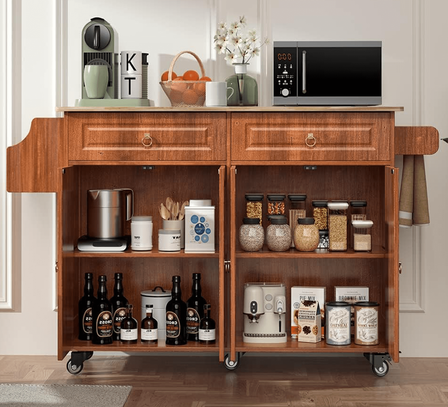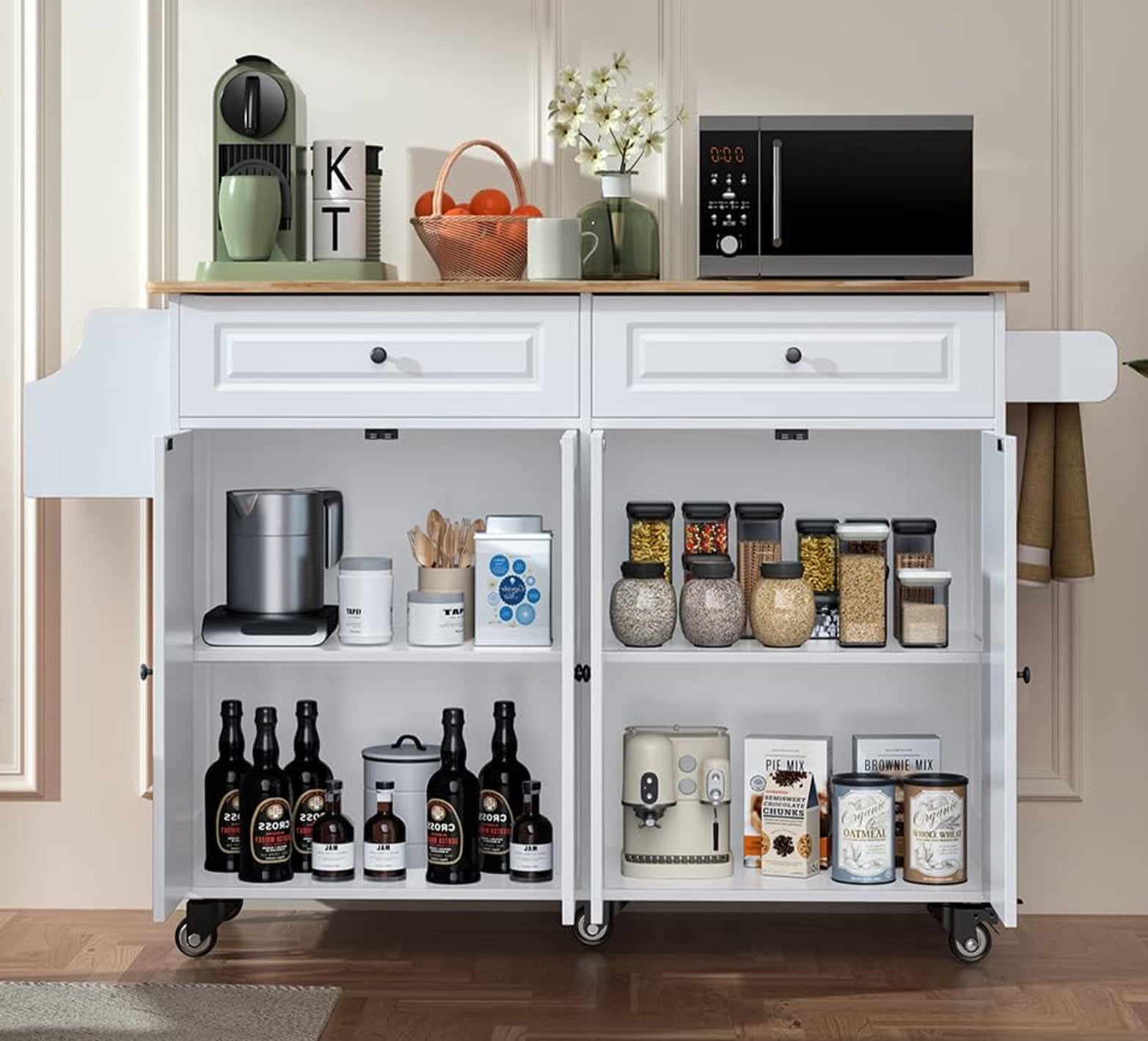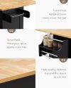 - 🍳【PREMIUM MATERIALS 】 – The rolling kitchen island is made from solid rubberwood panels, pinewood legs, and medium-density fiberboard (MDF), ensuring long-lasting durability. The surface is coated with a protective paint that is waterproof and easy to clean, resistant to damage even in humid environments, making it ideal for kitchen use.