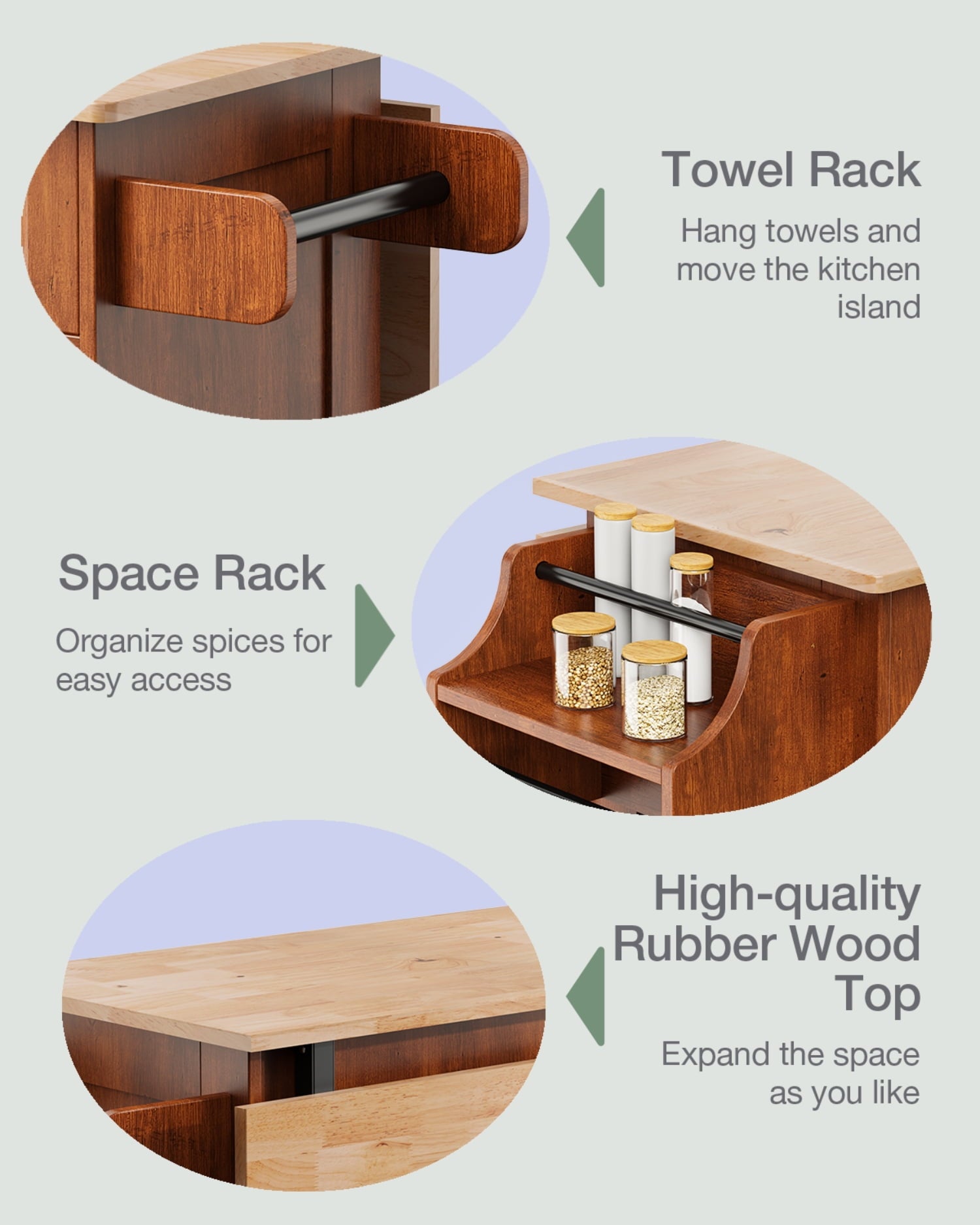 - 🍳【EXTRA-LARGE STORAGE KITCHEN ISLAND】 – The Aiho Kitchen Island features 2 storage cabinets and 2 drawers for easy access, plus a towel rack and a spice storage area on the side. It provides ample space to store various kitchen tools and utensils, helping keep your kitchen and dining area neat and organized.