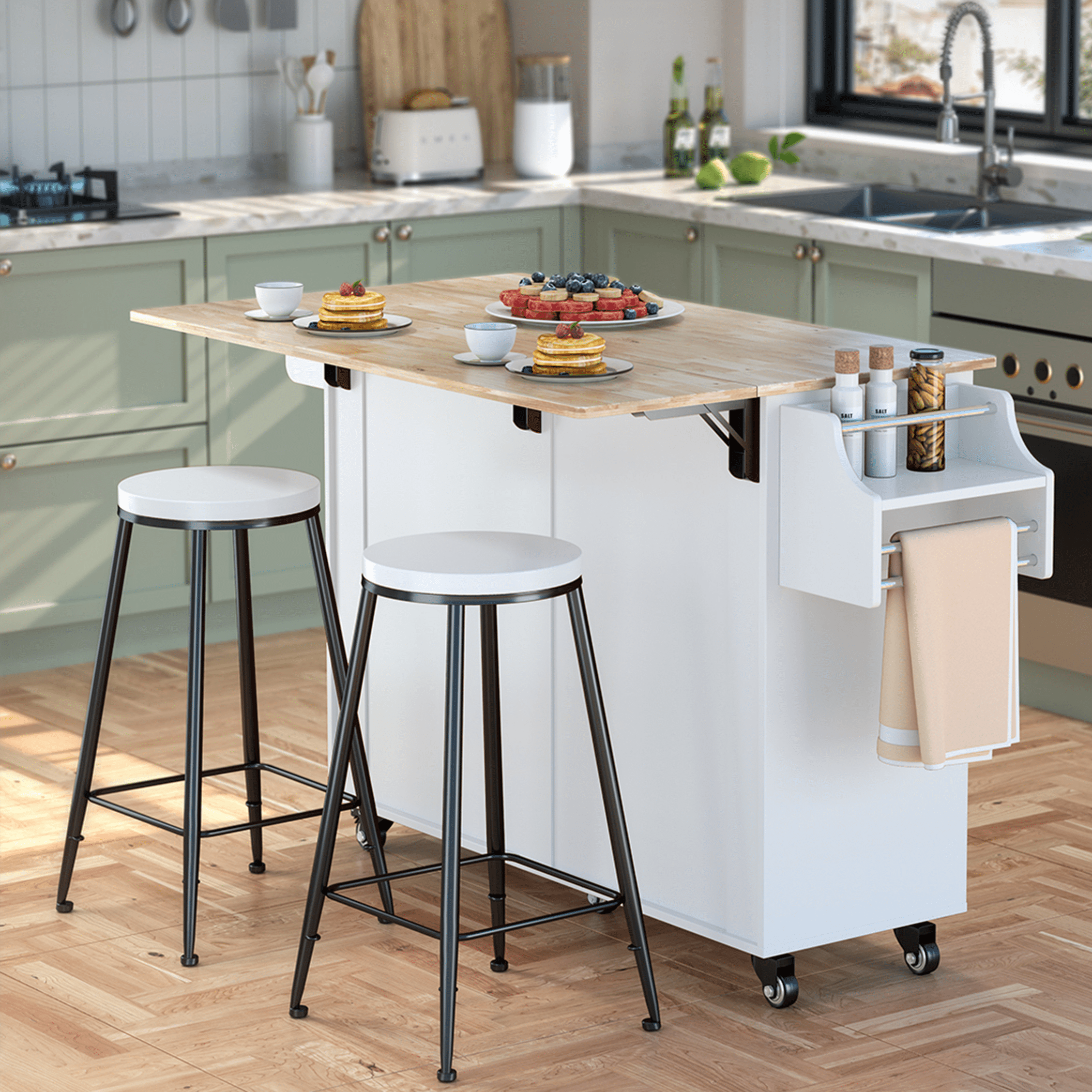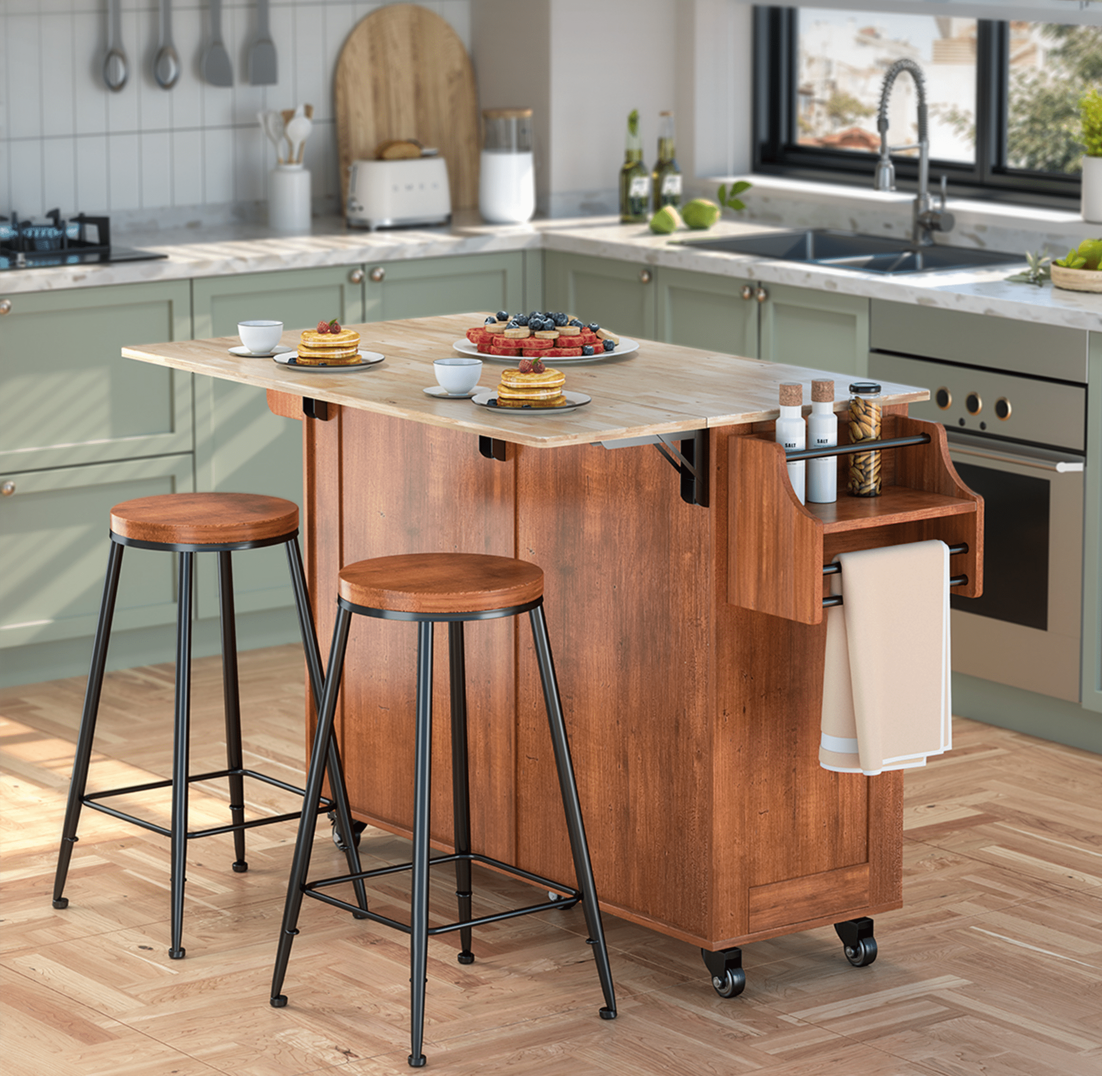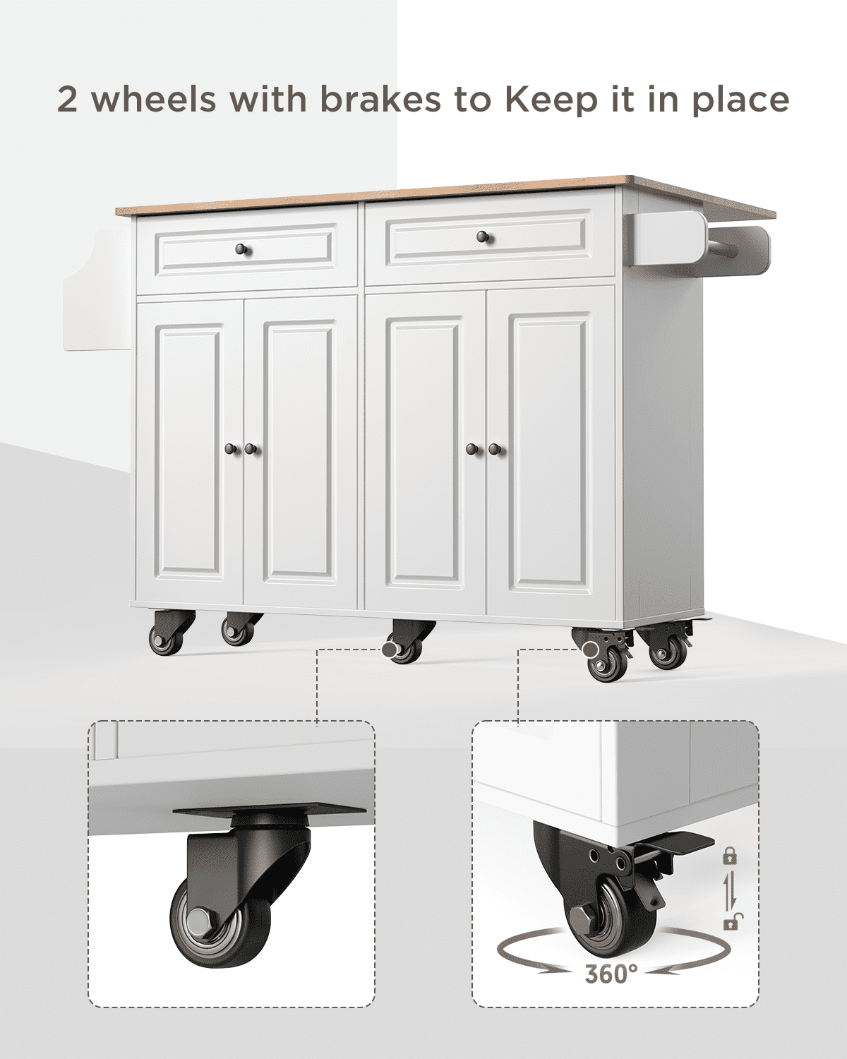 The Aiho Mobile Kitchen Island Cart is designed to maximize storage and expand your kitchen space, keeping everything organized and meeting all your needs. This kitchen cart features a foldable design, with a 45-inch wide countertop that can be extended when in use. On each side, there’s a spice rack and a towel bar. The cart includes 2 storage cabinets and 2 drawers, made from high-quality, waterproof, and easy-to-clean wood. The smooth rolling wheels lock in place, making it ideal for smaller spaces. With its classic design and three color options, this kitchen cart complements any décor, enhancing your kitchen’s functionality and showcasing your style.