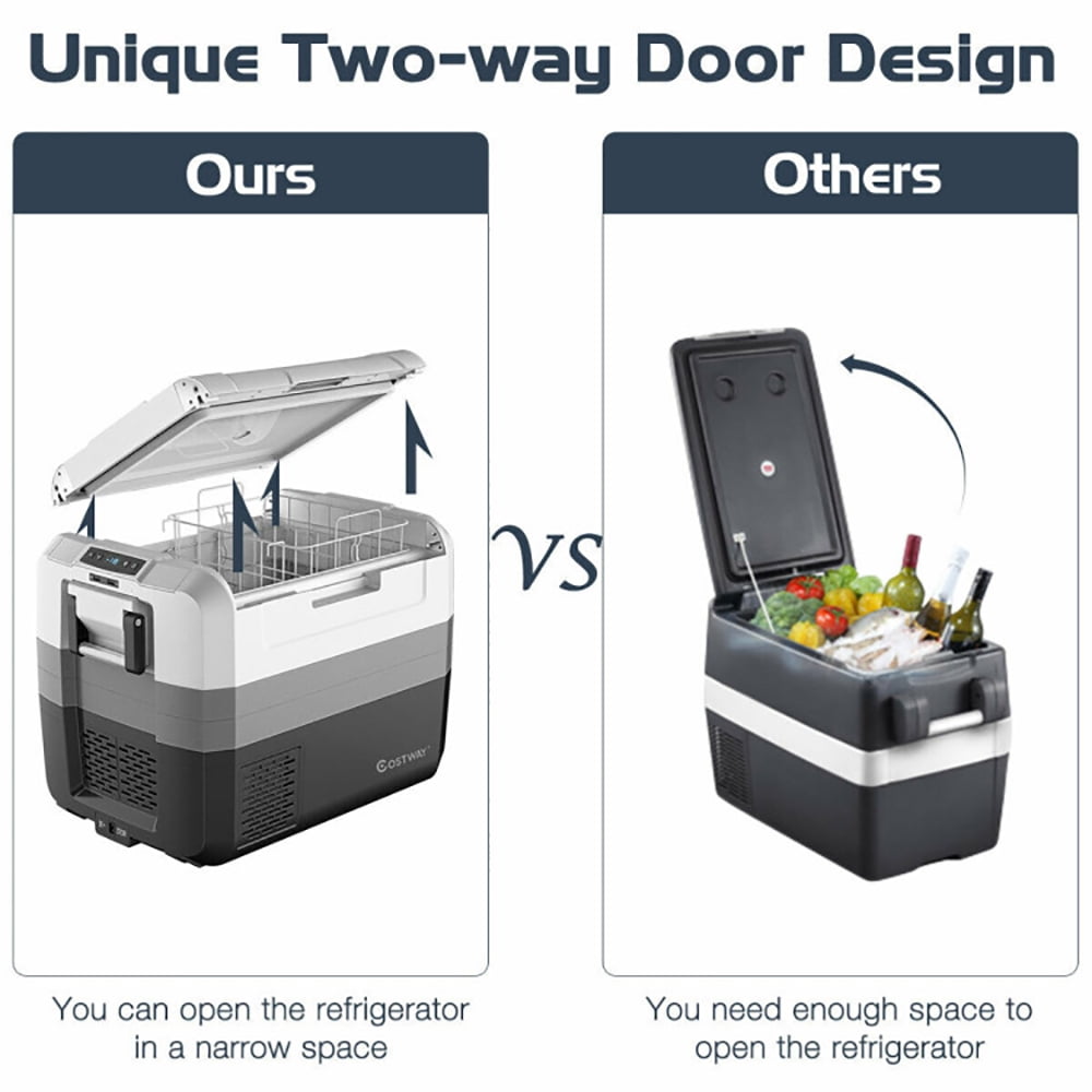 If you like a cold drink on a hot summer day the portable car refrigerator makes you feel cool on the go. The unique two-way door design and built-in led lights give you maximum convenience. With dual-zone design and high-quality compressor