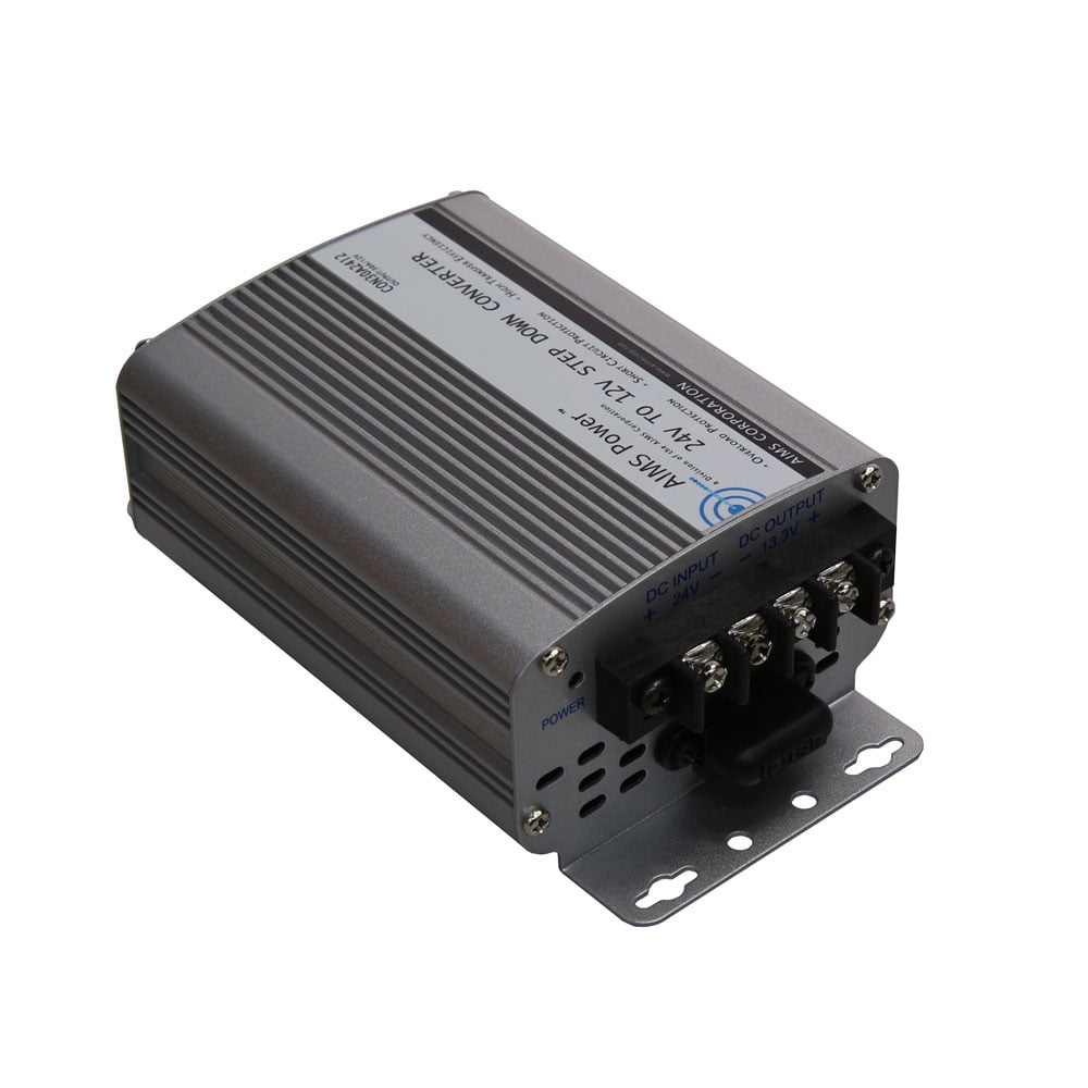 The AIMS Power 24 VDC to 12 VDC step down converter product line is non-isolated and should be used in negative ground systems (input and output have a common negative). These converters are extremely efficient, compact and include all safety features.