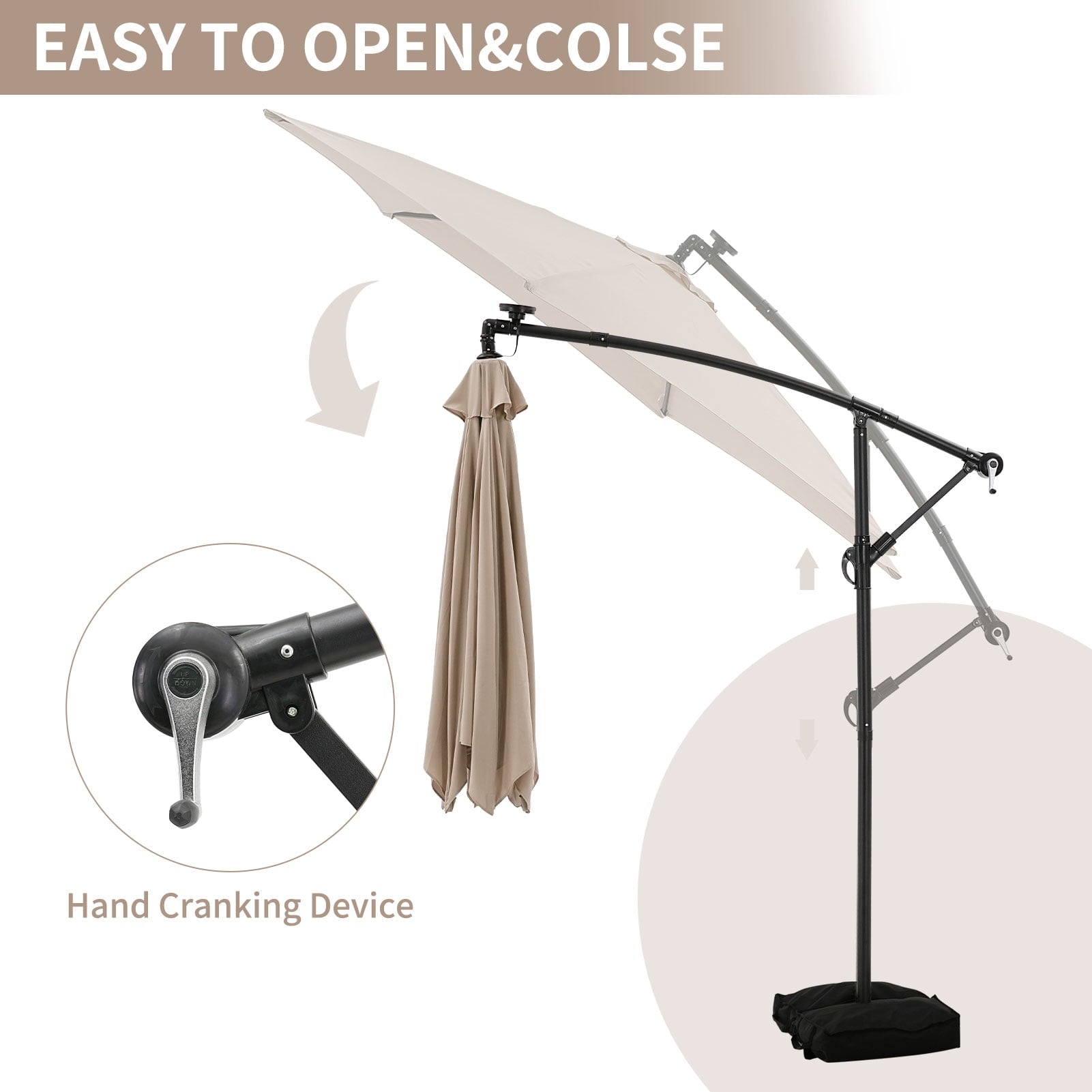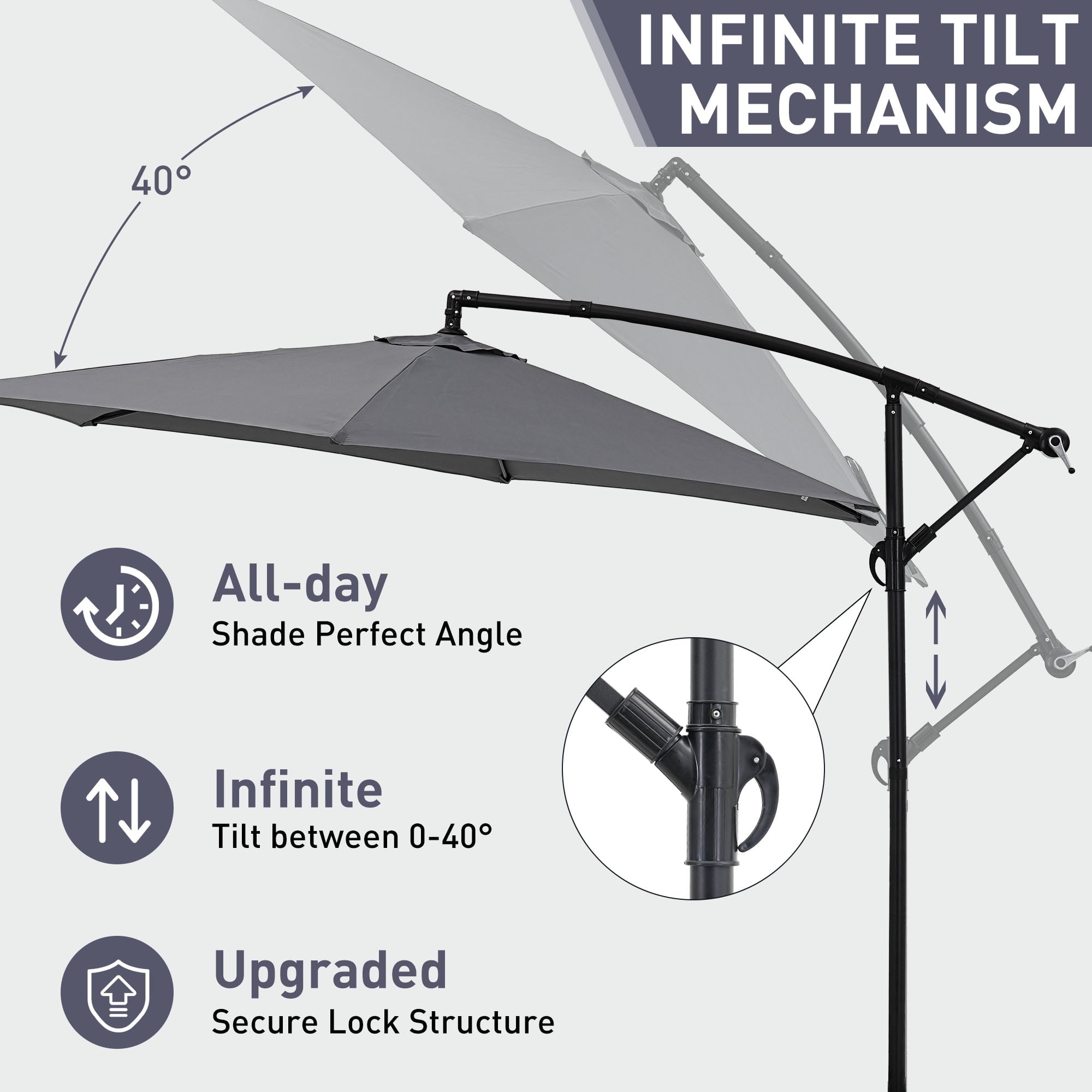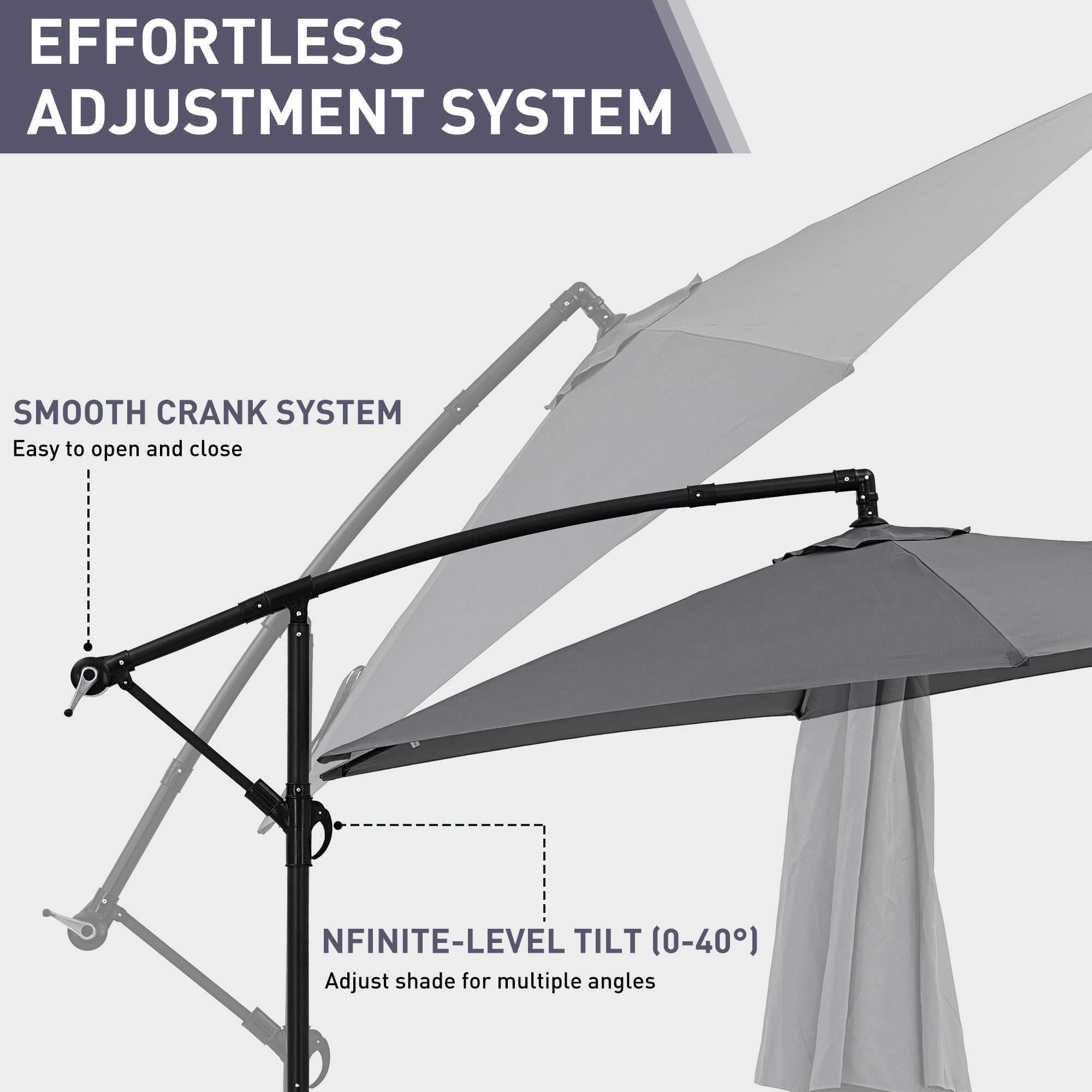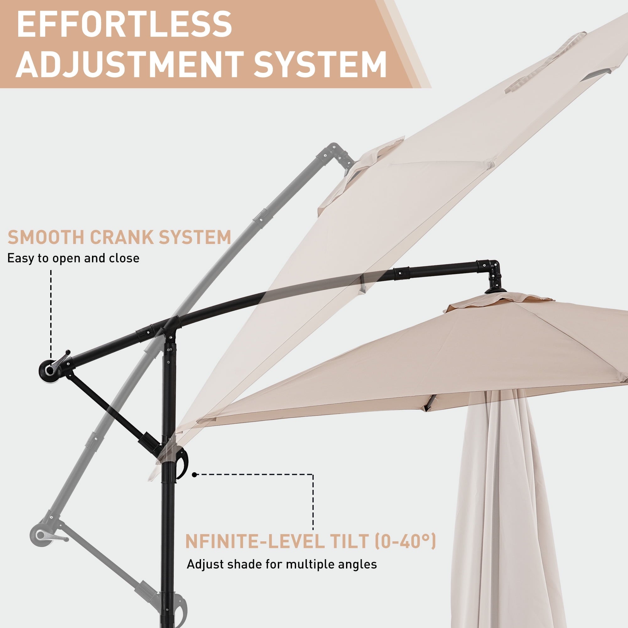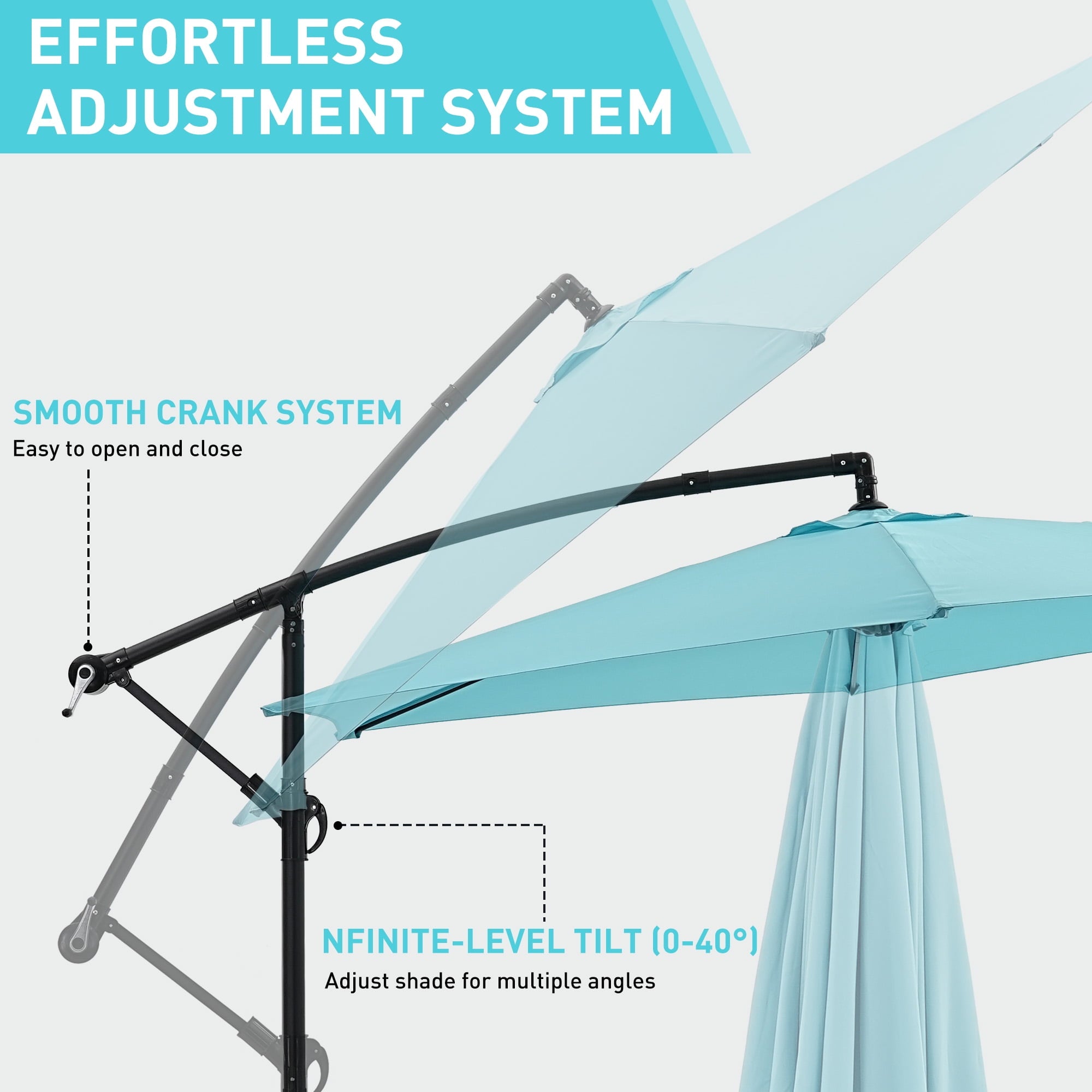 - ☂Elegant offset hanging design with handle crank and cantilever operation system make it’s easily opens and close the patio umbrella. A smooth gliding handle and tilt settings allow you to adjust the shade and block the sun at various angles, keeping the area protected throughout the day.