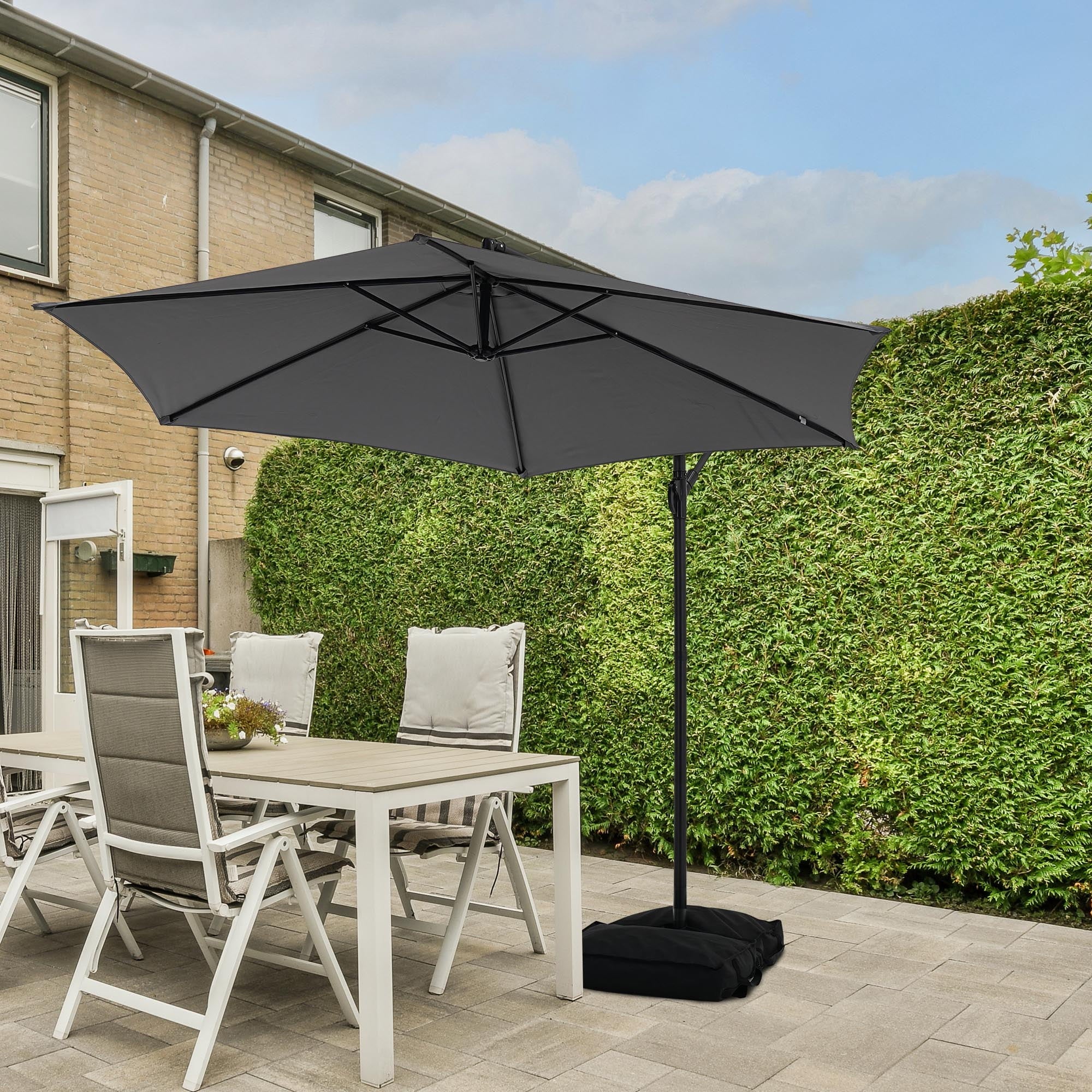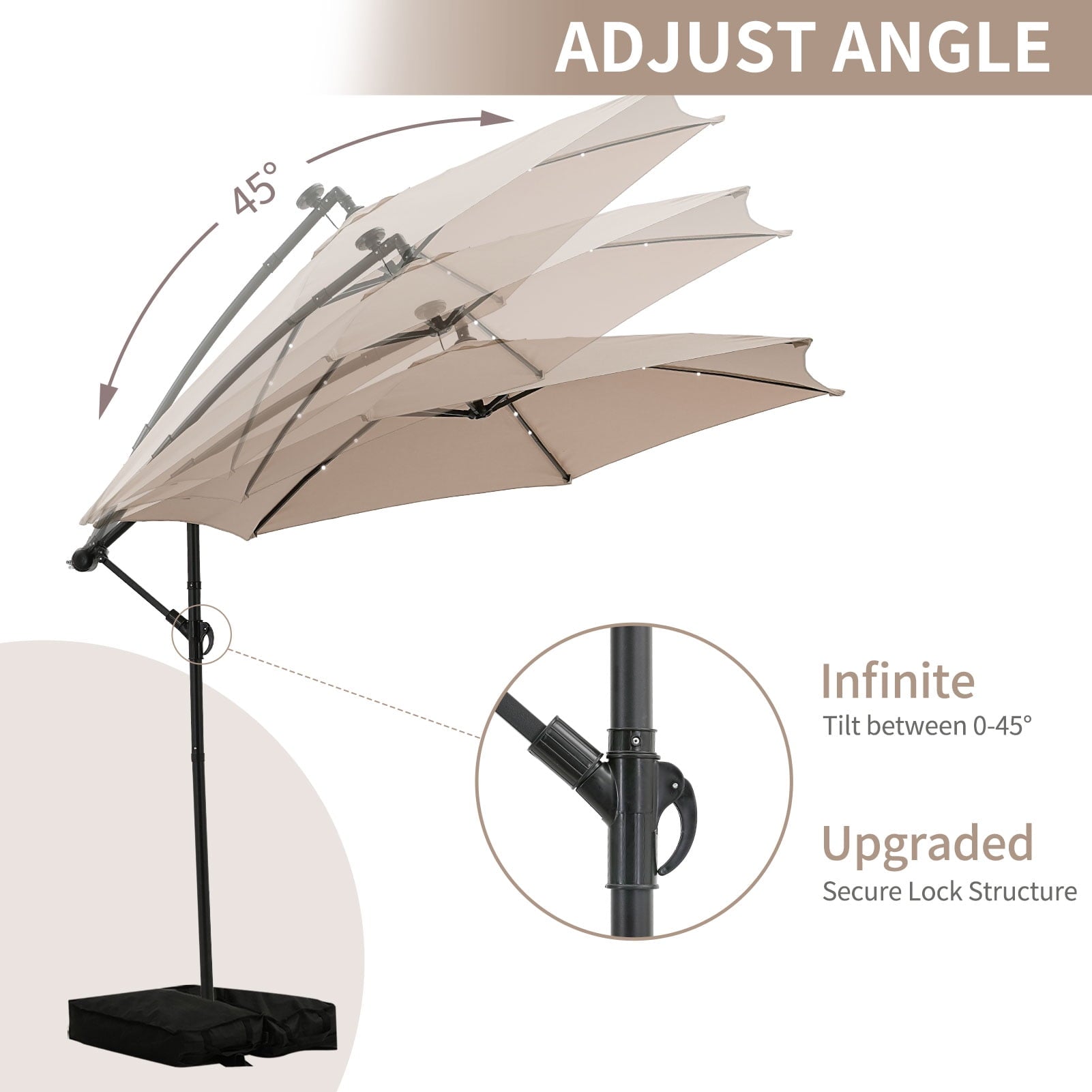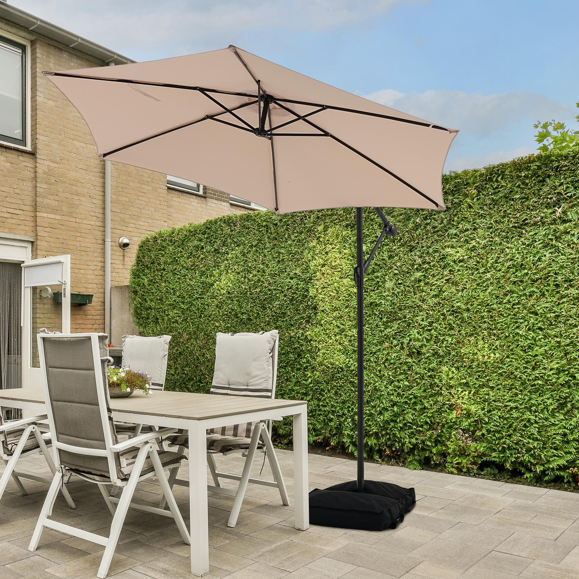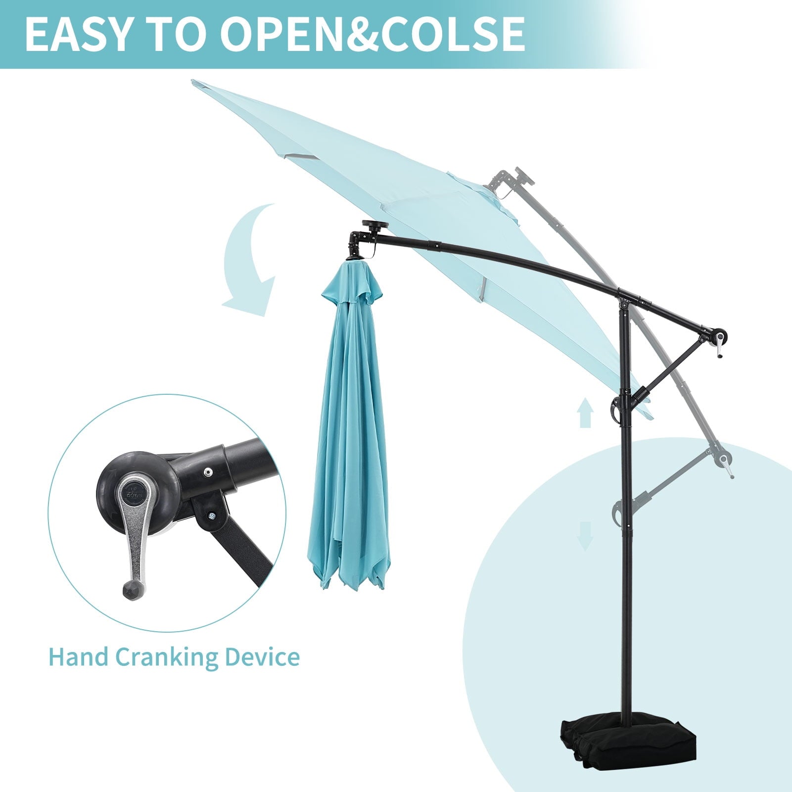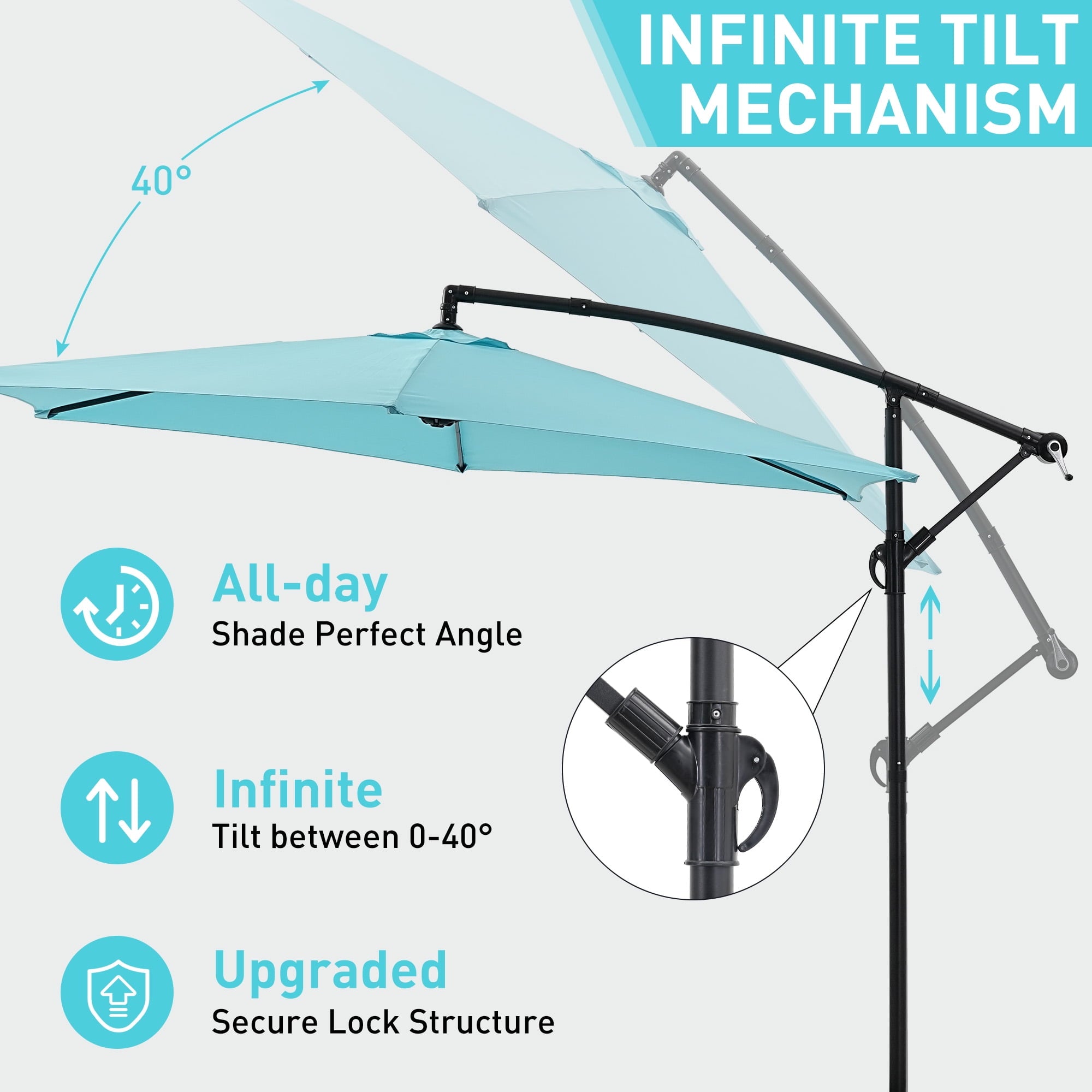 - ☂Elegant offset hanging design with handle crank and cantilever operation system make it’s easily opens and close the patio umbrella. A smooth gliding handle and tilt settings allow you to adjust the shade and block the sun at various angles, keeping the area protected throughout the day.