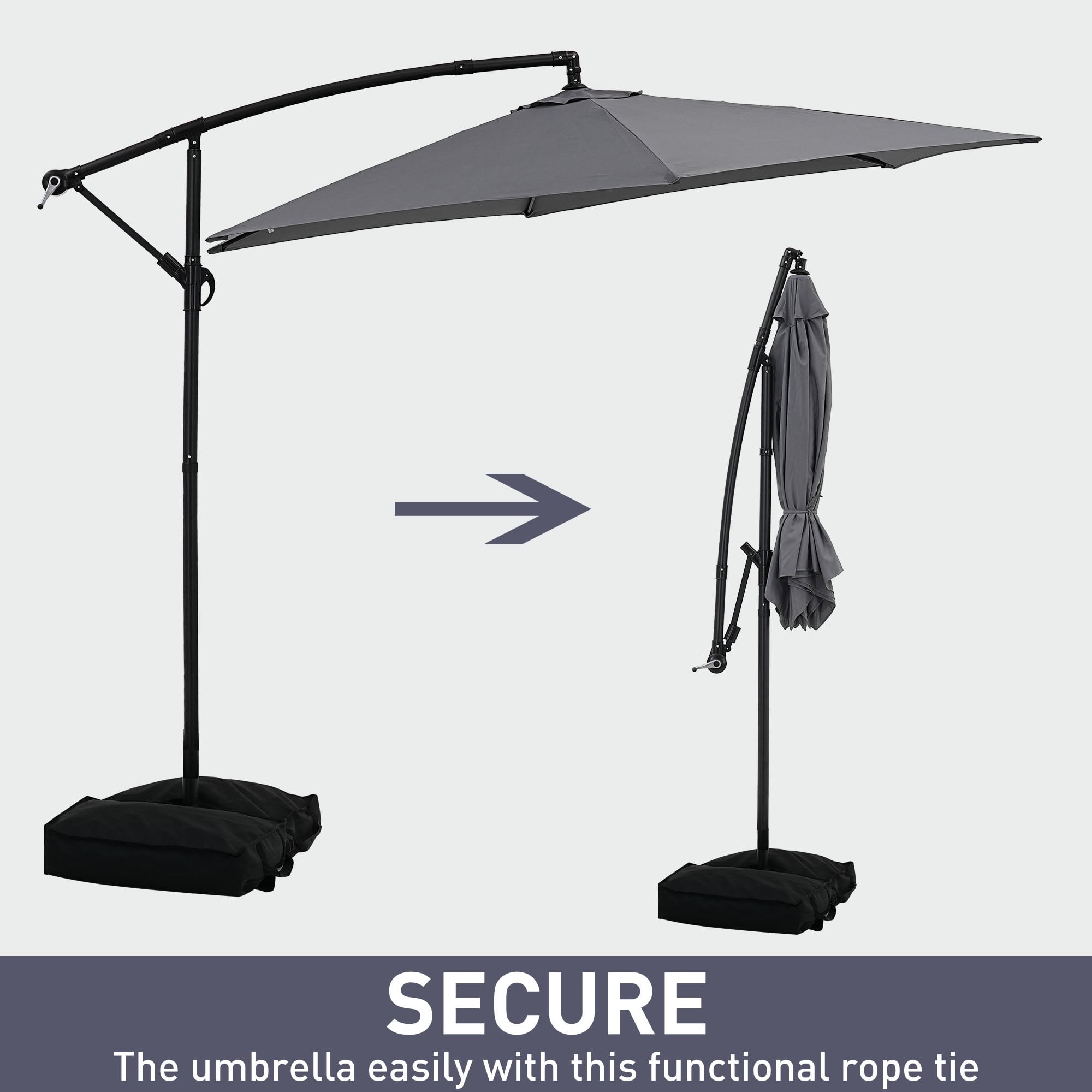 - ☂Ainfox 10ft outdoor patio umbrella is made of all-iron umbrella bones powder coated steel pole against rust, corrosion, chipping and peeling. 6 steel ribs on the top of the cantilever umbrella to keep it’s shape, the cross base and The weight sandbag base(included) provides superior strength support.