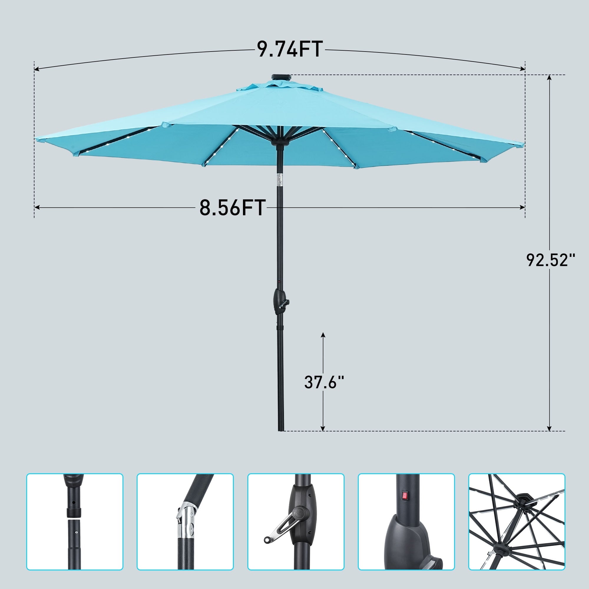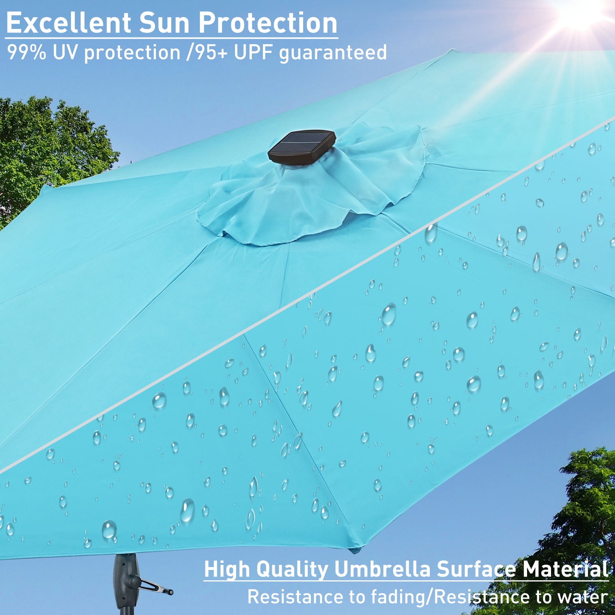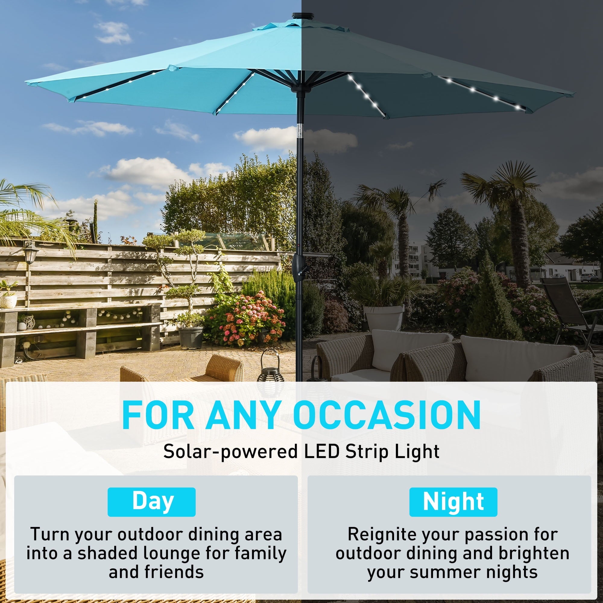 - Elevate your outdoor experience with our 10 ft solar-powered LED umbrella, perfectly designed for a 6-person table or two lounge chairs. Whether it’s day or night, its innovative design provides essential shade during sunny days and vibrant illumination for evening gatherings, while the skylight enhances airflow and keeps you cool all summer long.