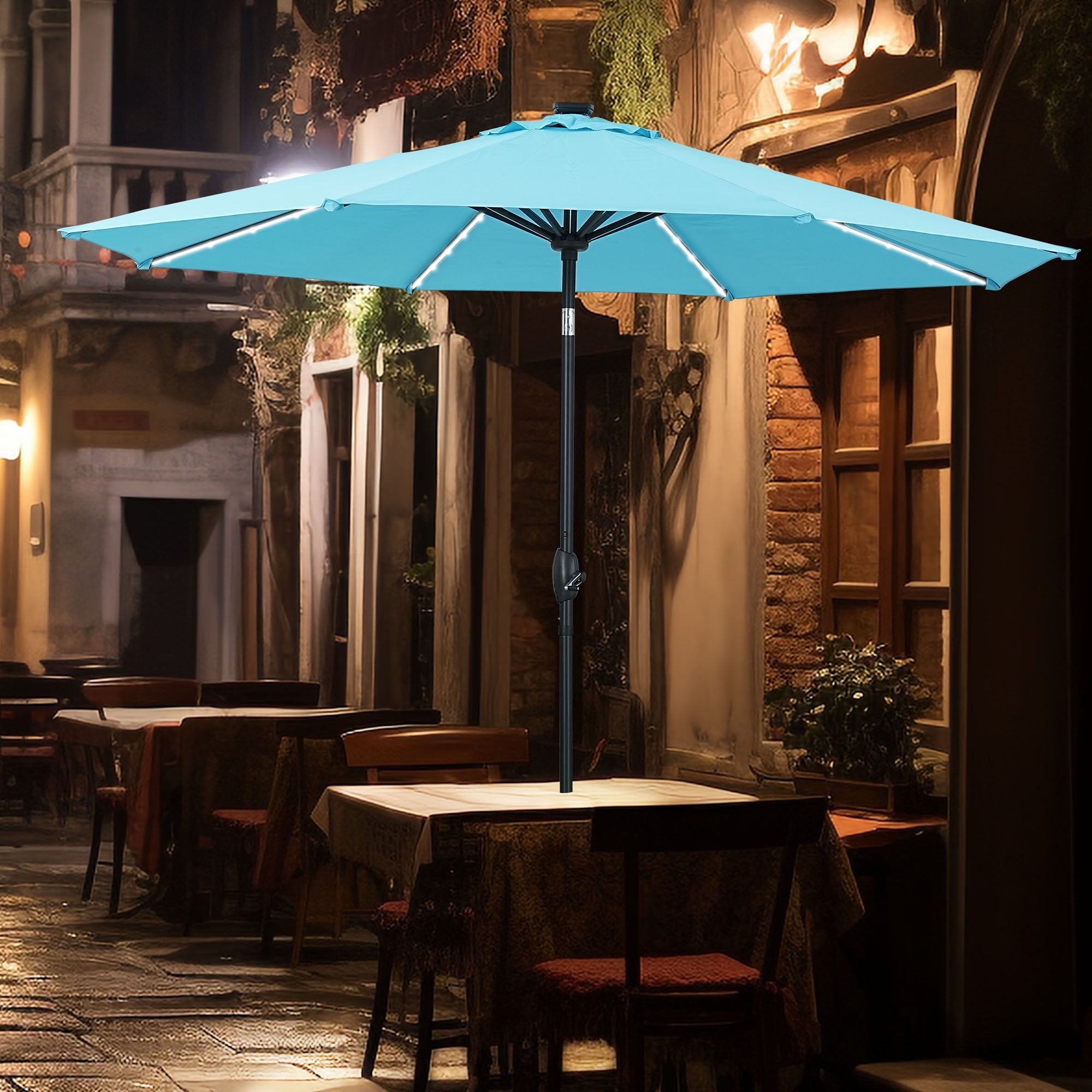 - Enjoy your evenings under the stars with our energy-efficient patio umbrella featuring 8 built-in solar-powered strip lights. After a full day of sun exposure, you can illuminate your outdoor area for up to 5 hours without the need for electricity or cumbersome power cords, allowing for relaxation after dark.