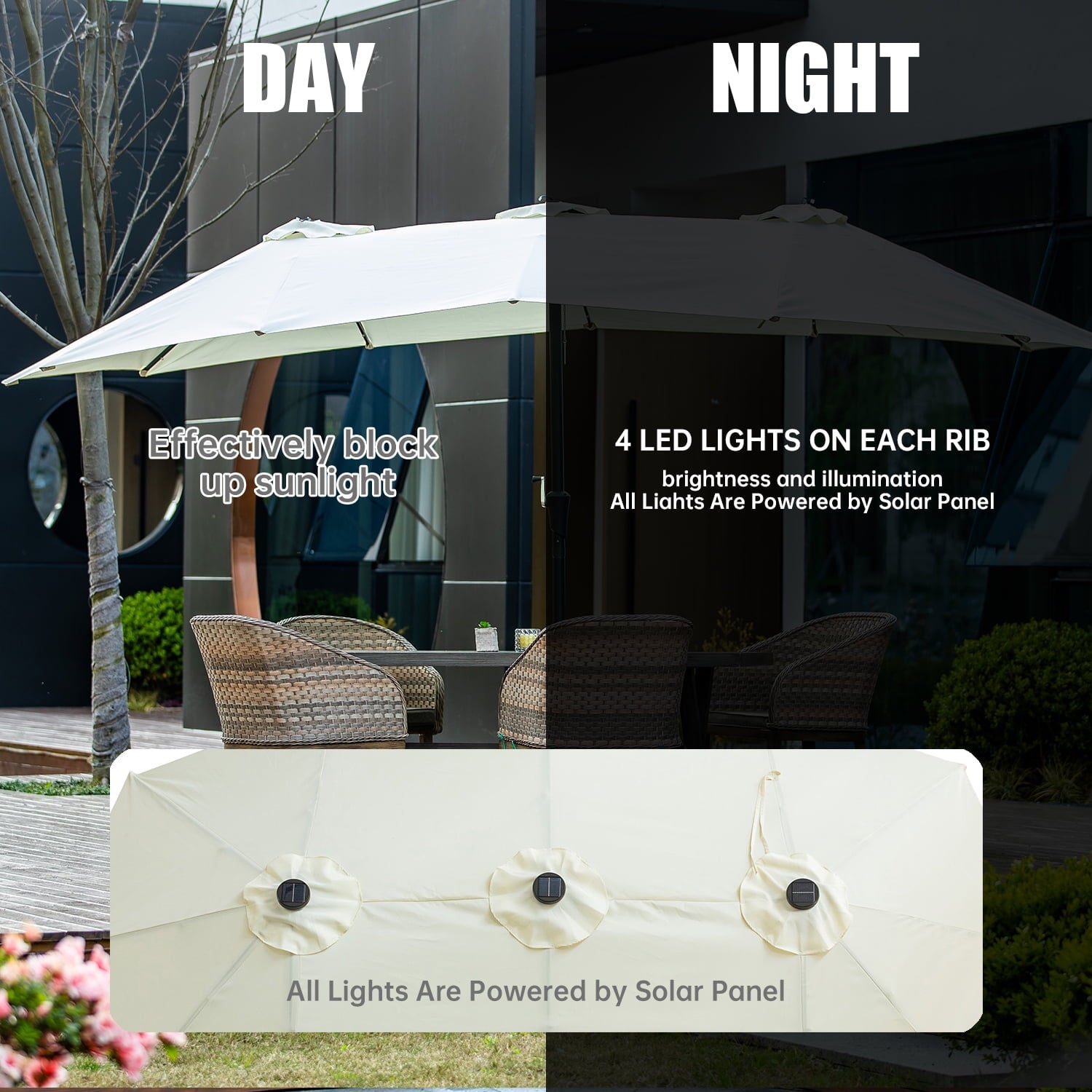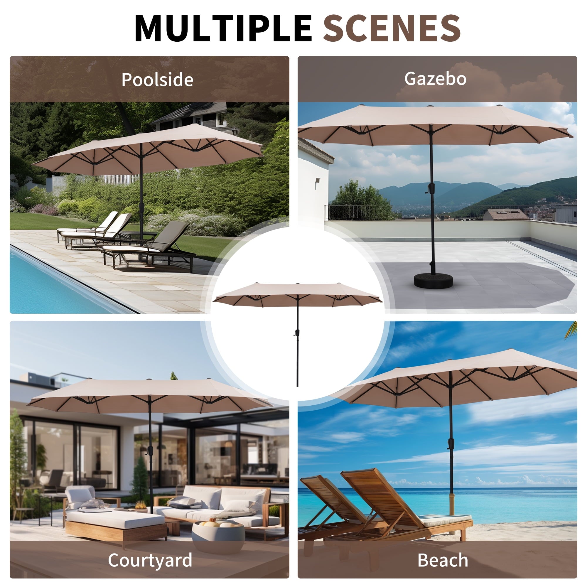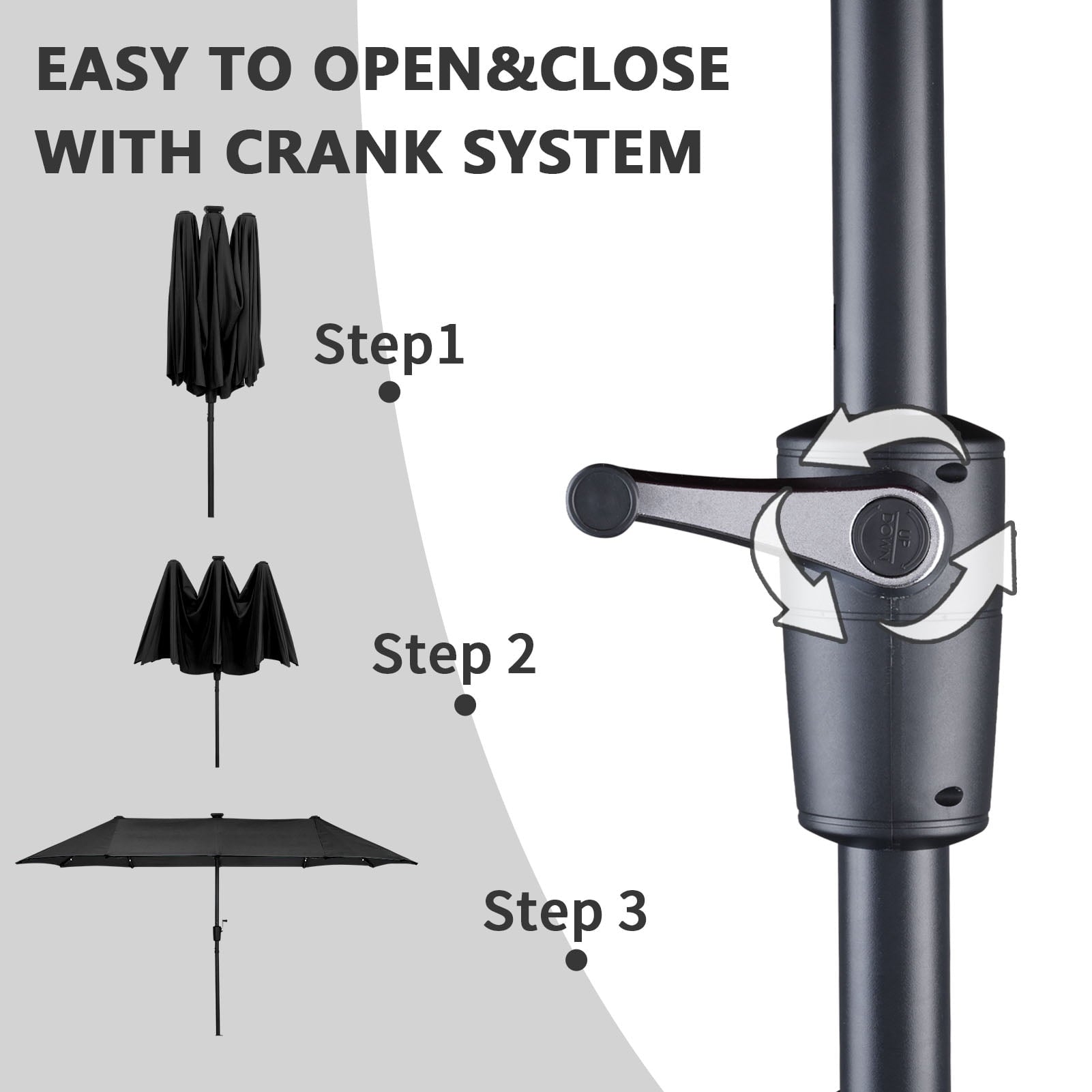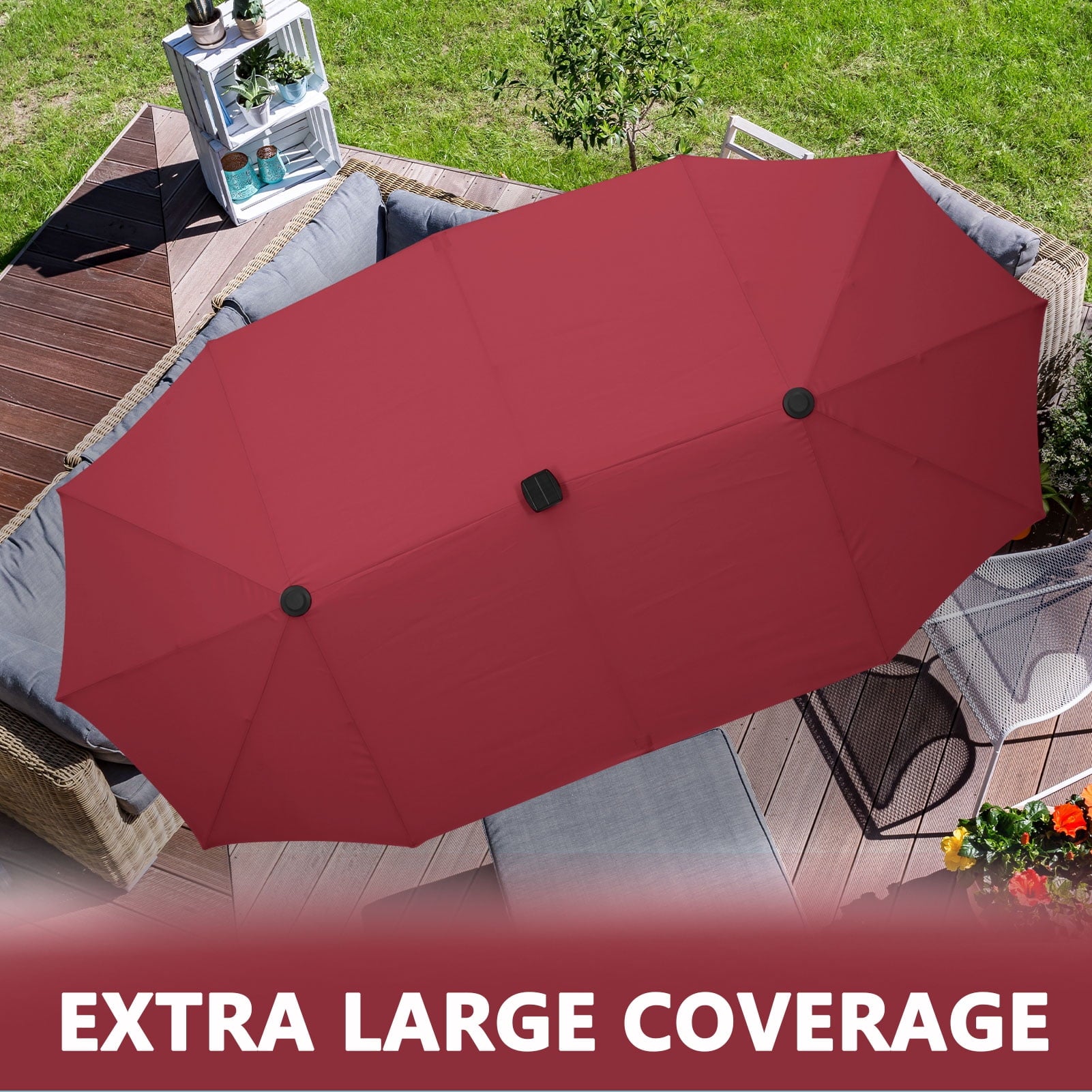 • 【Stable Structure Design】This outdoor umbrella is made of powder coated steel pole and 12 sturdy heavy duty square ribs that provide optimal support for the large double-sided canopy.Even better, safe latch design for better-fixed canopy.