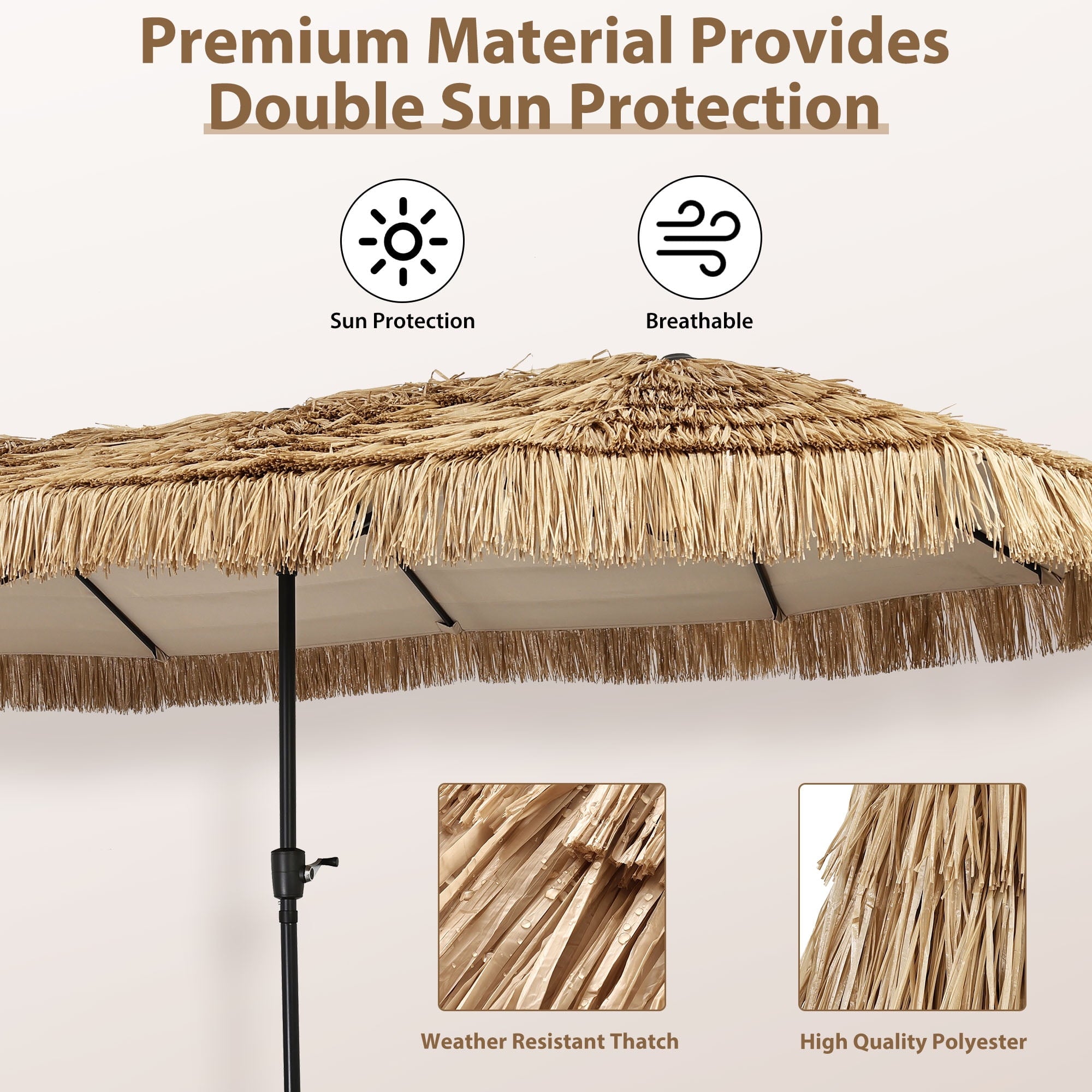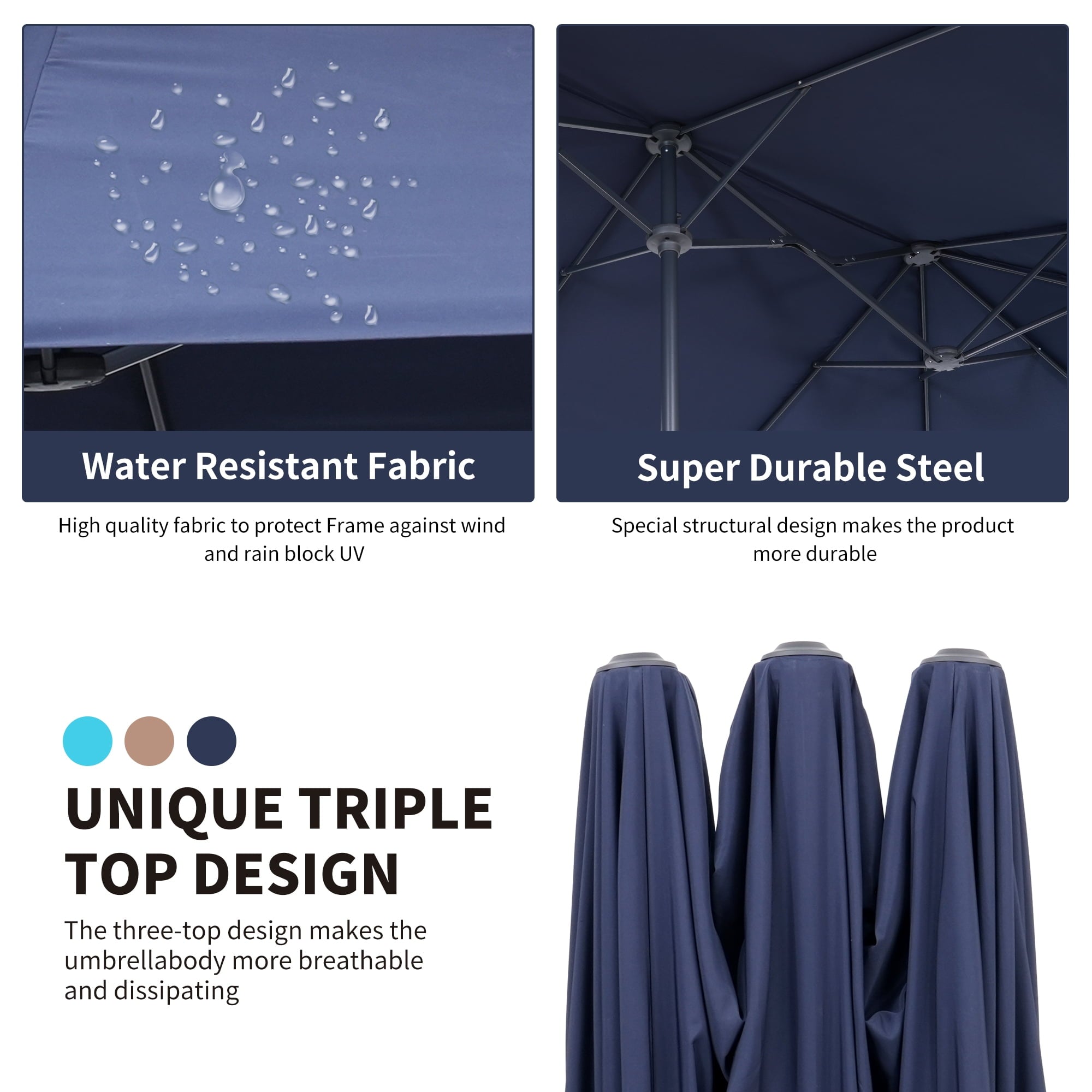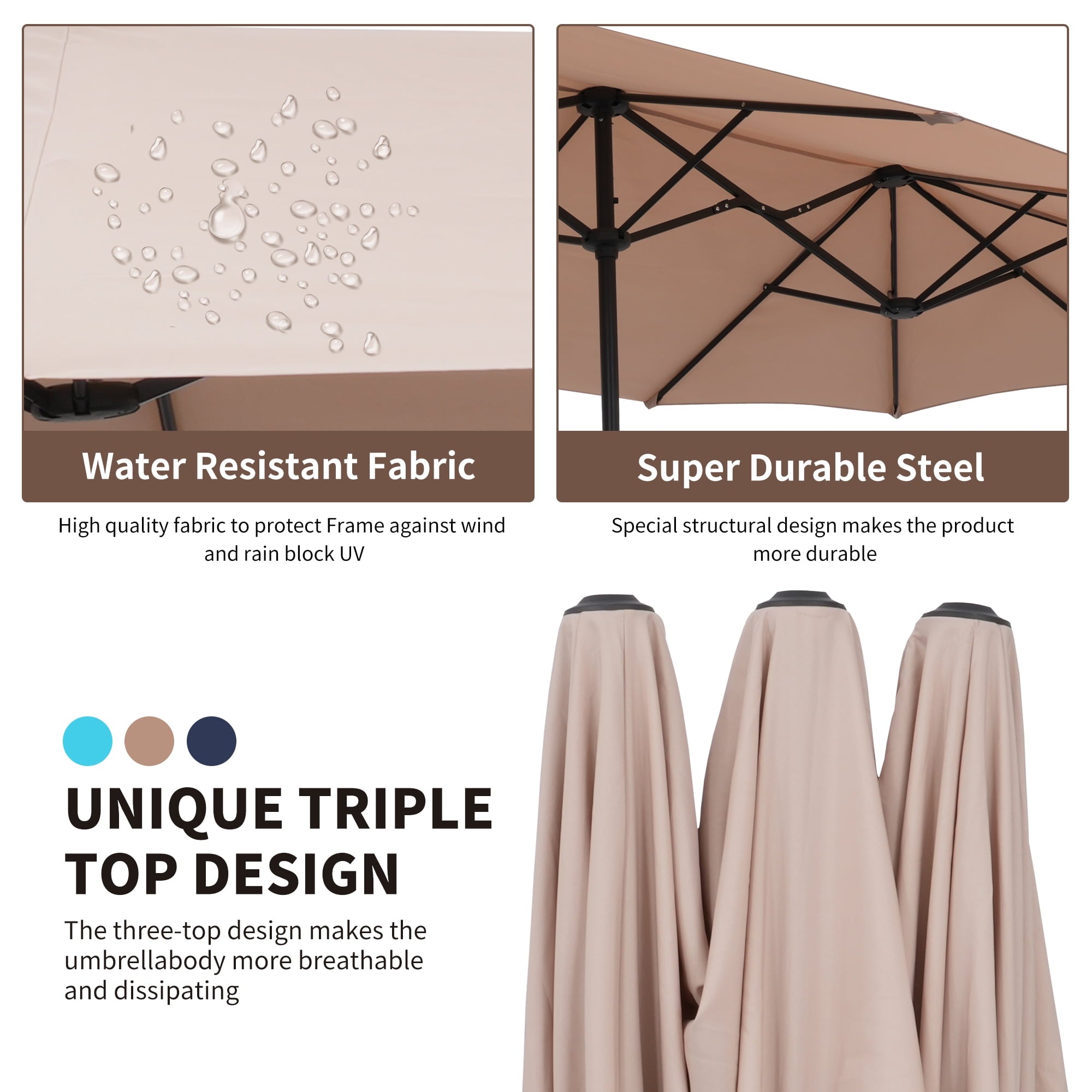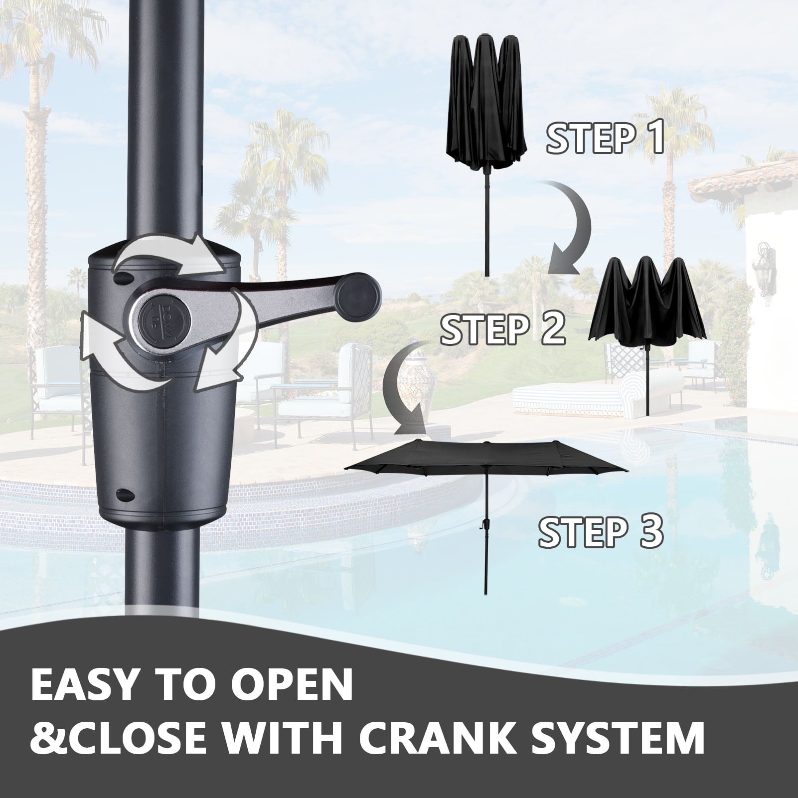 • 【Stable Structure Design】This outdoor umbrella is made of powder coated steel pole and 12 sturdy heavy duty square ribs that provide optimal support for the large double-sided canopy.Even better, safe latch design for better-fixed canopy.