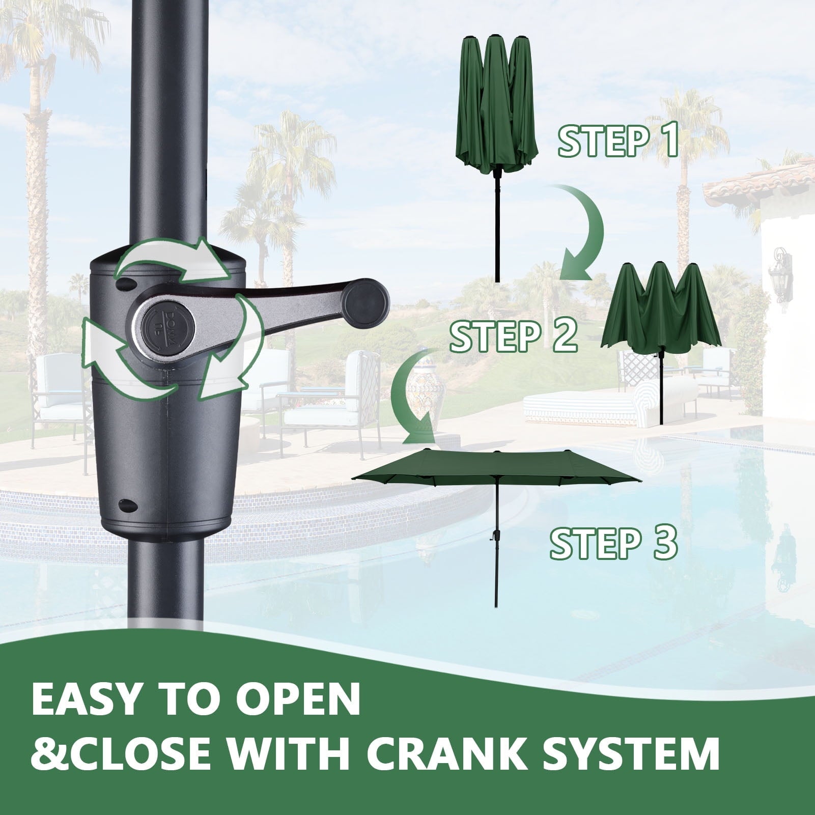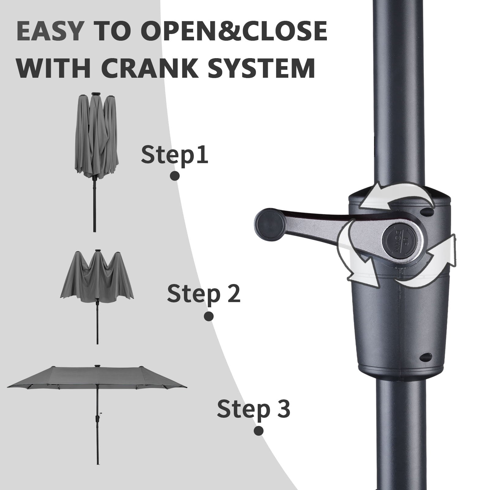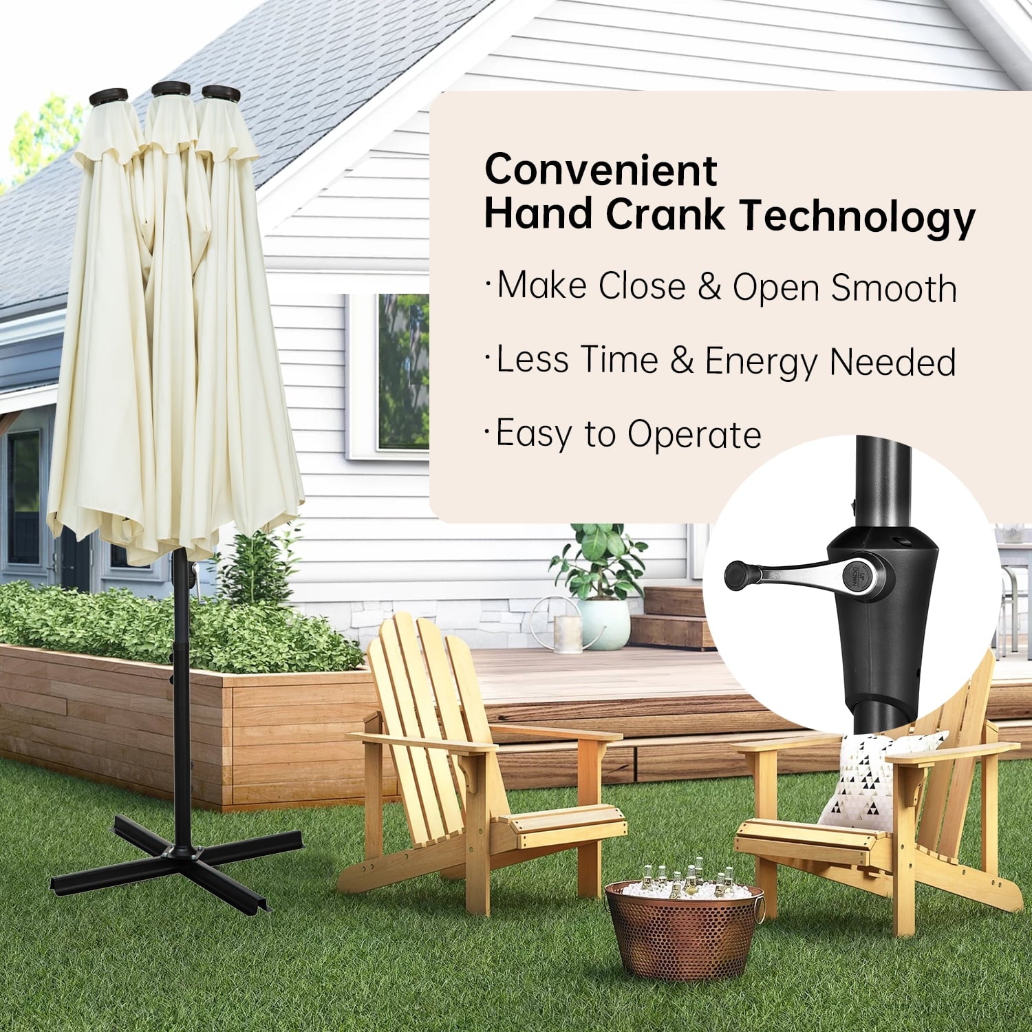 • 【Practical crank system】Ainfox large patio umbrella is designed for easiest control, Smooth opening and adjustment, simple assembly required. With the integrated crank Lift, you can open and close the umbrella smoothly. Plus, it also features three wind vents on top to allow for air to flow and keep stability.