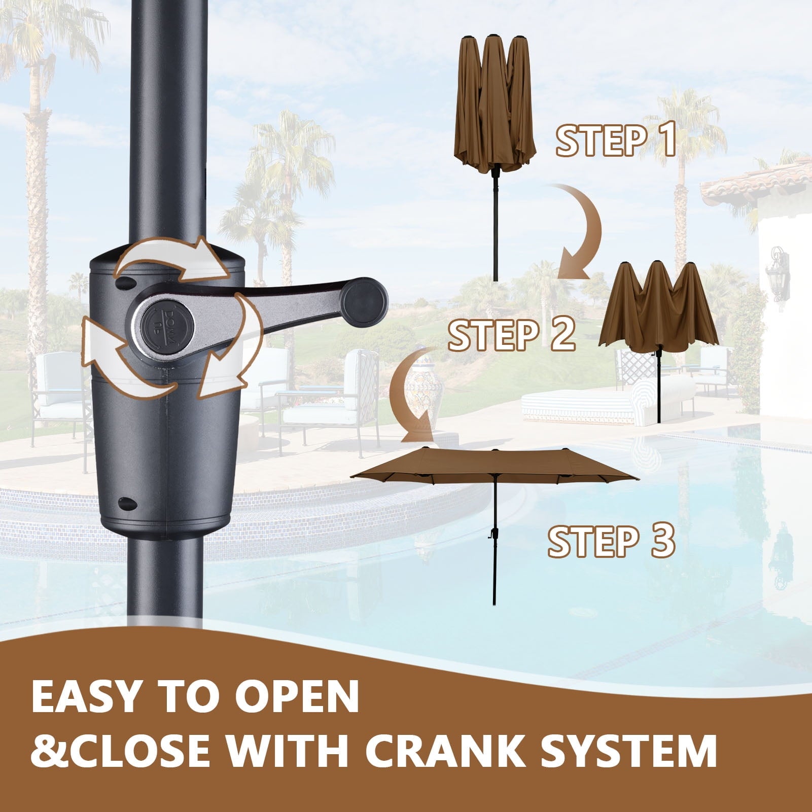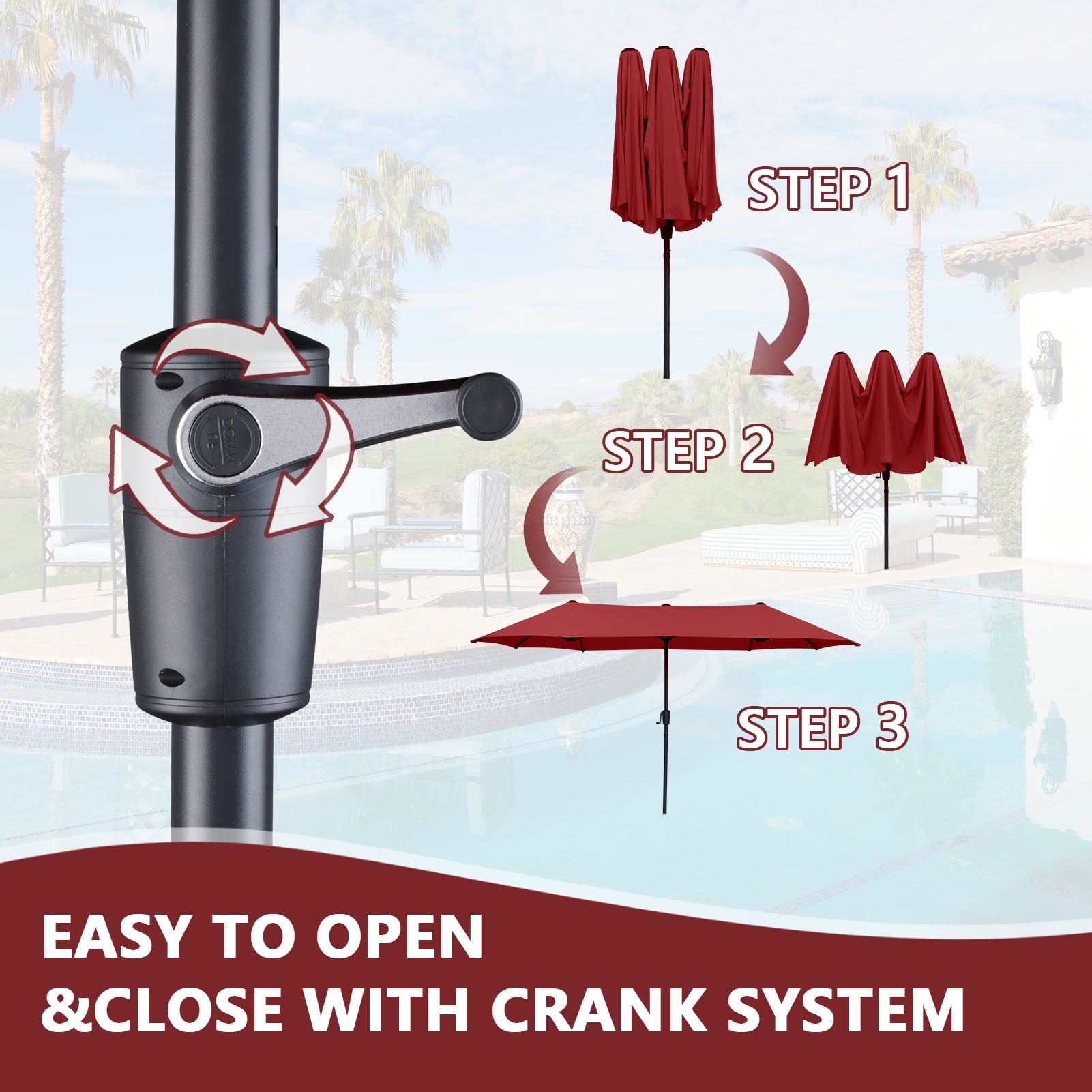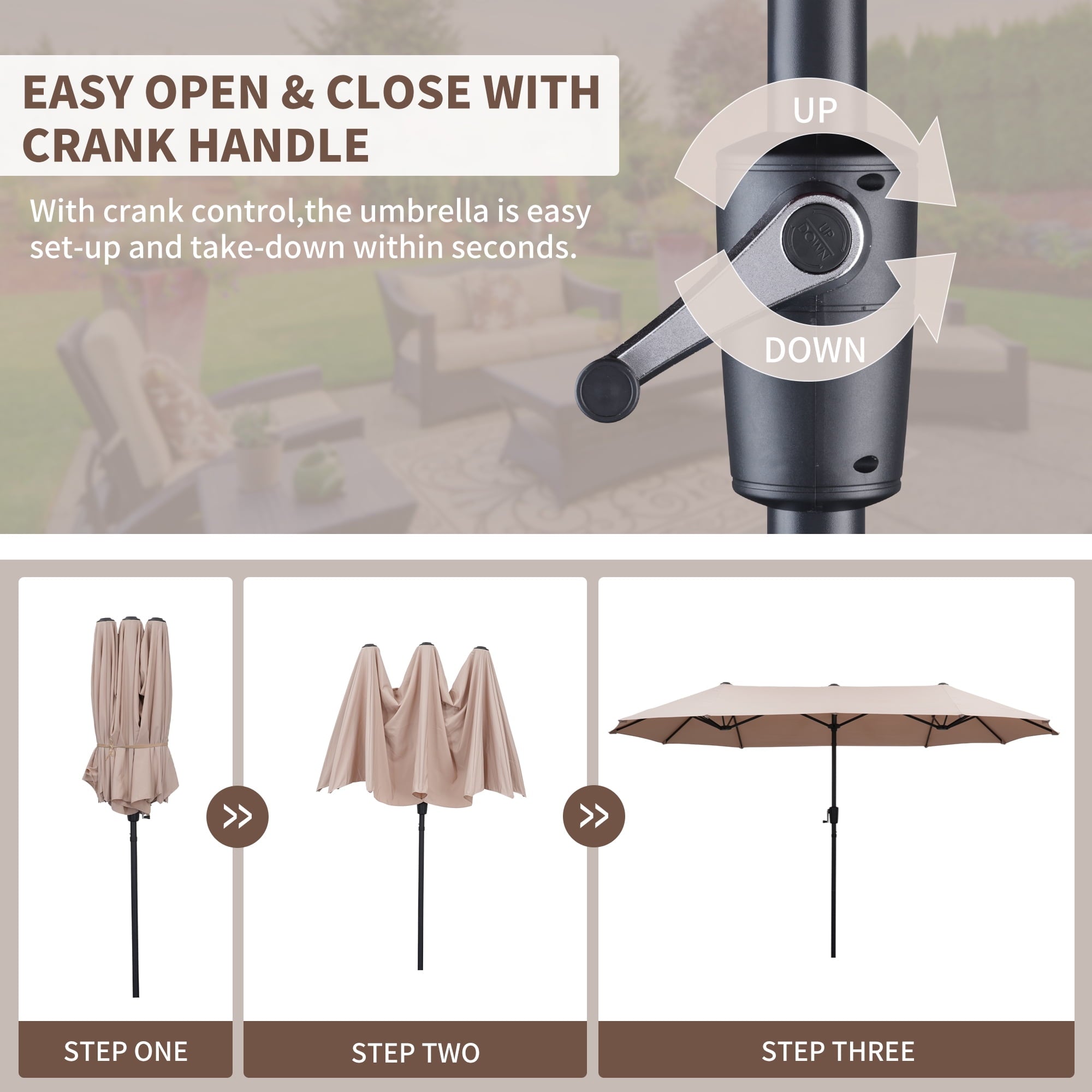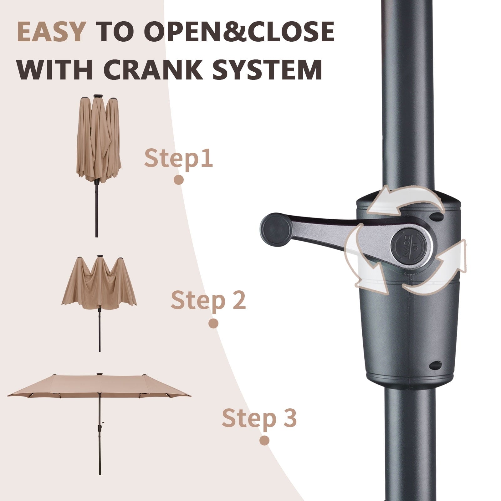 • 【Practical crank system】Ainfox large patio umbrella is designed for easiest control, Smooth opening and adjustment, simple assembly required. With the integrated crank Lift, you can open and close the umbrella smoothly. Plus, it also features three wind vents on top to allow for air to flow and keep stability.