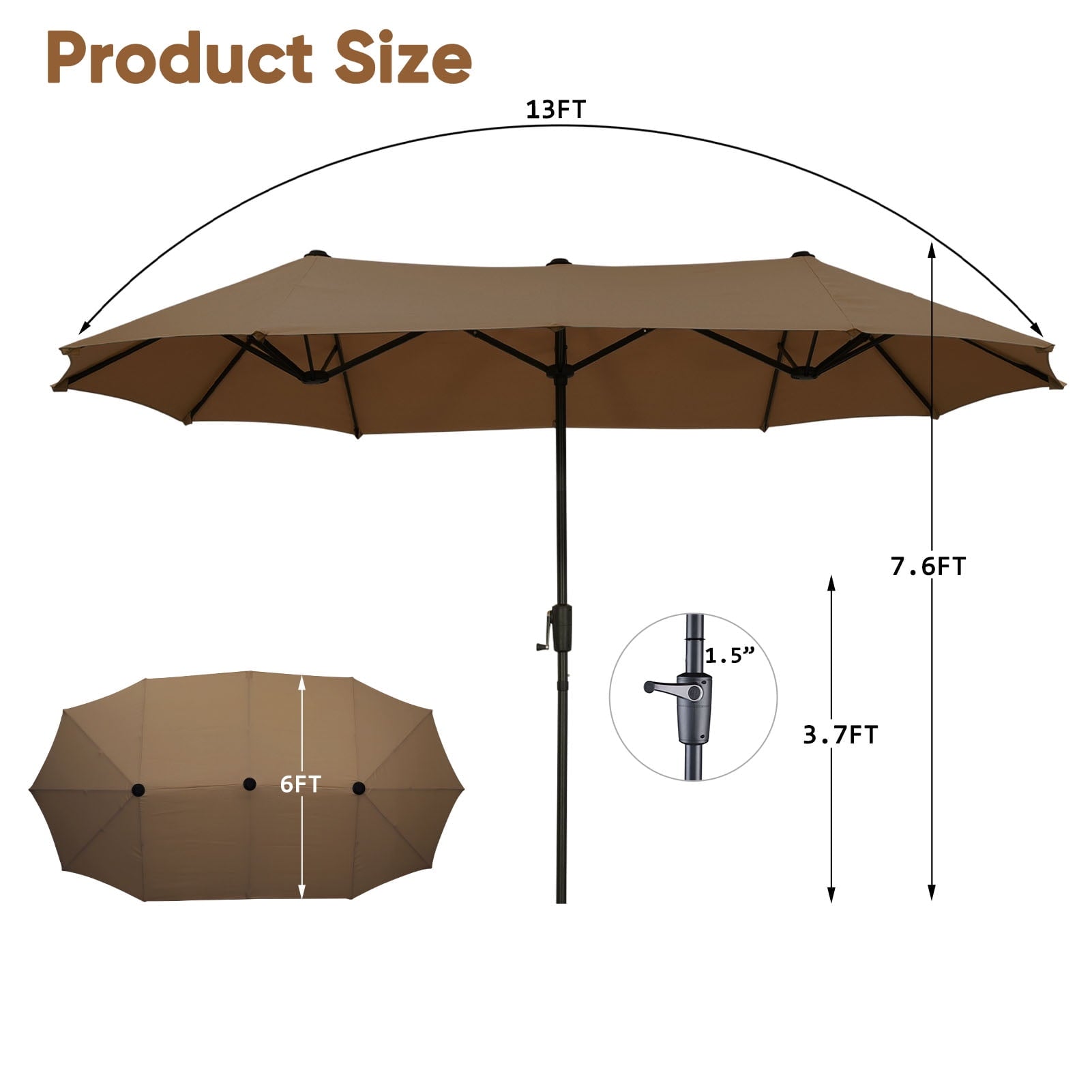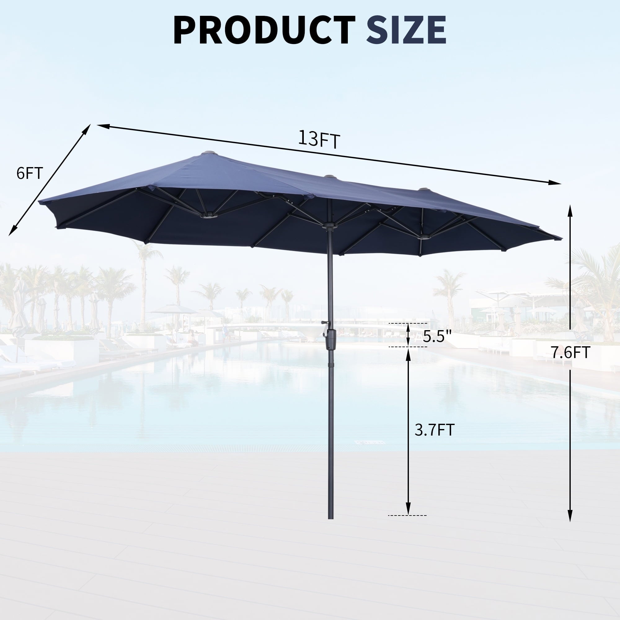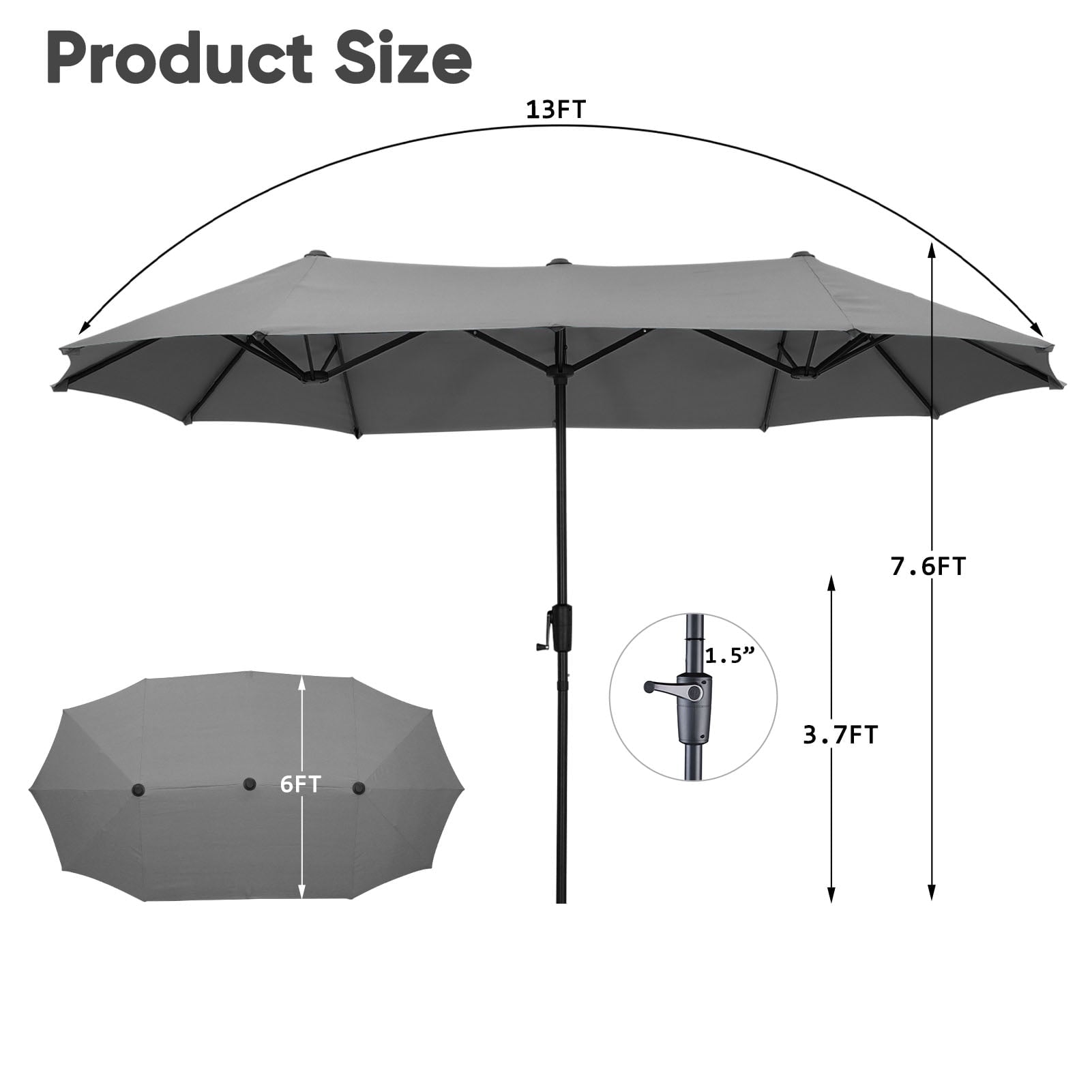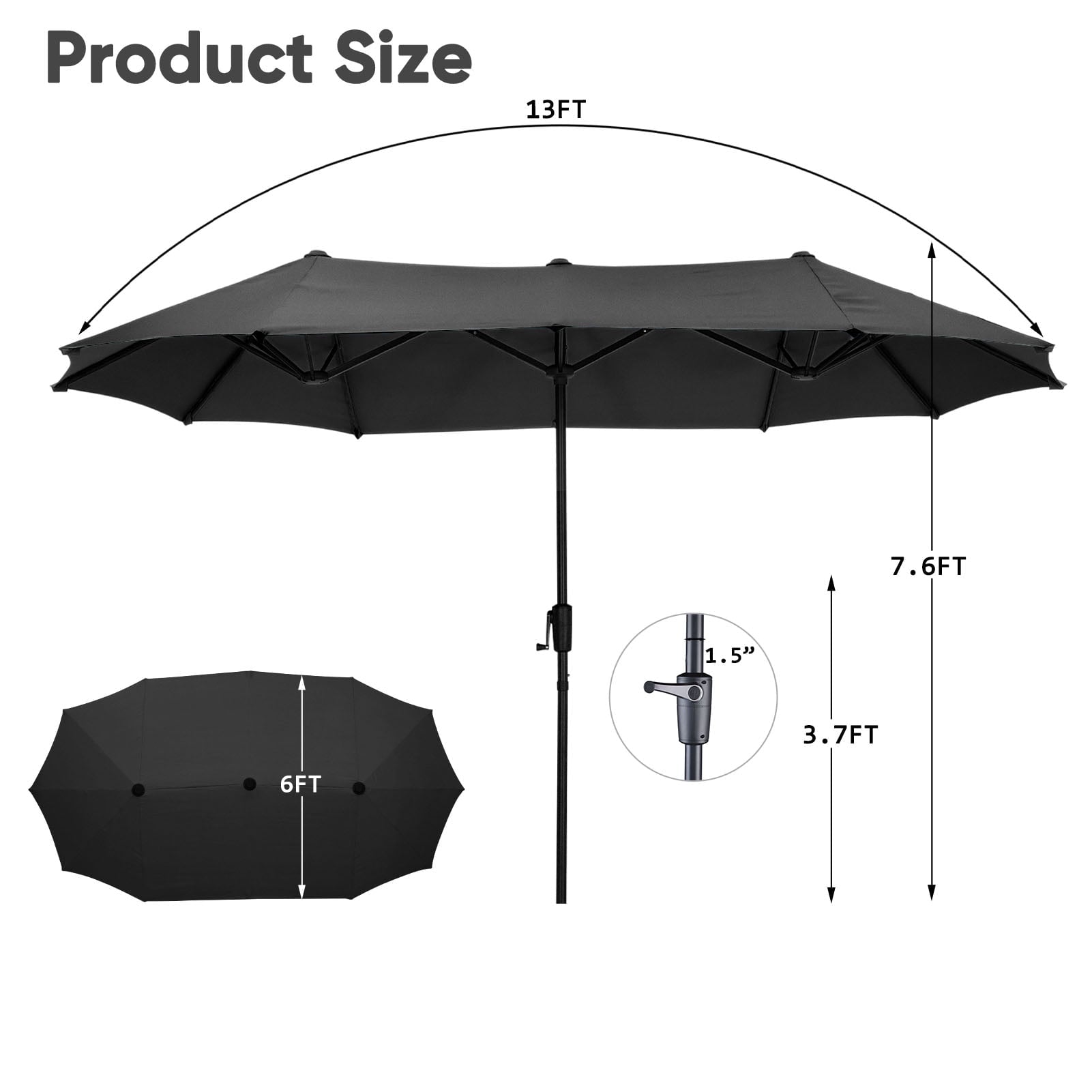 3. 13 ft(L) x 6ft (W) x 7.6Ft (H) ft Provides Added Shade with its large Double-sided,Umbrella Suit for Big Patio Sofas.