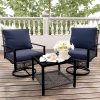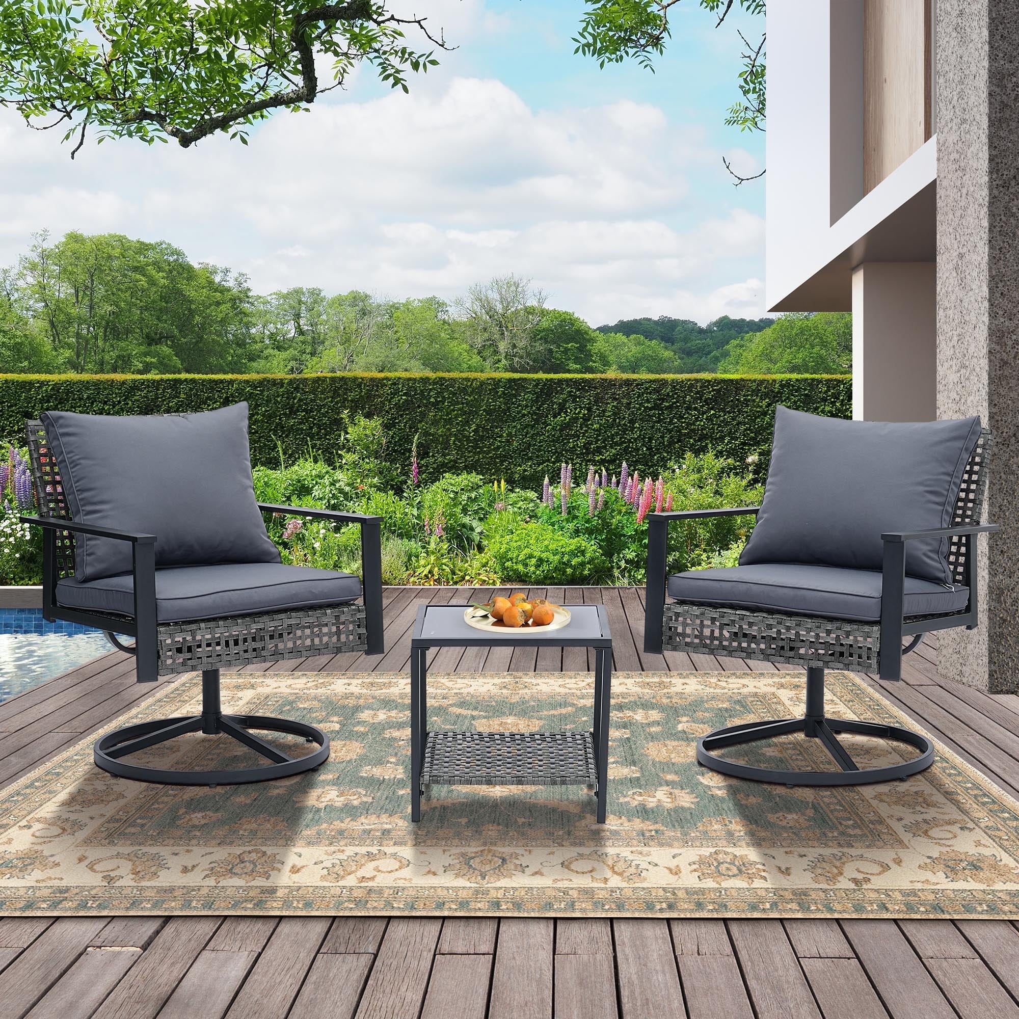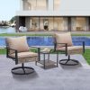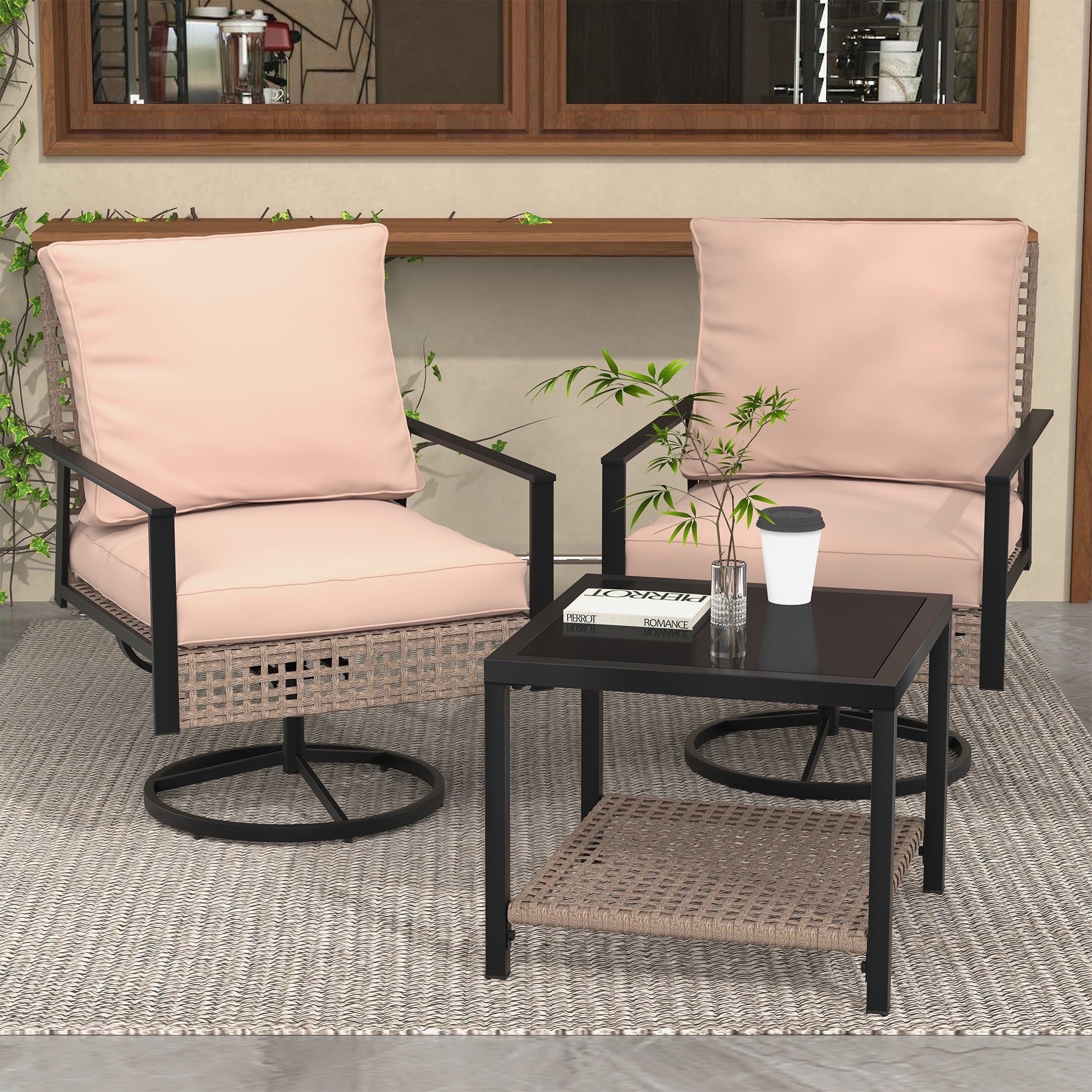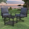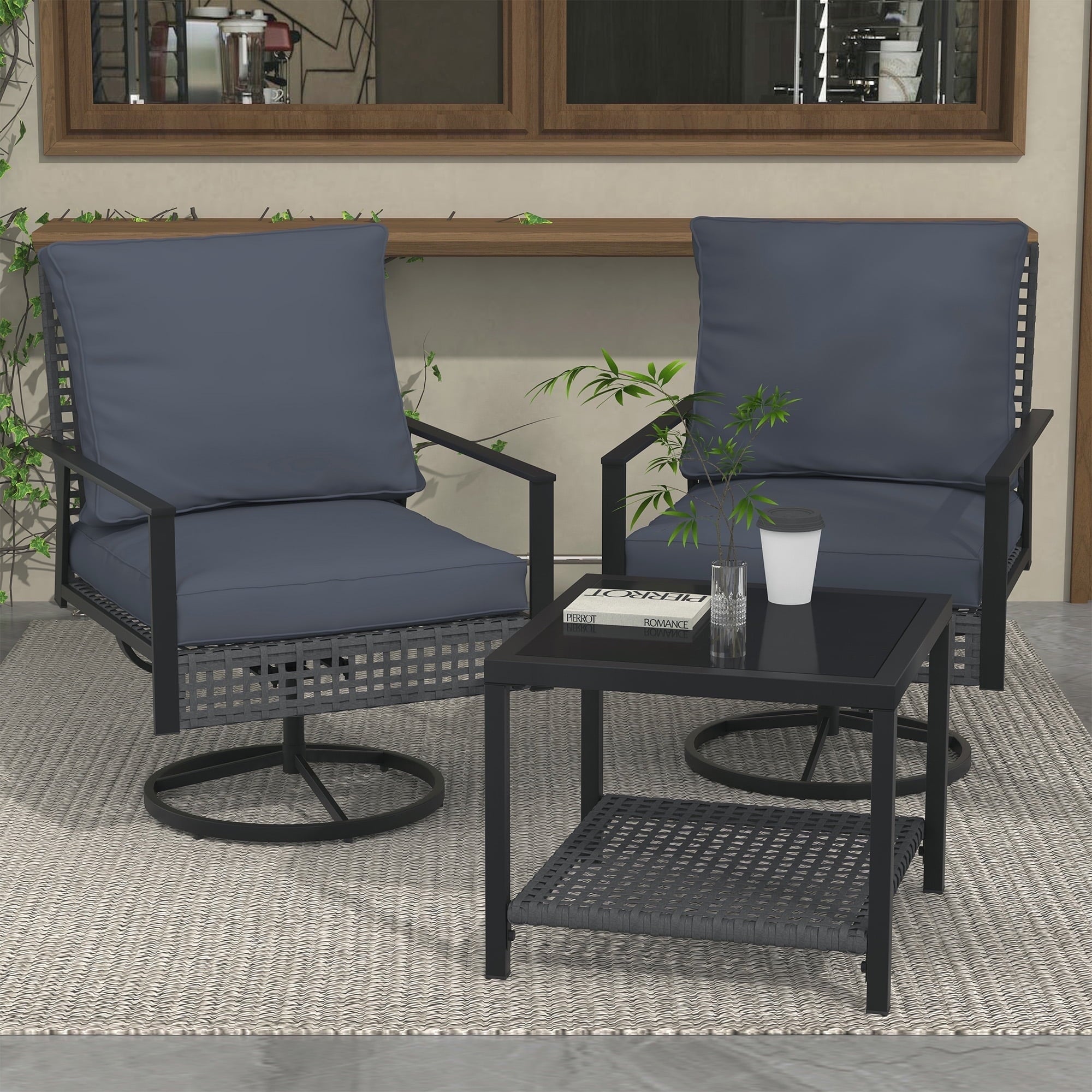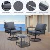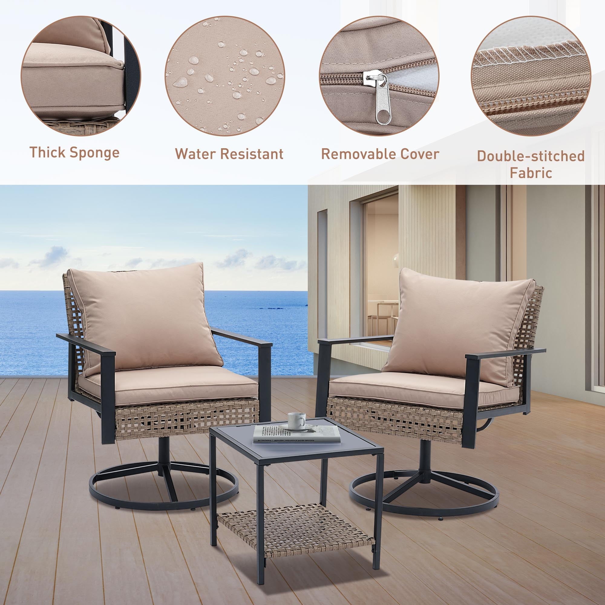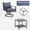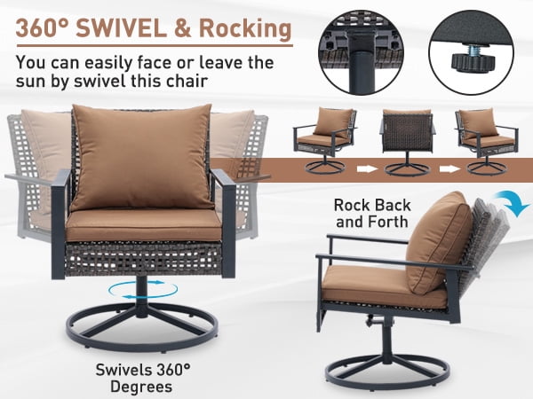 - ✔ 【Stylish & Space-Saving Design】 – Includes 2 swivel glider chairs(26” x 28”x 32”)+ 1 tempered glass-top coffee table (18‘’ x 18‘’ x 17‘’). Perfect for small patios, balconies, decks, or porches.
