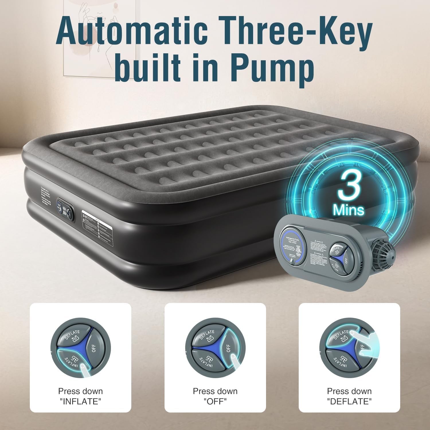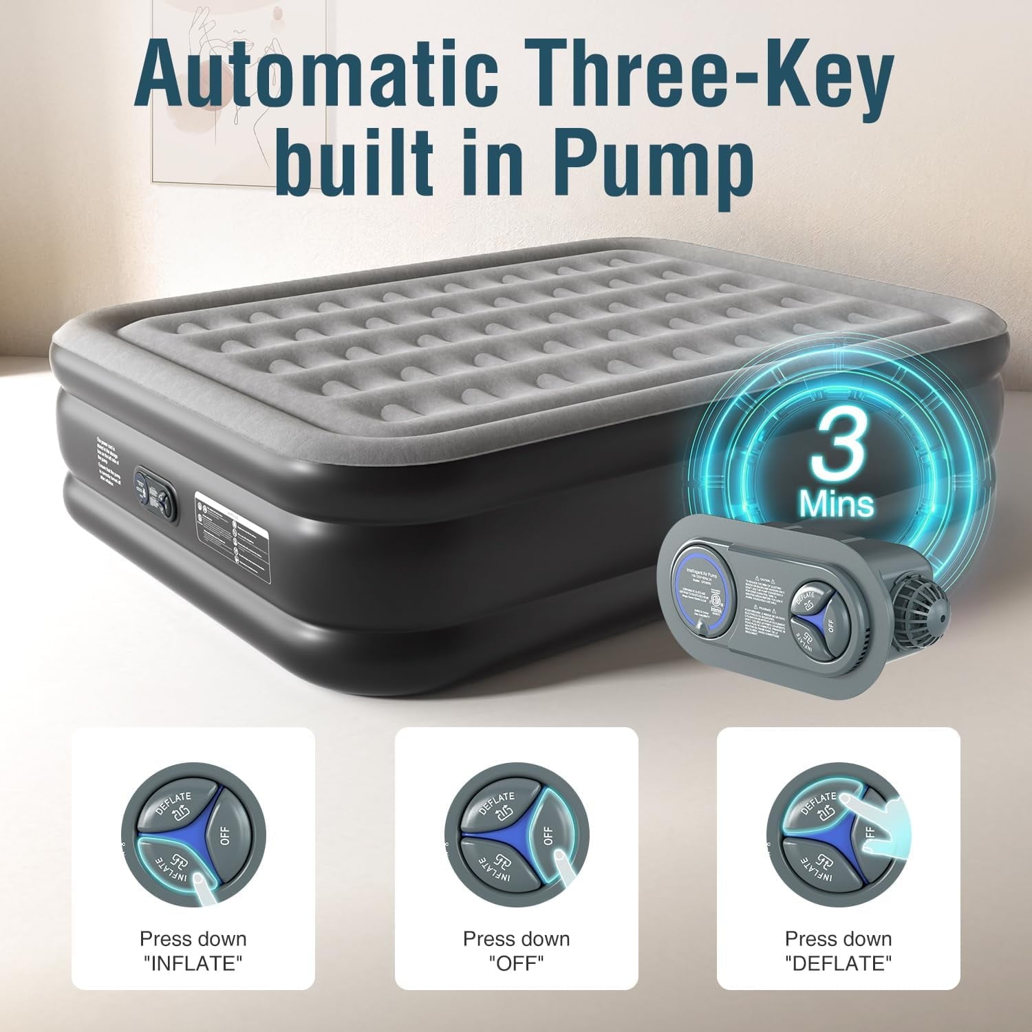 - Quick in- and deflation: This air mattress equipped with a charging plug. You just plug and supply it 110 V power, and then press or turn the knob to the “INFLATE”, wait for nearly 3 minutes, the inflatable mattress will automatically finish inflating.
