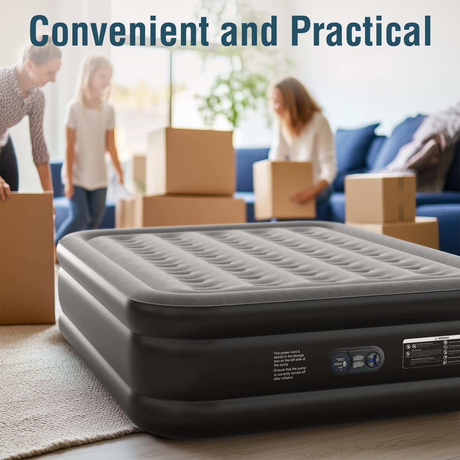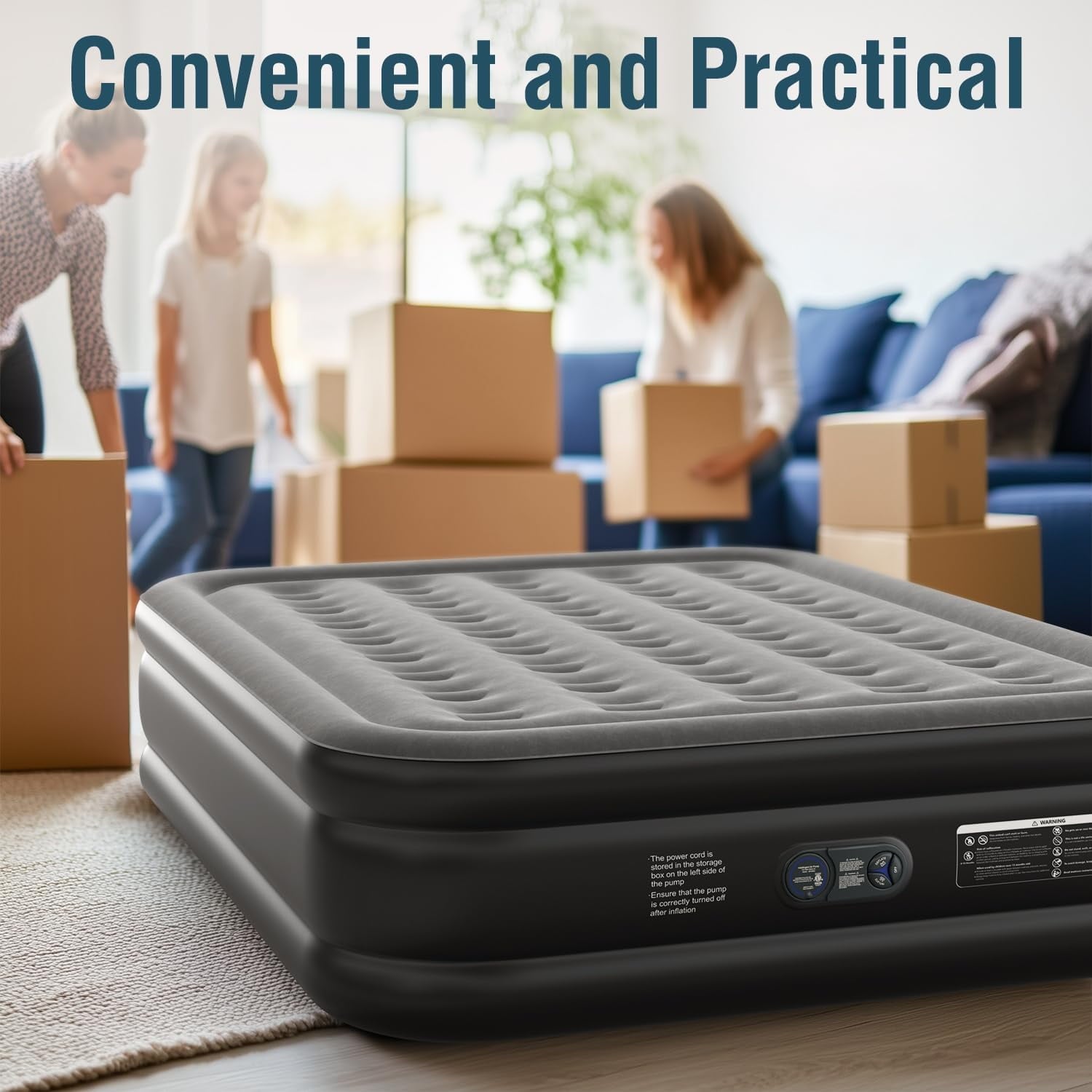 - Non-slip and Stabil Design: The ground part of the Queen Size Inflatable Mattress is designed with a suction cup structure, which can hold the ground firmly. Even though you sit on the edge of the Air Mattress and move around, the Queen Air Mattress with pump always stays balanced and stable.