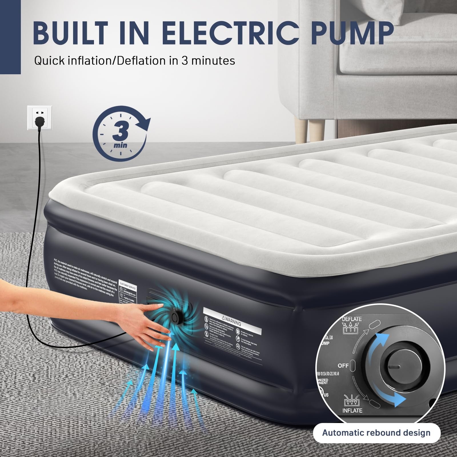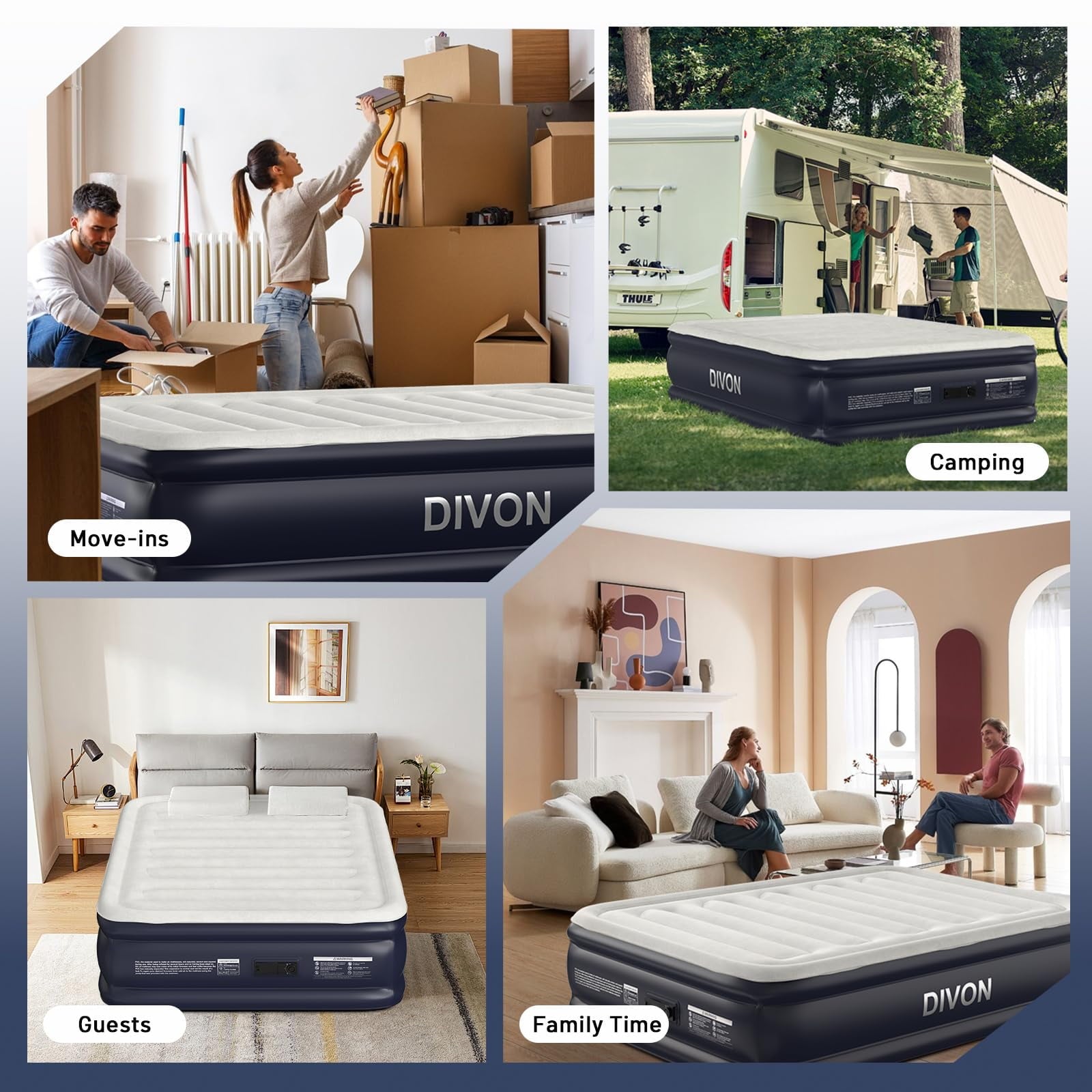 - 【Convenient Built-In Electric Pump】DIVON air mattress full is equipped with a built-in 110V electric pump,just turn the knob can quietly full inflates/deflation the blow up mattress in just 2 minutes .you can always rotary knob for a few seconds to inflate or deflate to your desired comfort level! After use, easily store the power cord into the storage box,effortless to set up and packIng