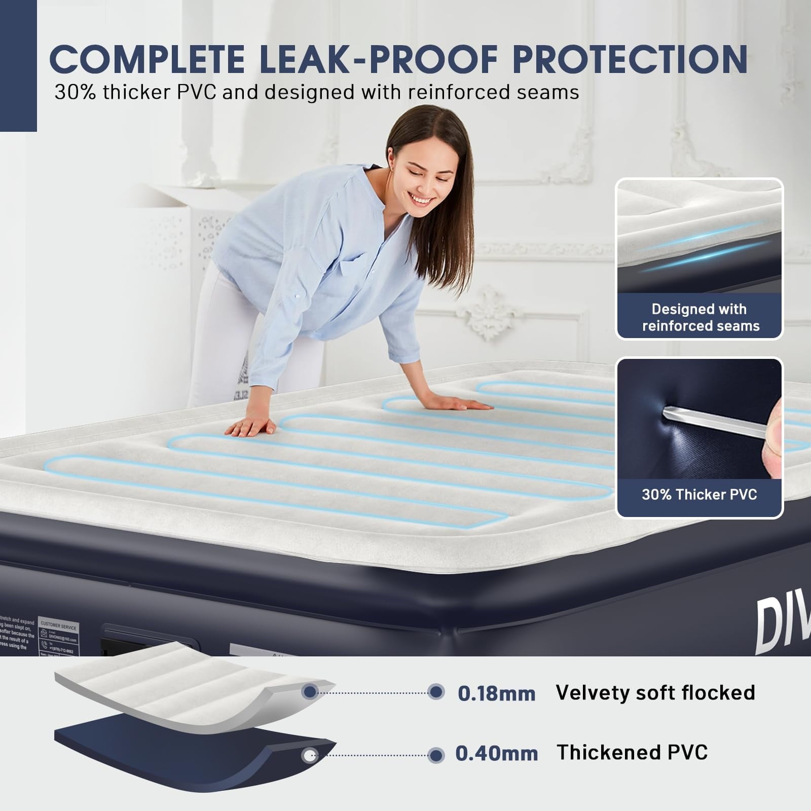 - 【Luxuriously Comfortable Waterproof Flocked Top】DIVON Full Air Mattress features a velvety, waterproof flocked surface that’s soft, easy to wipe clean, and provides ultimate comfort for restful sleep every night. Experience an unparalleled sleeping experience with its luxurious design