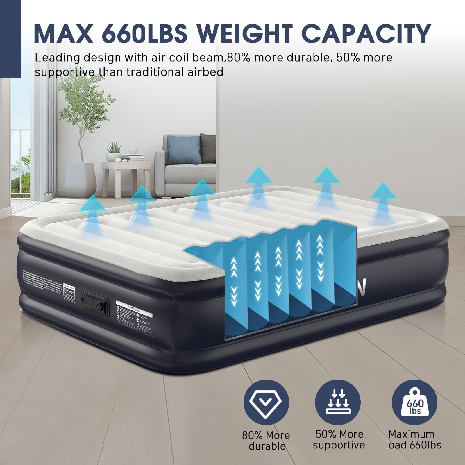 - 【Patented Vertical Beam Construction(U.S.Pat. #US012108880B2) & Exceptional Stability】Built with innovative Patented internal construction using thousands of high-strength polyester fibers, this Full size air mattress provides exceptional stability and solid support. It can hold up to 660 lbs without sagging, ensuring the bed retains its shape for both sleeping and lounging,don’t have to worry about it overturning or collapsing