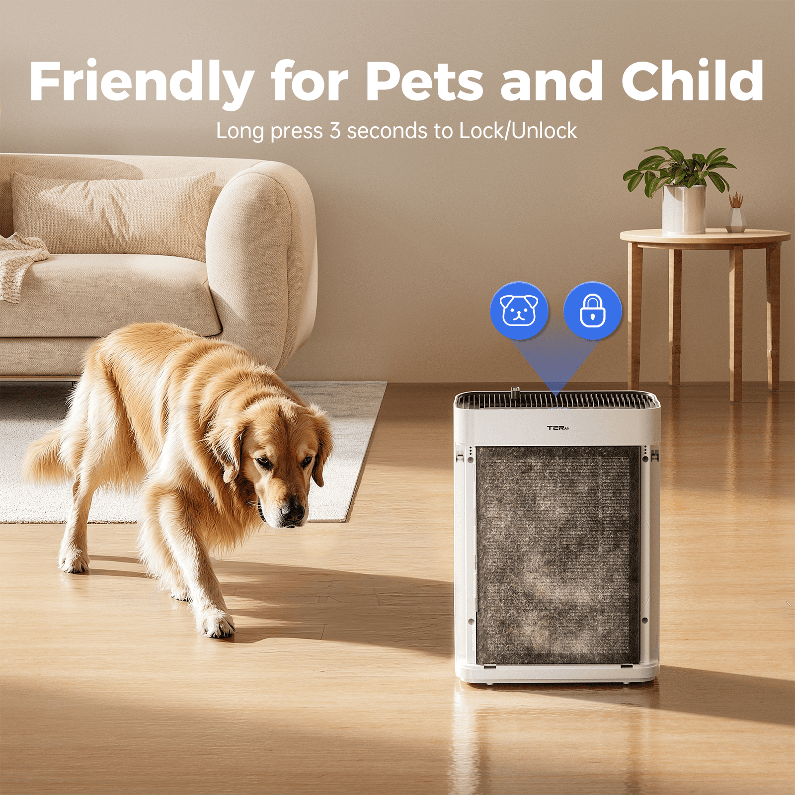 The pet air purifier features a filter replacement alert and a remaining lifespan display. When the filter reaches the end of its life, the replacement indicator light will turn on. We recommend replacing the filter every 3-6 months and using official TER Air filters to ensure optimal performance
