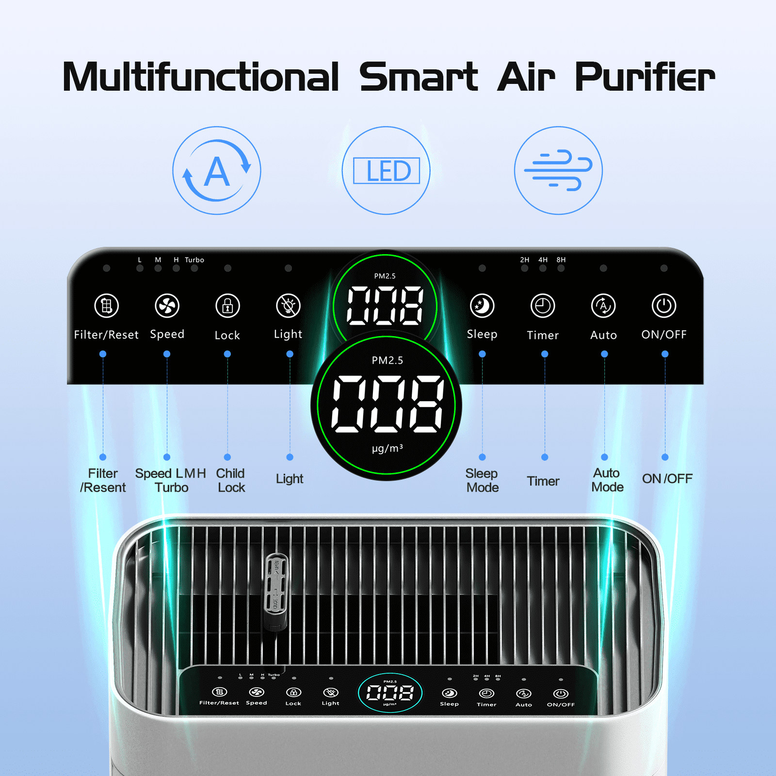 - Double Sided Air Inlet: Purify your air quickly. With a double-sided, super-large air inlet, it offers a stronger purification speed and better purification effect. Achieve super-strong air circulation on both sides.