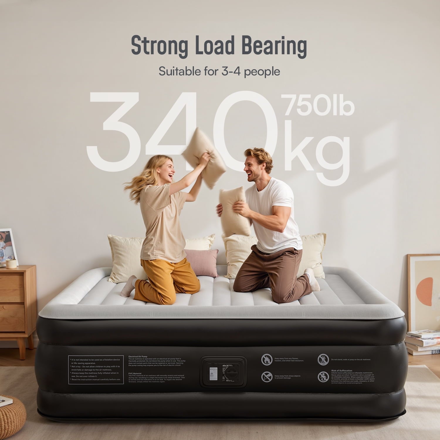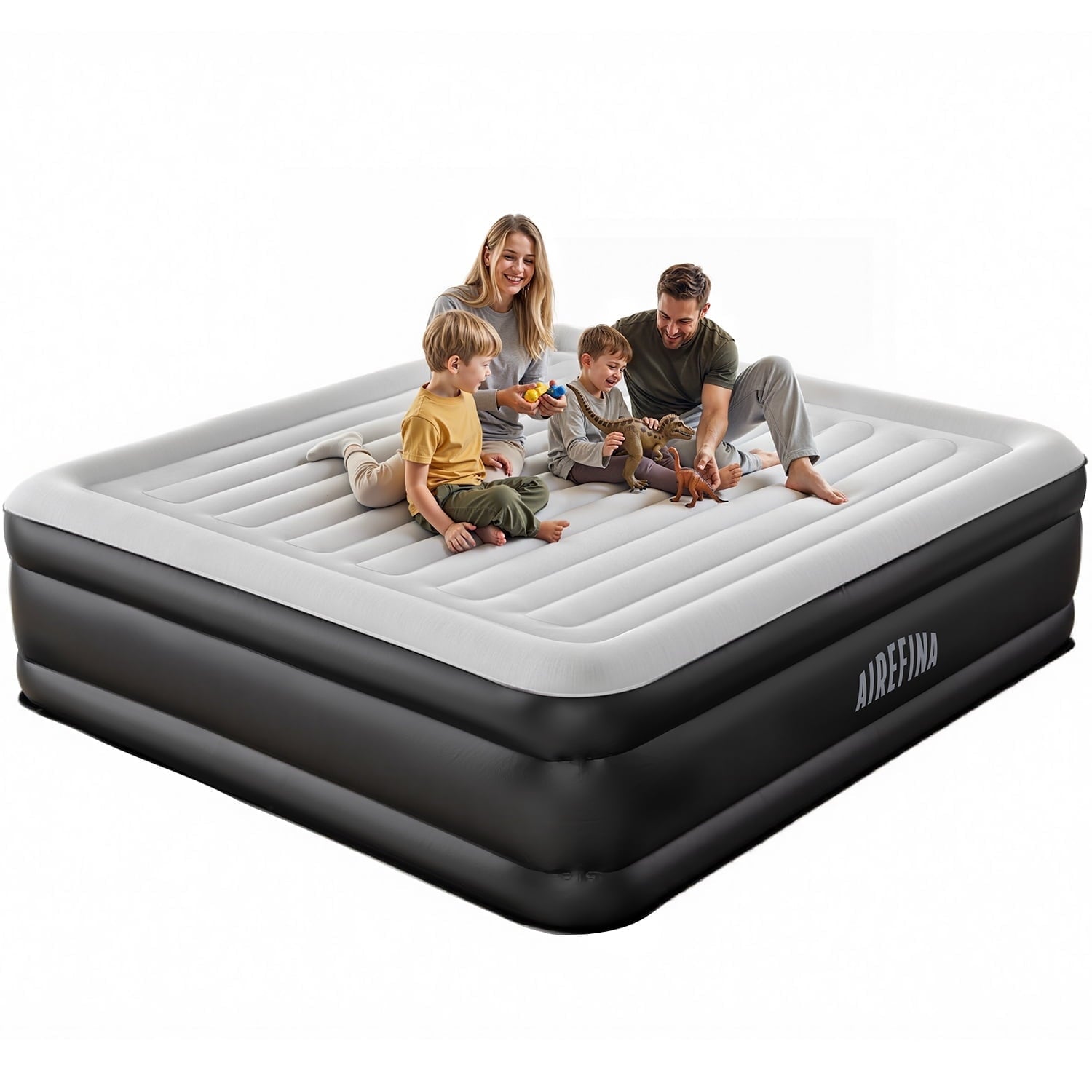Airefina Air Mattress is a luxury airbed you won’t want to miss. It’s designed with premier and advanced features that include an I-beam independent air column structure for uniform support and enhanced durability. The built-in electric pump “One-click” allows for fast and simple inflation/deflation in just 3 minutes. With the bed-like design of straight pulling straps and a maximum weight capacity of 320 kg/700 lbs, you’ll experience ultimate comfort and stability. This King size inflatable mattress with extra thick, waterproof top flocking ensures you and your family a comfortable sleep experience. This inflatable mattress is both lightweight and portable for easy storage and carry, making it perfect for use at home, outdoors as a camping mattress, or in your car. Get ready to enjoy a good night’s sleep with this premier King size air mattress from Airefina.