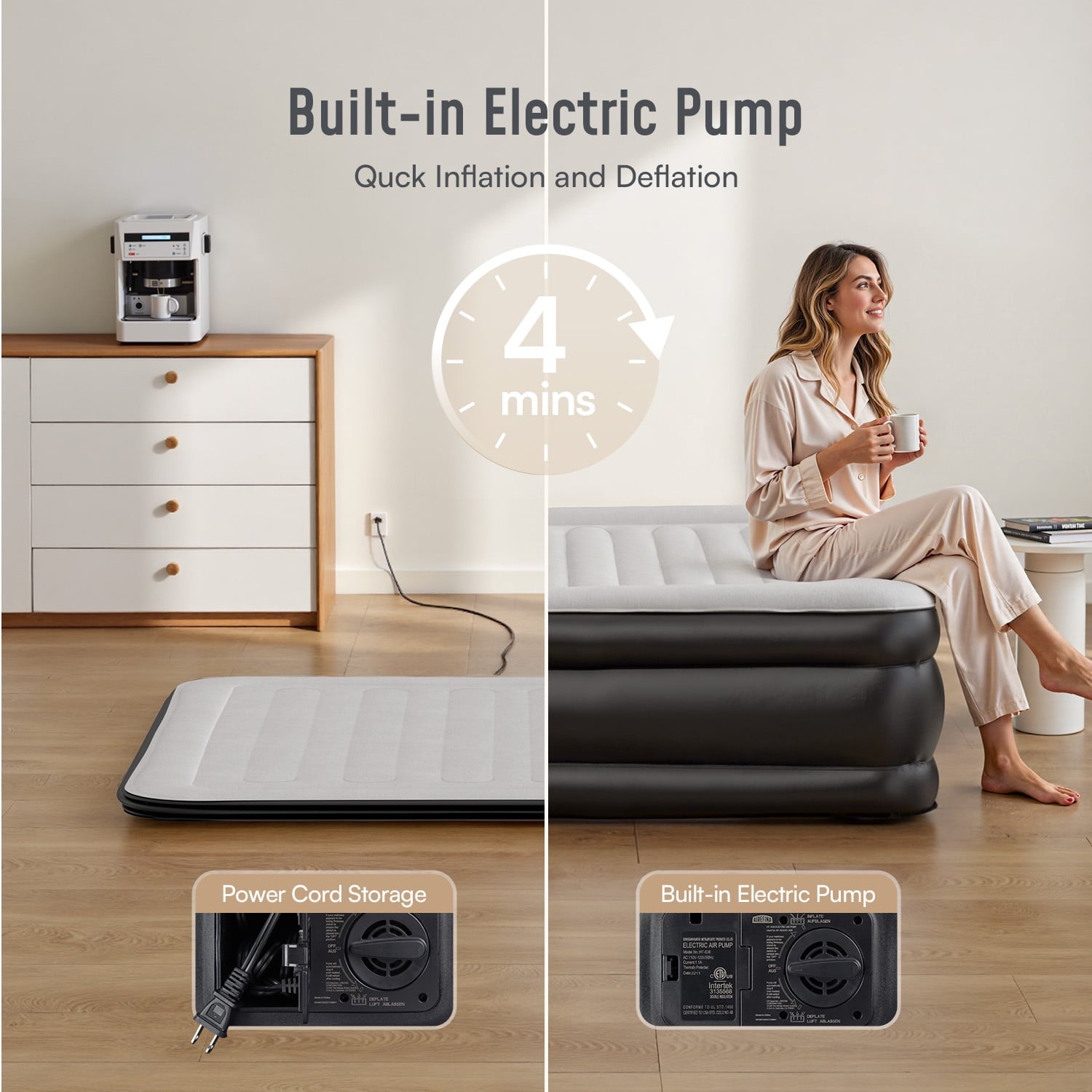 - Equipped with a powerful built-in electric pump and inflate/deflate knobs, this air mattress inflates to King size in just 3 minutes. Deflation is equally efficient, making setup and storage hassle-free.