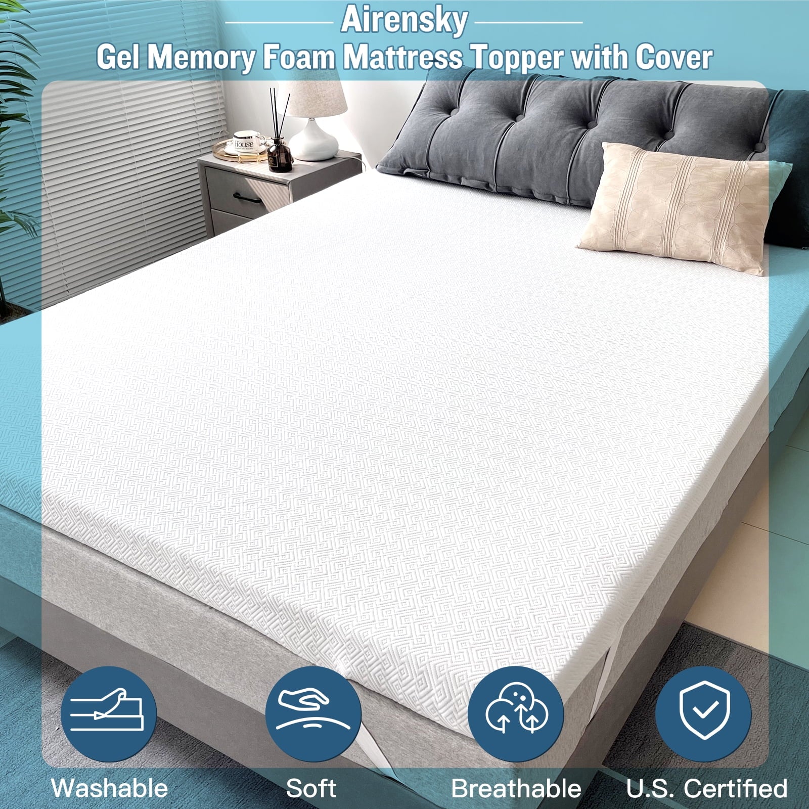 Airensky memory foam mattress topper cover is machine washable and wear-resistant, made with skin-friendly and breathable fiber, certificated OEKO-TEX, enjoy your sleep!