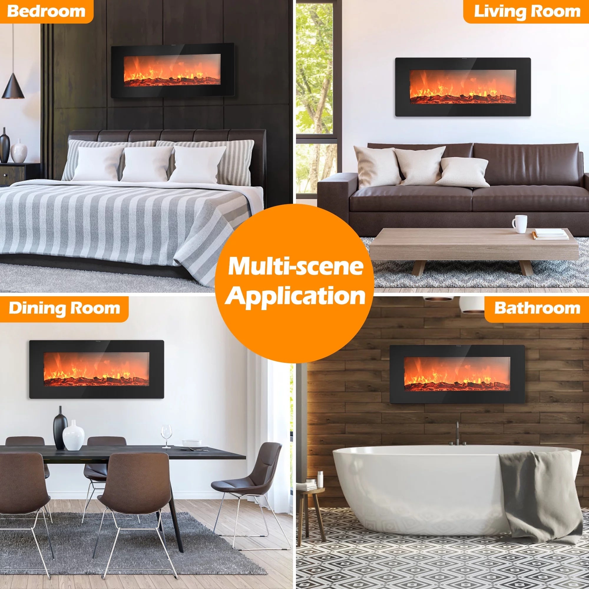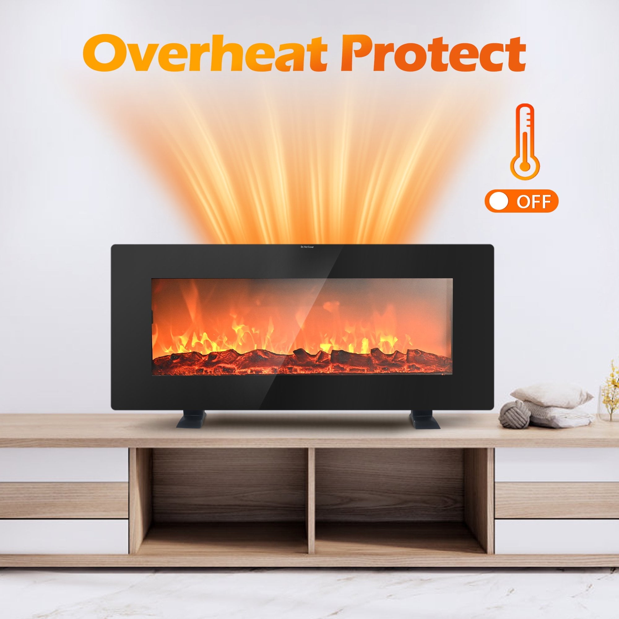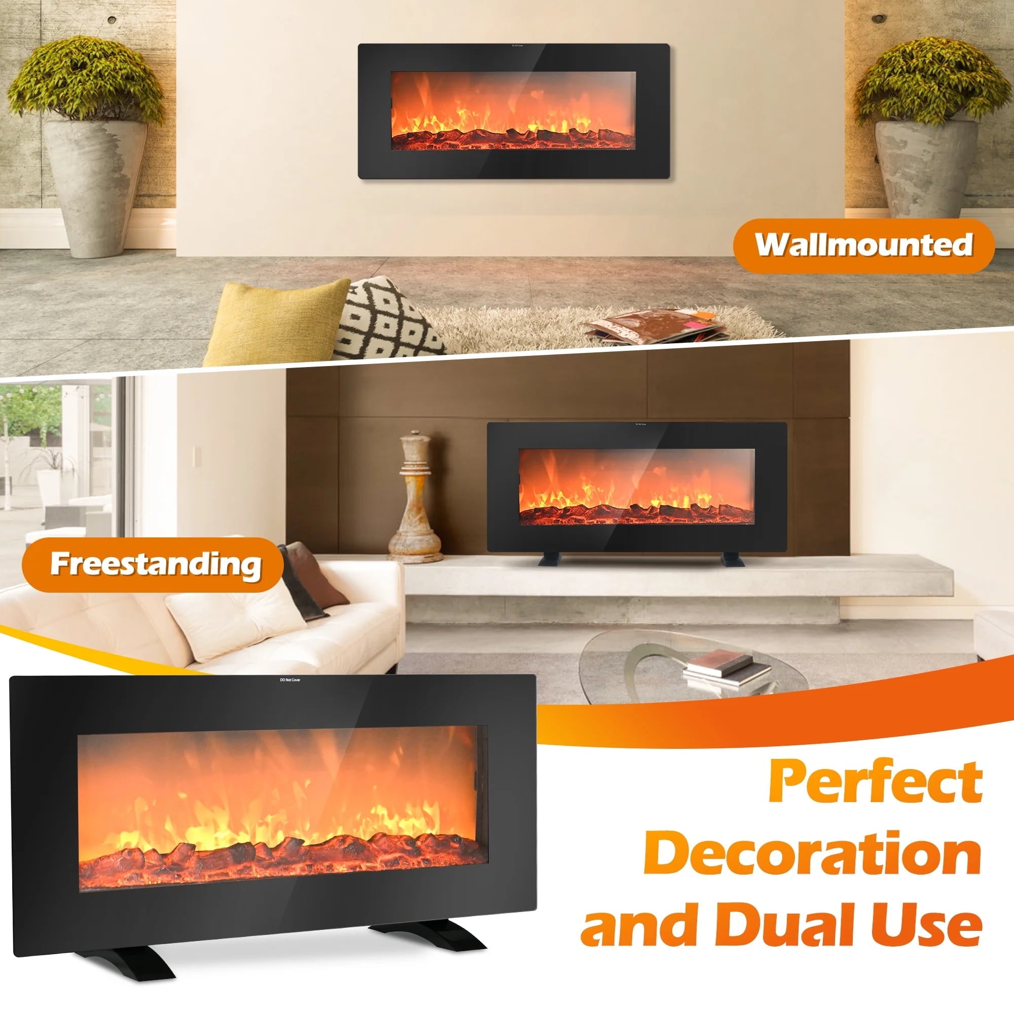 Combine with attractiveness and practicality, this 36 inch electric fireplace will enlighten your home. There are two install ways, wall mounted or freestanding, and both are space-saving and simple to install with thinner thickness. This electric fireplace comes with 2 heating settings–low temperature of 750 W and high temperature of 1500 W. More, this electric fireplace heater simulates real flame with 5 flame brightness settings ranging from dim glow to full glow, allowing you to adjust the flame to the brightness you want. The addition of remote control with the panel gives the comfort of operating and changing the settings of the heater from our couch or bed. More importantly, ETL certification and overheat protection ensure safety. This elegant black glass fireplace with 7.5-hours timer adds a modern touch and an ideal touch to your home.