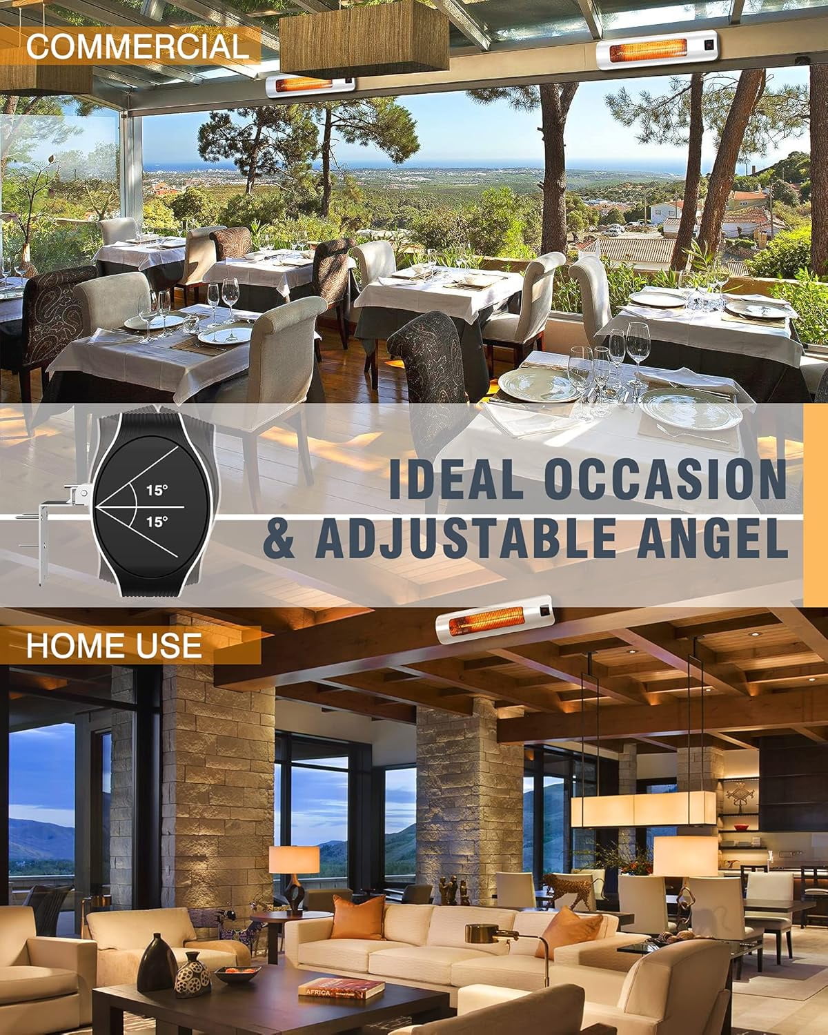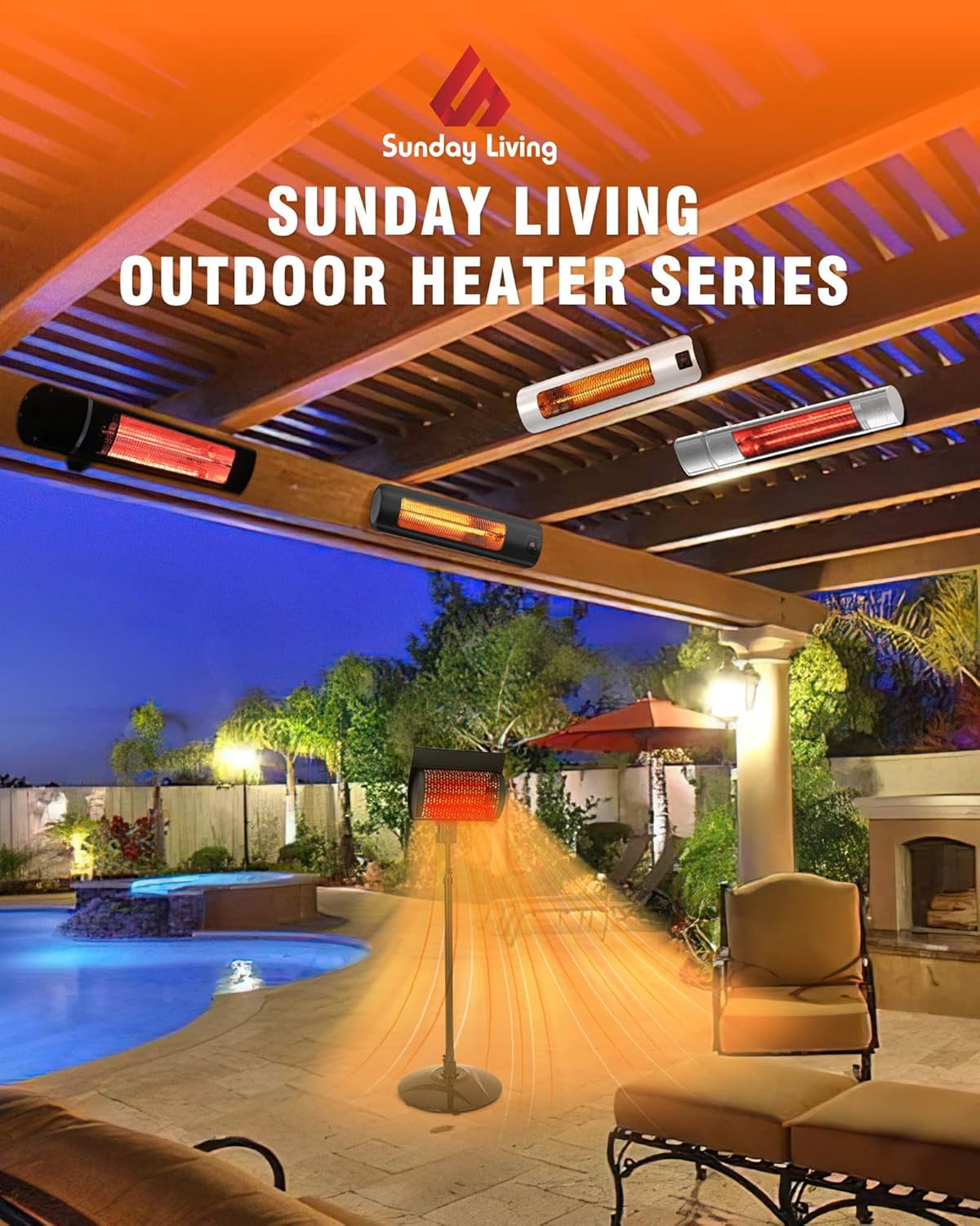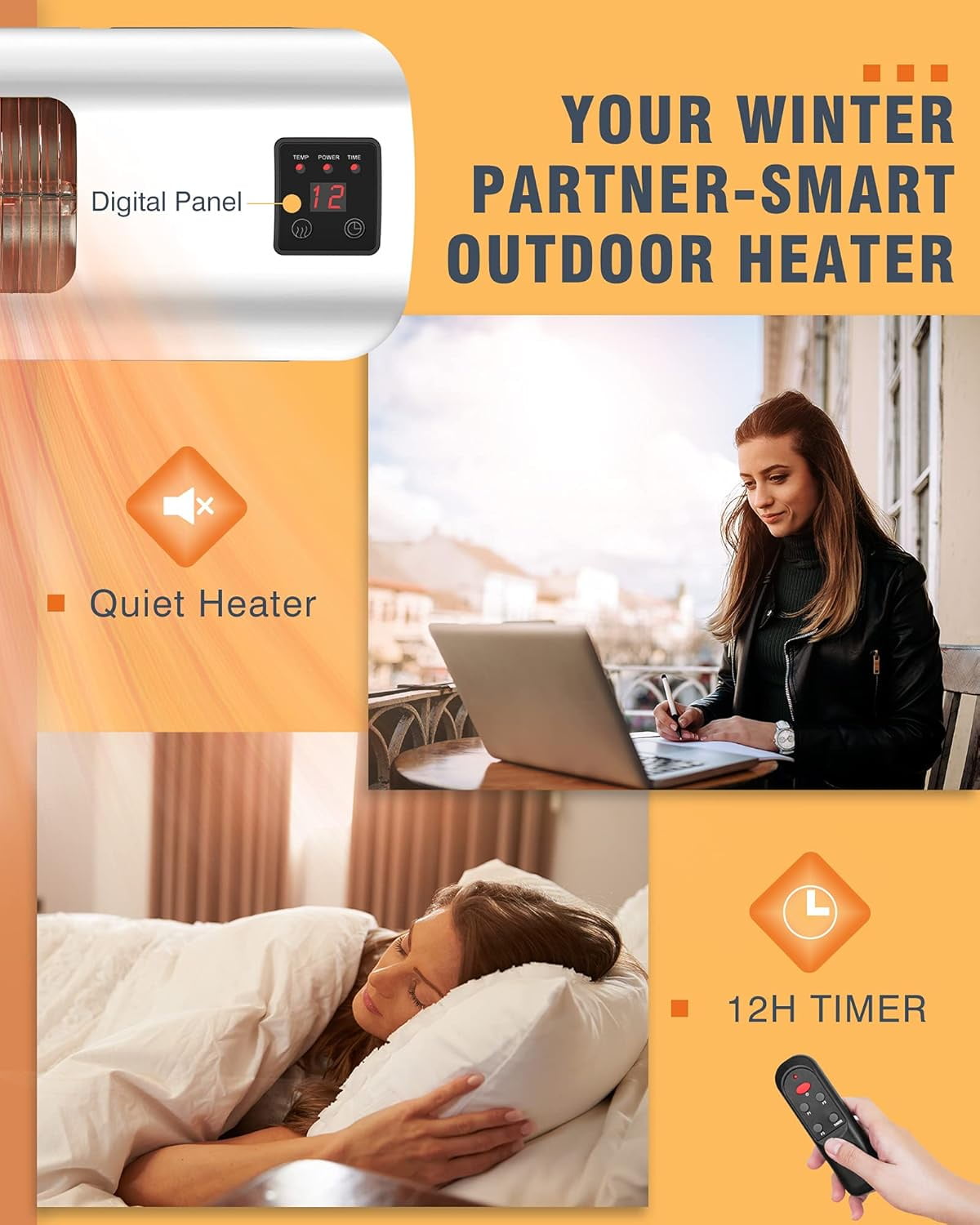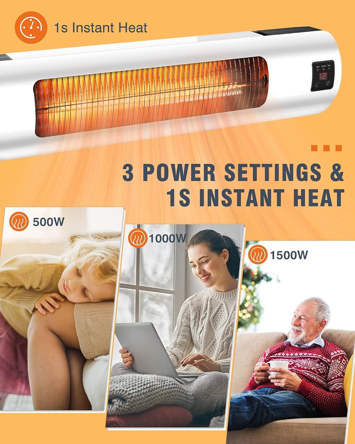 - Powerful 1500W Infrared Heating: Quickly warms outdoor spaces like courtyards, porches, and garages