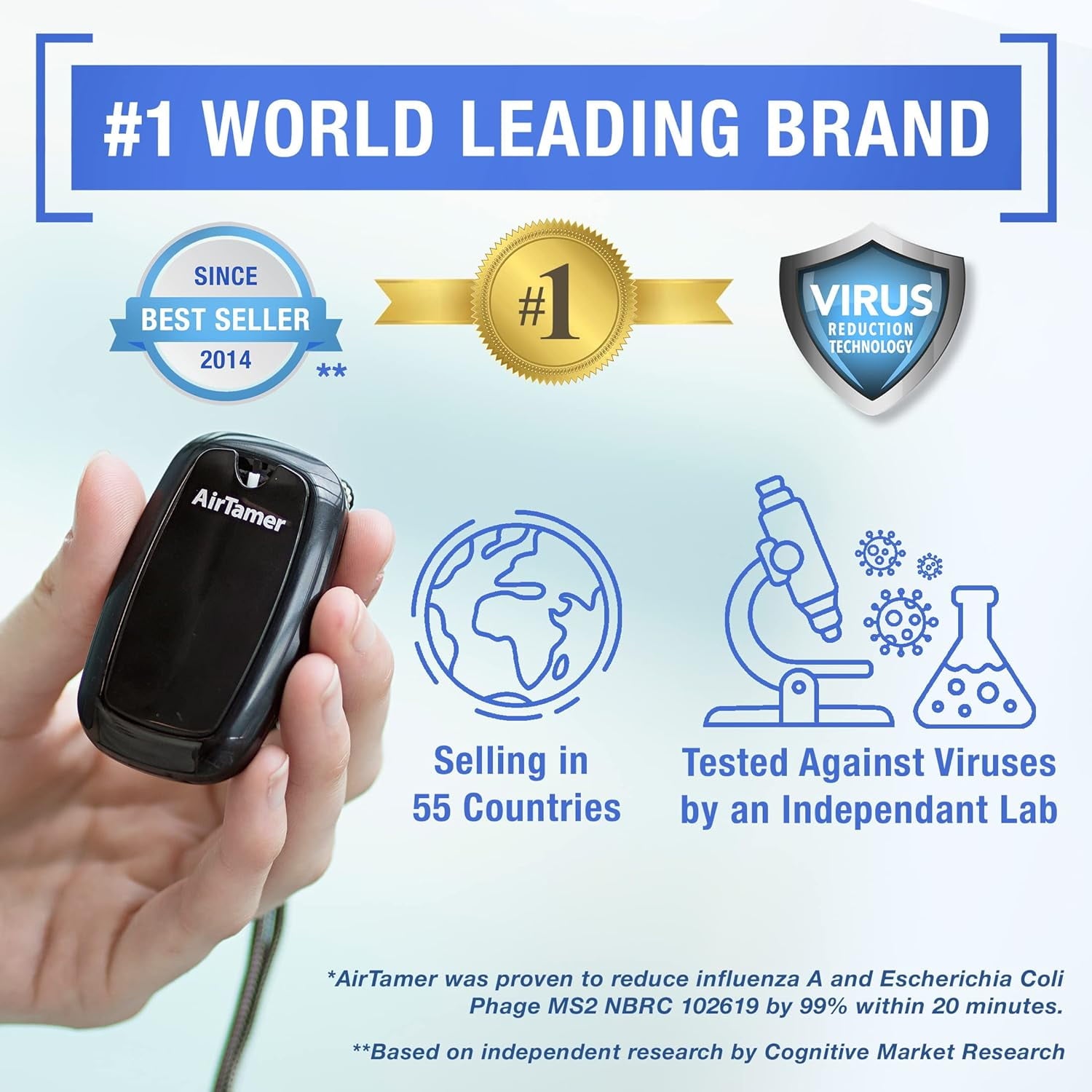 - GREAT FOR TRAVEL: The AirTamer A315 is the perfect travel accessory for those who love to explore without exposure to unsanitary air; The A315’s SMALL POWERFUL design includes a built-in pocket clip and patented conductive REPLACEABLE lanyard which is adjustable and features a break-away connector for extra safety; Wear it around your neck or clip it on your jacket and have a sphere of breathable clean air anywhere you go