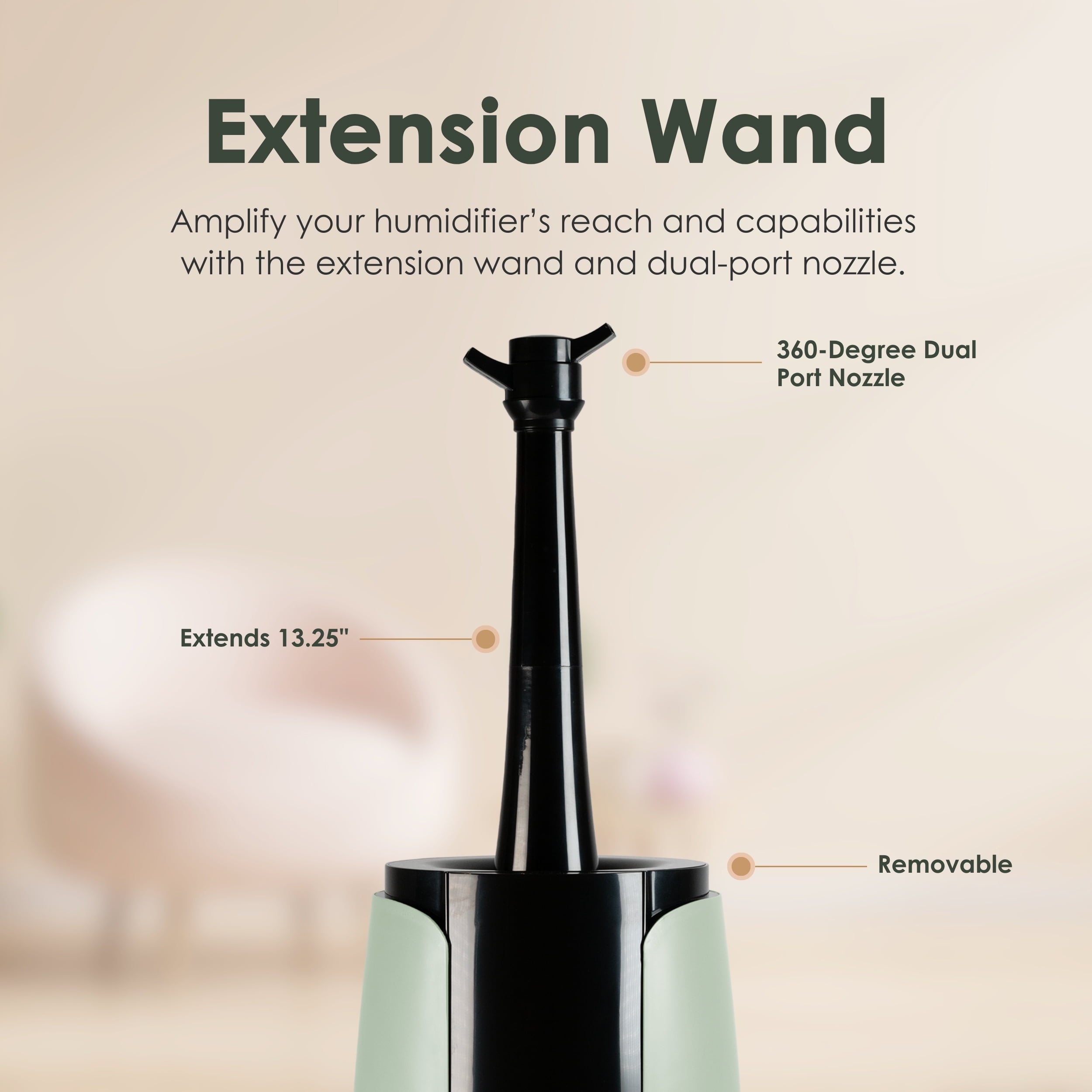 - Extension Wand: Amplify your humidifier’s coverage and capabilities with the extension wand and dual-port nozzle designed to deliver wider, more even mist distribution.