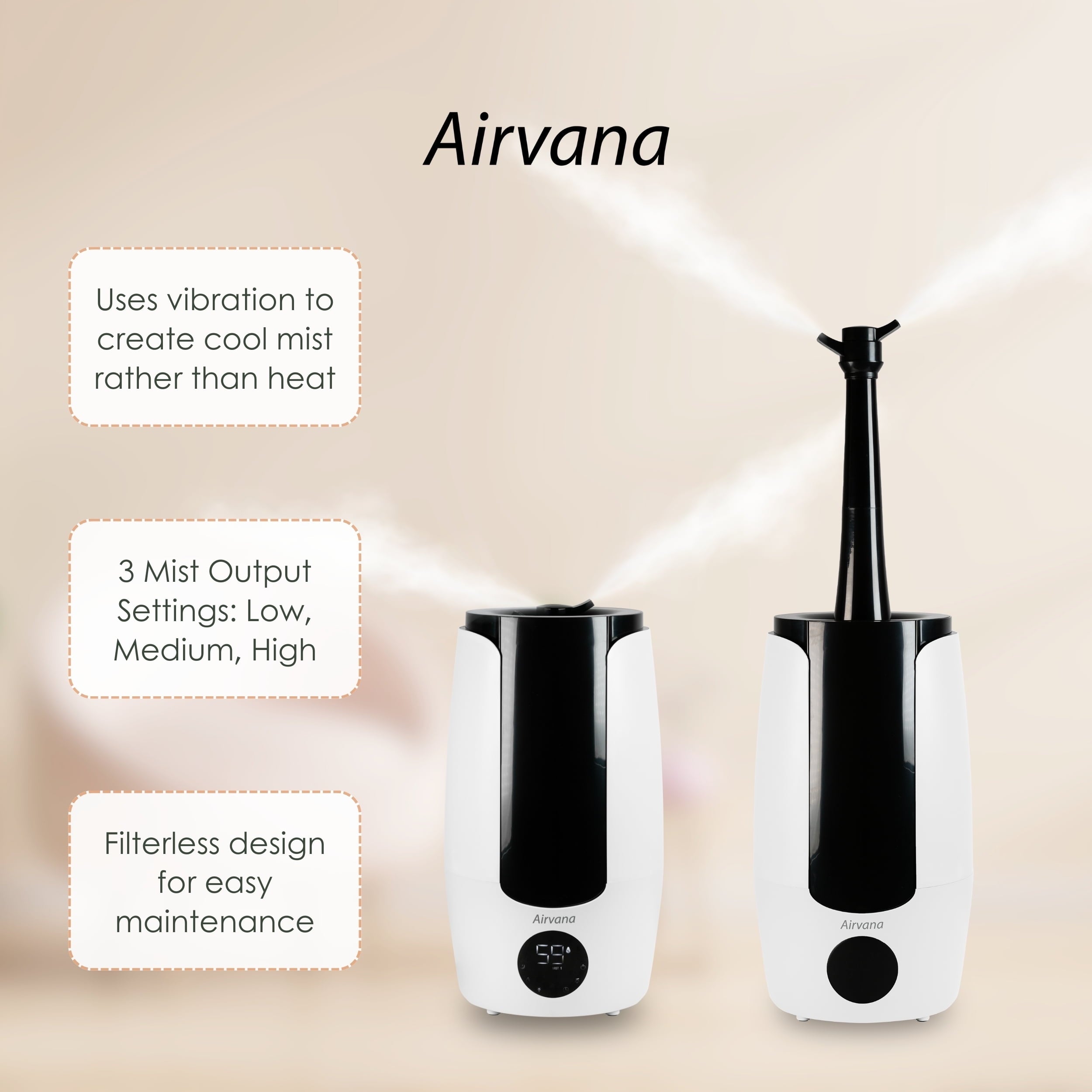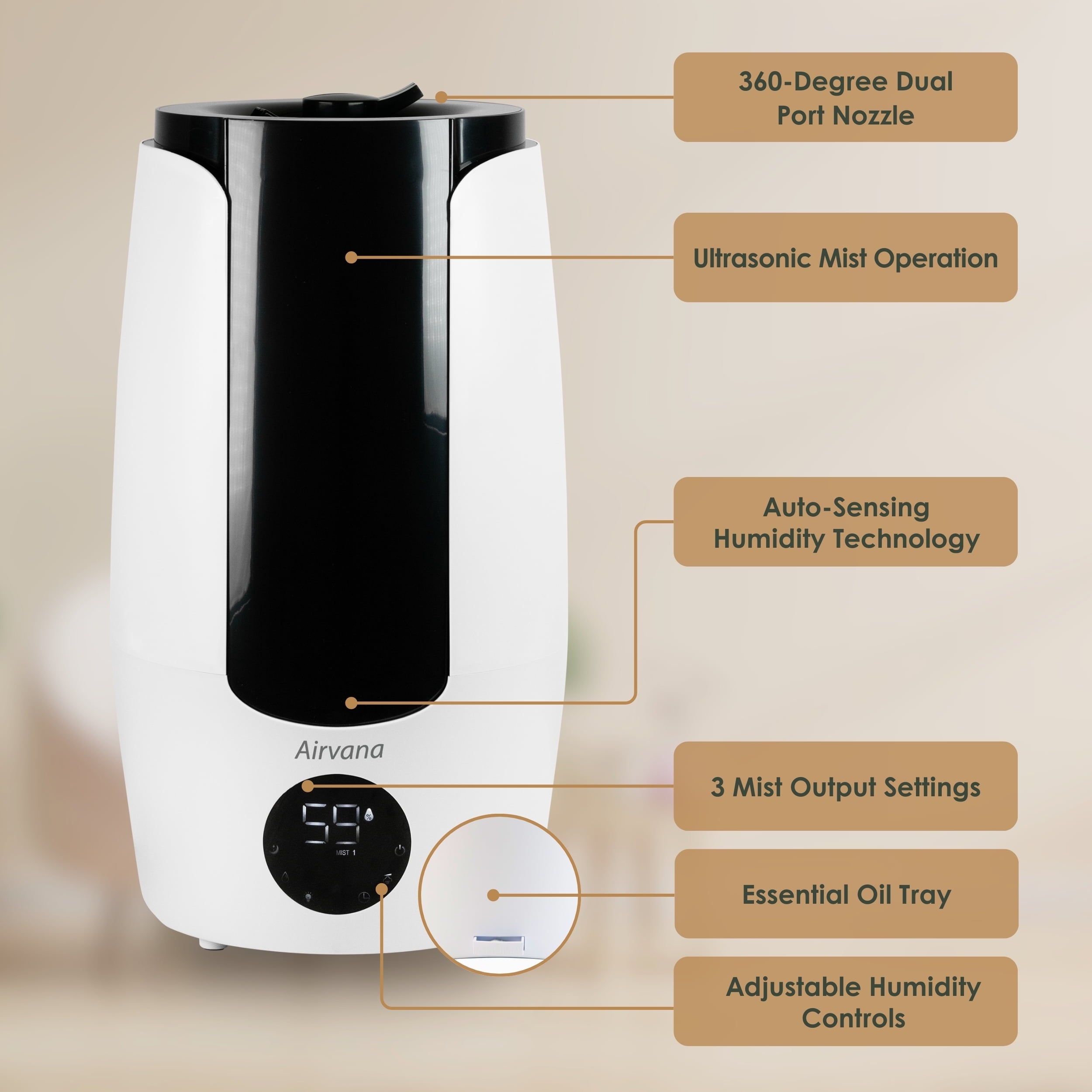 - Customizable Settings – With an LED display screen, easily control the Airvana humidifier with different settings including sleep mode, humidity level settings, and a timer for 1-12 hours