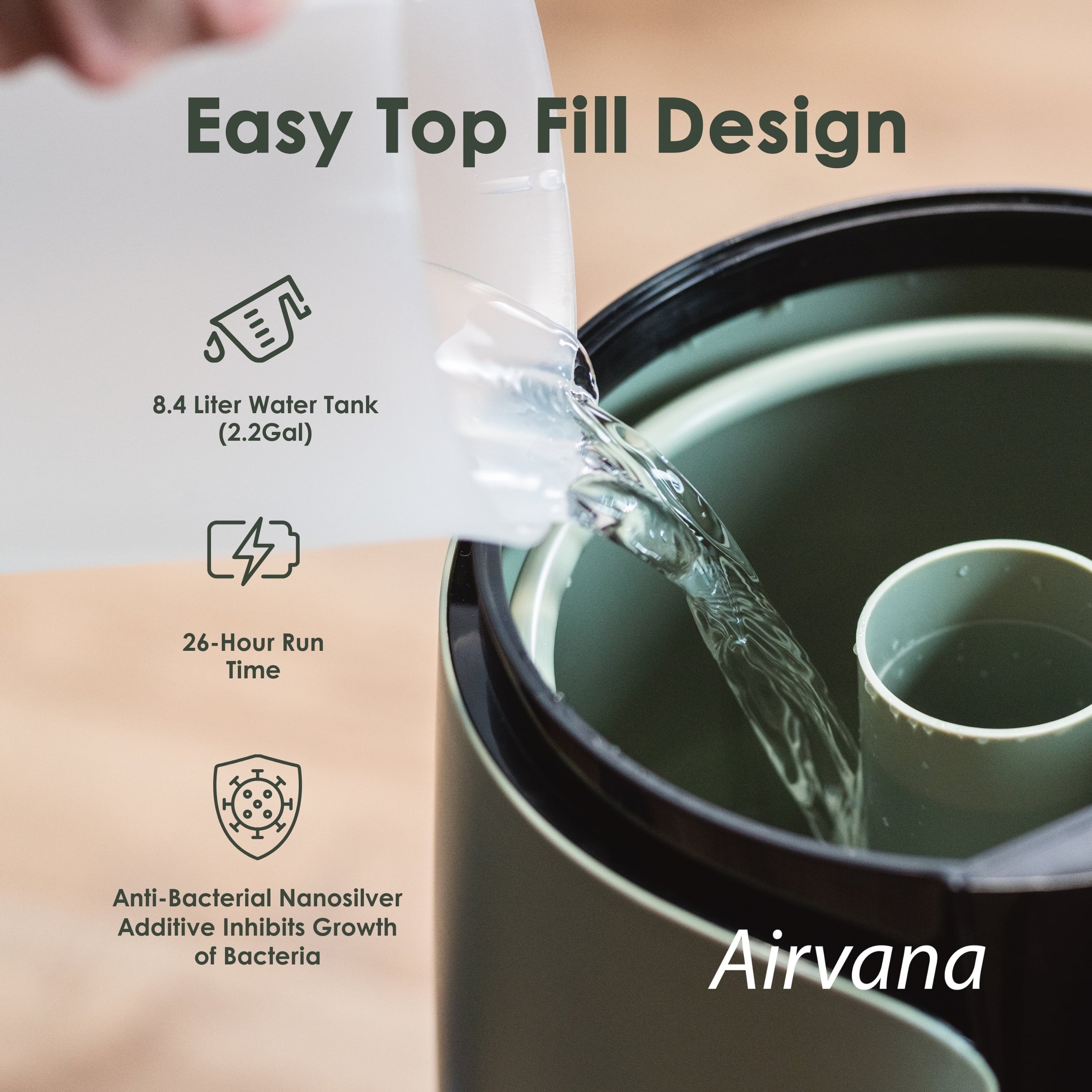 At Airvana, we believe that a healthy lifestyle begins with the environment you create at home. This is why we designed the 2.25 Gallon (8.5 Liter) Digital Top-Fill Humidifier so you can enjoy the peace of mind about not worrying about indoor dry air and with the. Designed to enhance your home or office environment, this powerful humidifier offers intuitive to use controls, and thoughtful design elements that make it a great addition for any large space. Whether you’re battling seasonal dryness, improving air quality, or simply creating a more relaxing atmosphere, Airvana delivers reliable performance and peace of mind. Enjoy effortless refills and fewer interruptions with Airvana’s top-fill humidifier design and large 2.25-gallon (8.5-liter) tank. You can easily pour water into the large tank opening or use the tank’s convenient built-in handle to carry the tank and fill it. With the large tank size, you can enjoy up to 52 hours of mist making this humidifier for large rooms perfect for overnight use or all-day operation in busy homes and offices. Elevate your home or office experience with the included aroma tray that will help create a spa-like experince at home. Effortless control of your indoor comfort with Airvana’s LED display, offering quick access to multiple settings including sleep mode, and a adjustable humidity levels. With programmable 1–12-hour timer, you can determined how long your want your humidifier to run, once the time has completed, the unit will shut off. For even greater performance, the included extension wand with dual-port nozzle extends that helps deliver a wider, more even mist distribution in your home or office. Whether you’re creating a restful environment or want to have ideal humidity throughout the day, Airvana adapts to your needs with precision.
