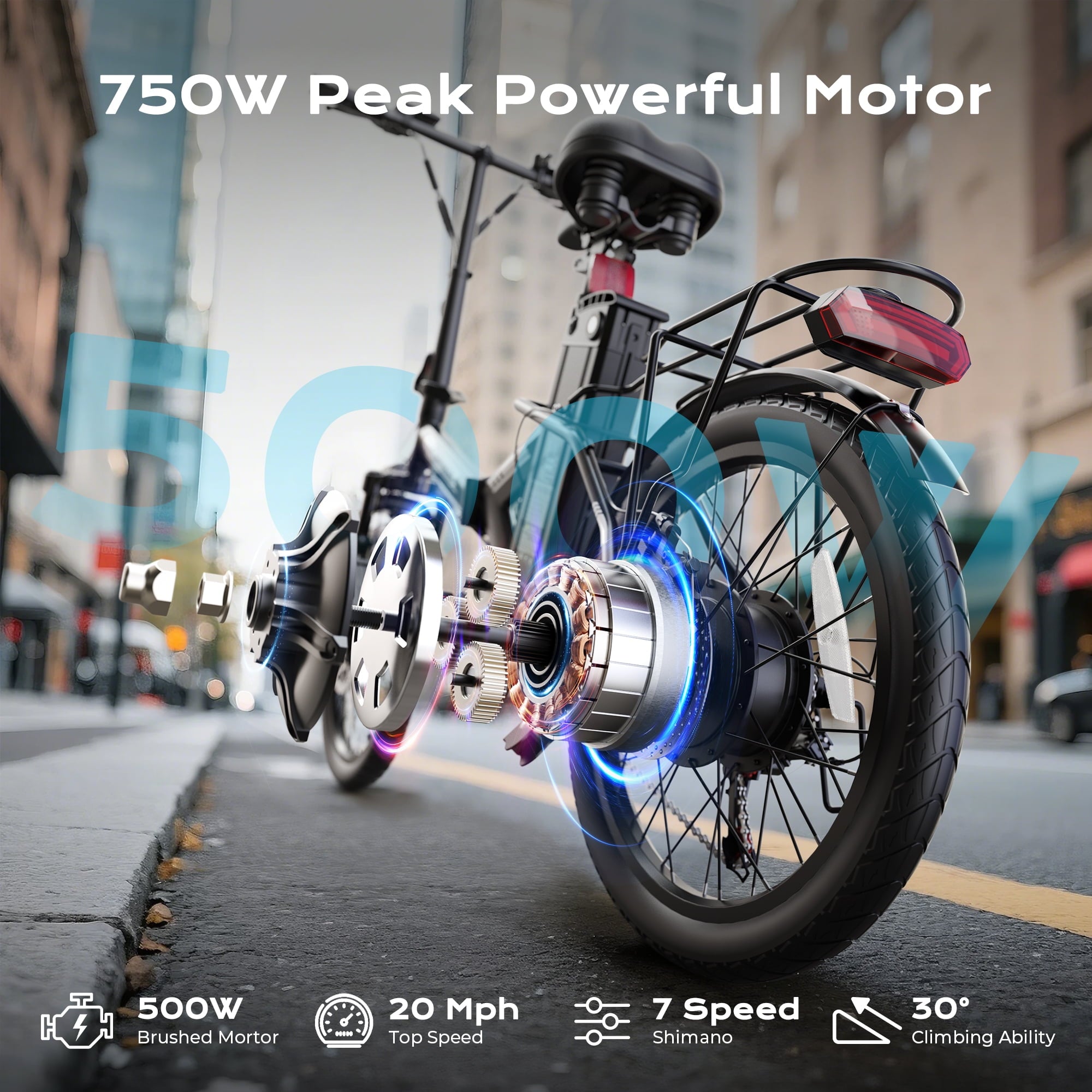 With its powerful 500W motor (750W peak), you’ll climb hills and cruise at speeds up to